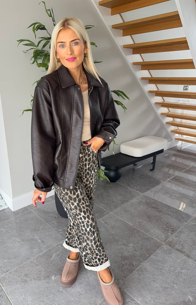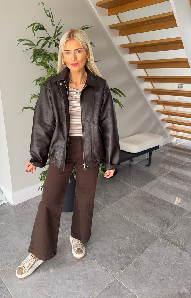 Long sleeve, relaxed/oversized, faux leather style jacket. Dark chocolate brown shade. Side pockets.