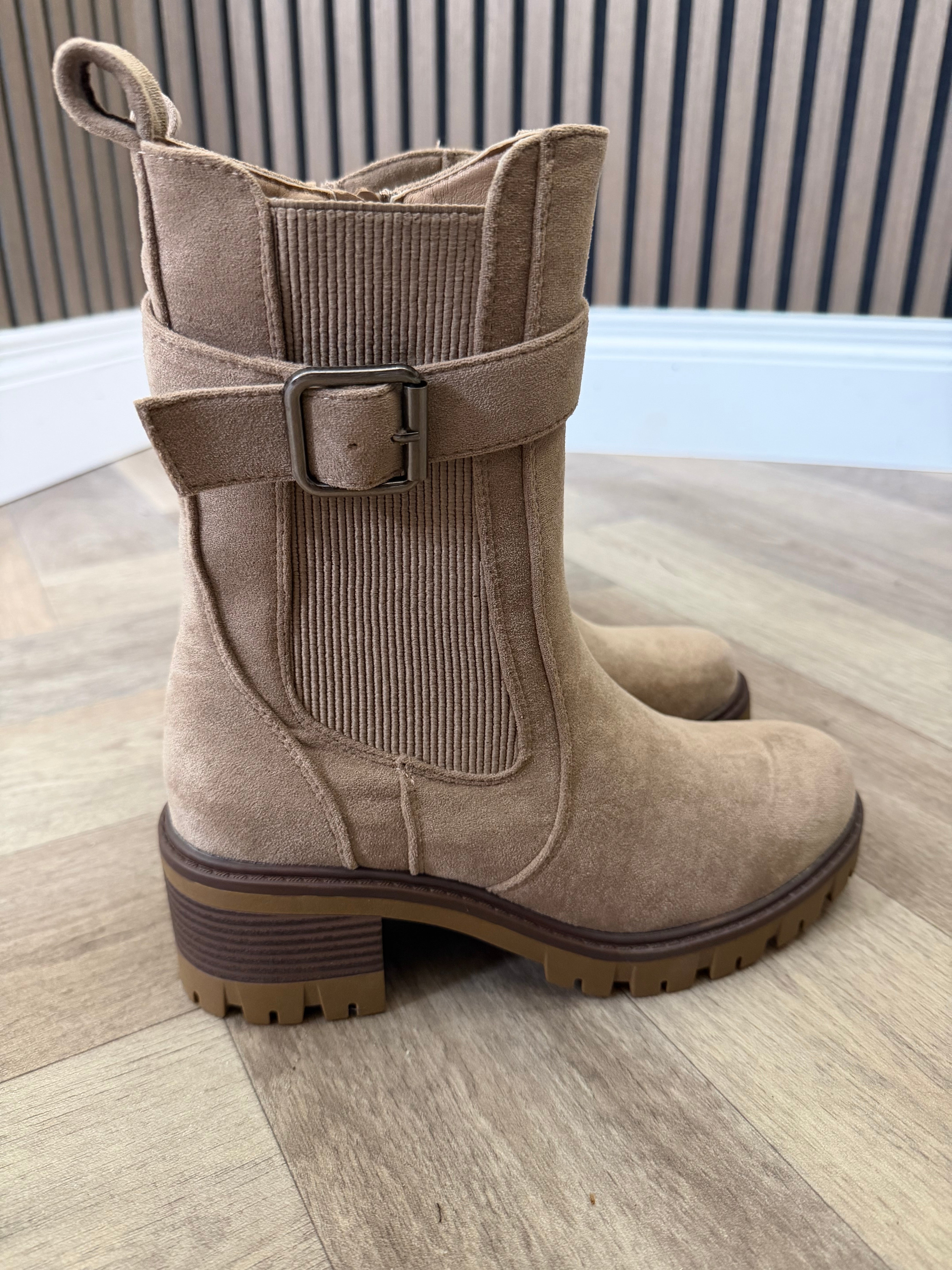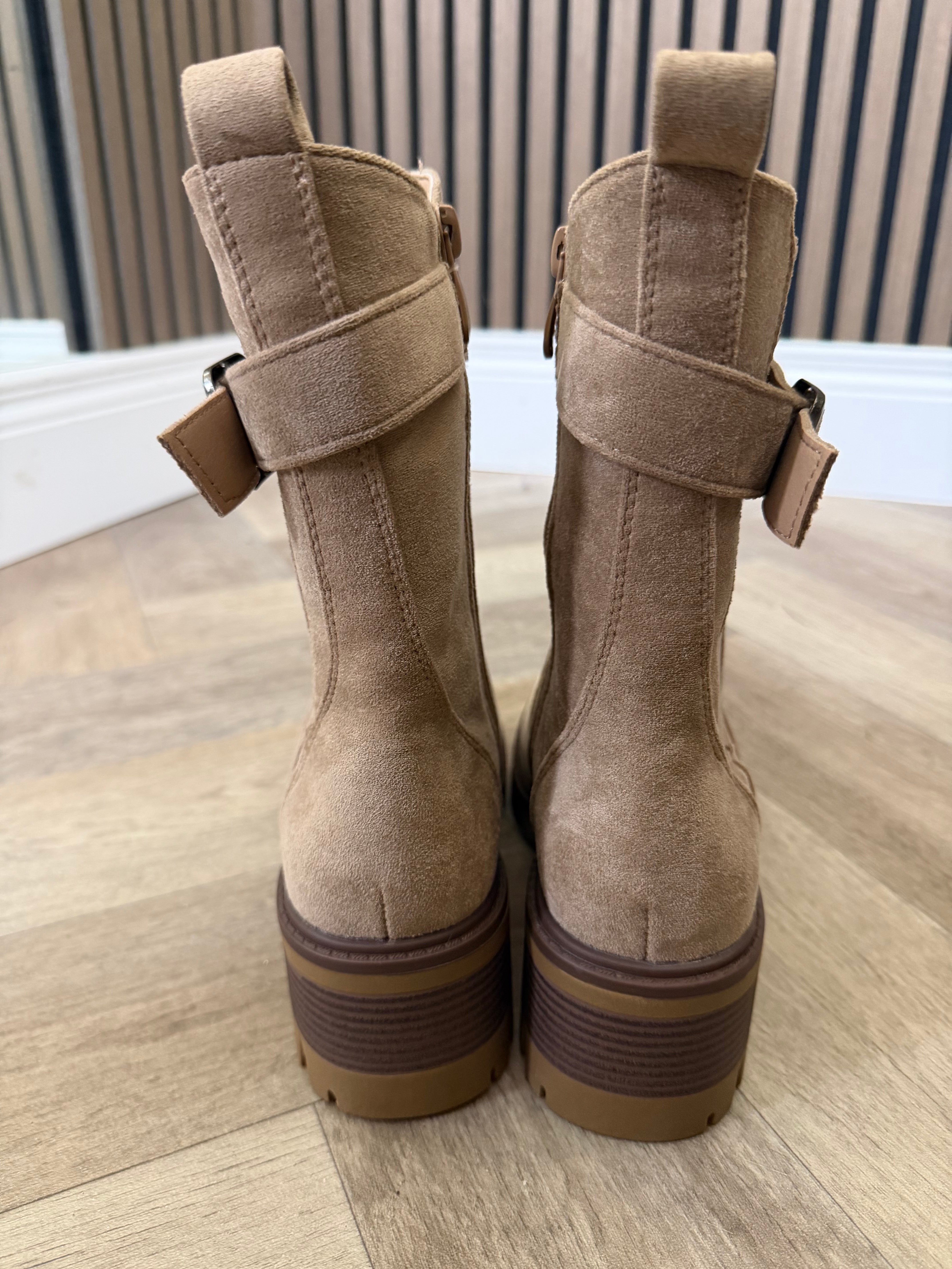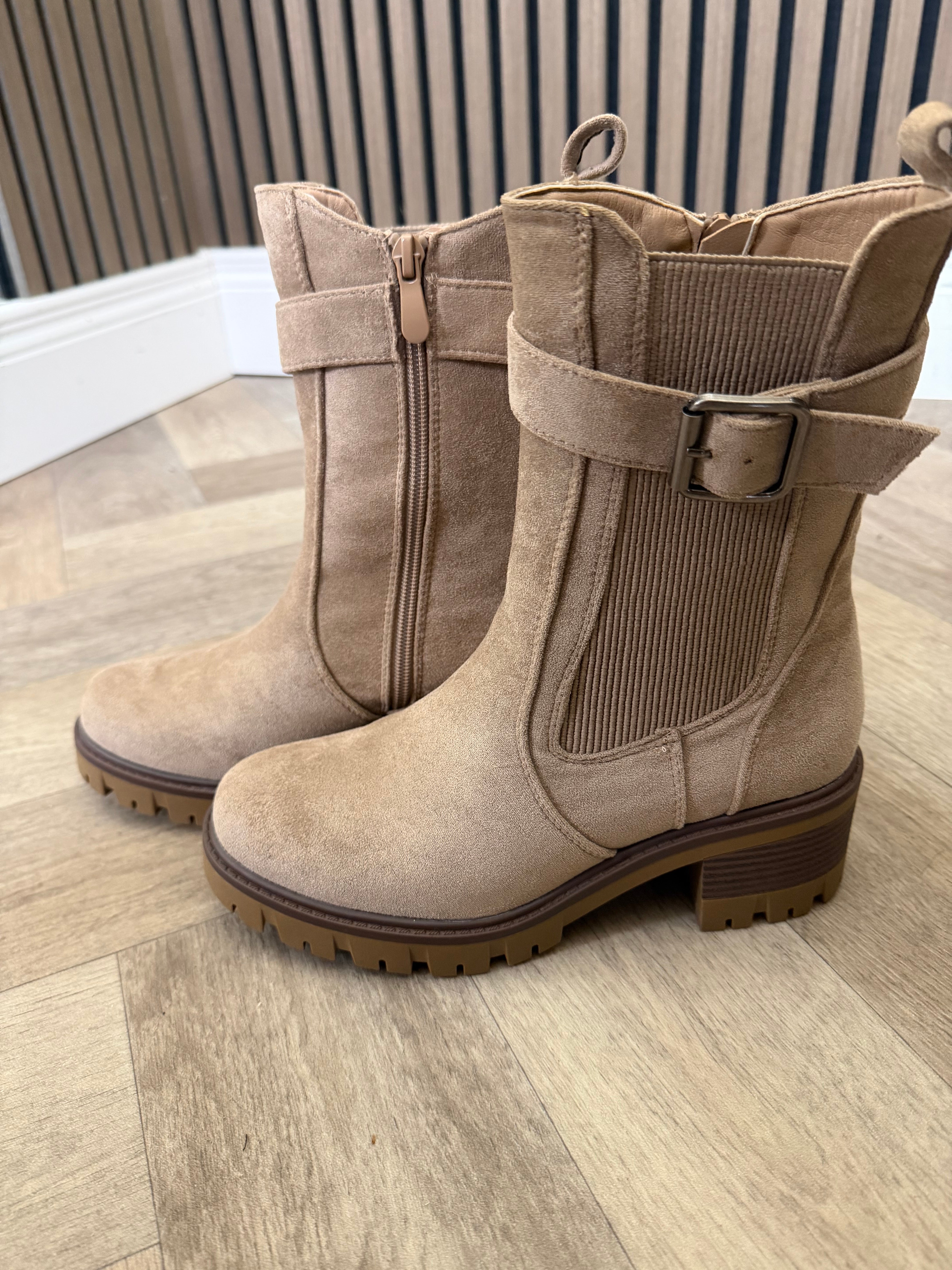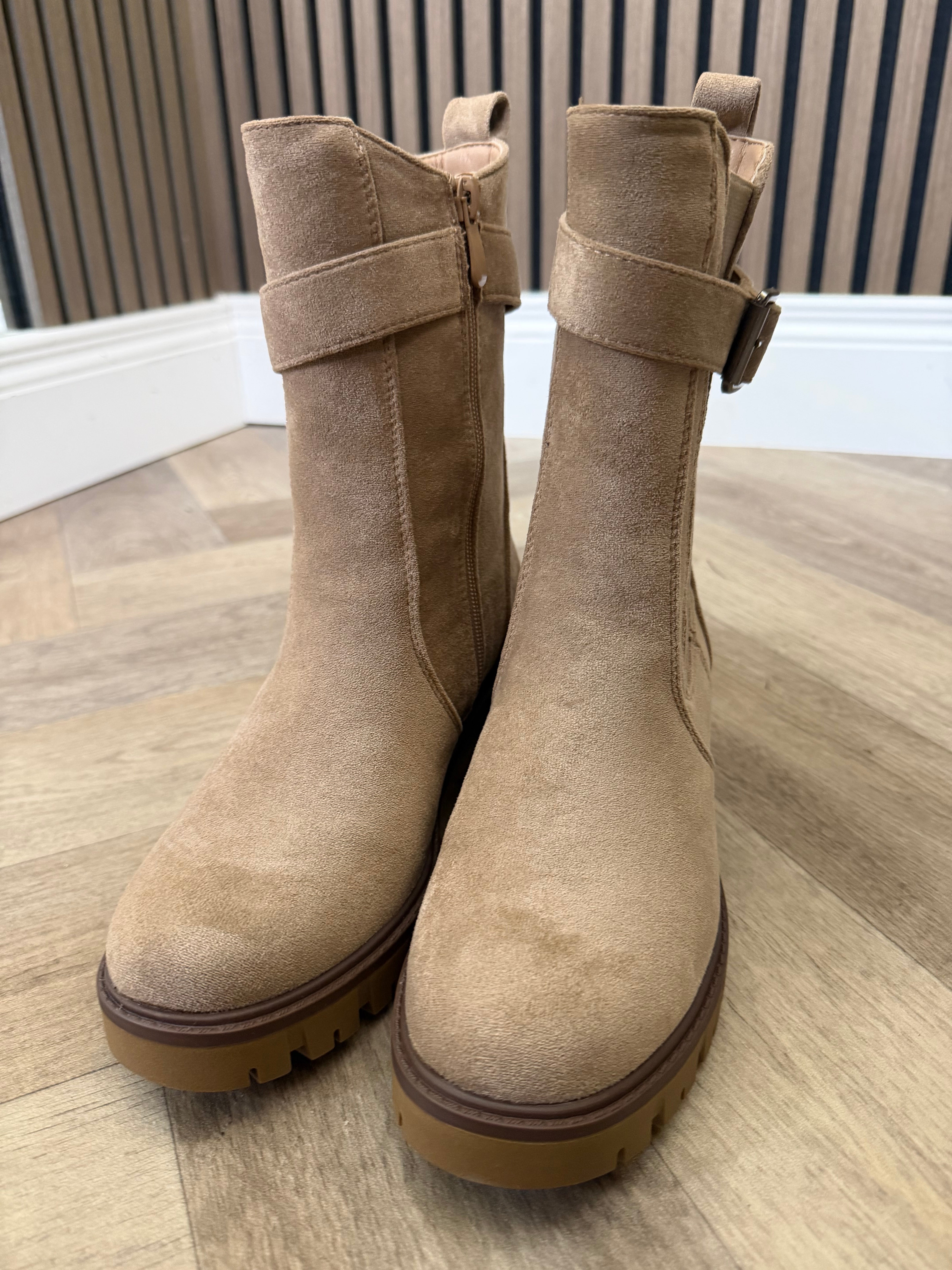 Chunky biker style boots. Small buckle detailing. Beige suede fabric.