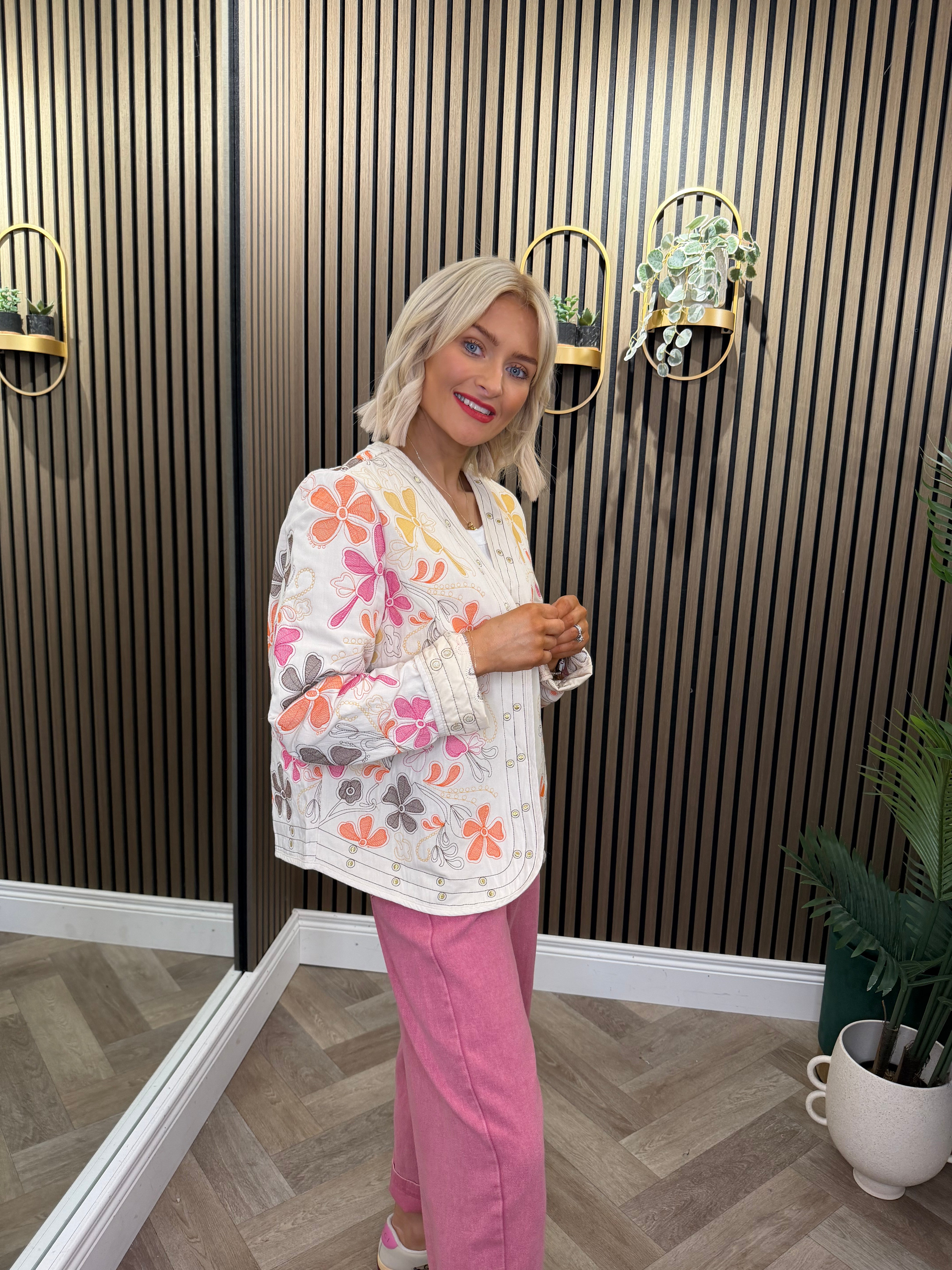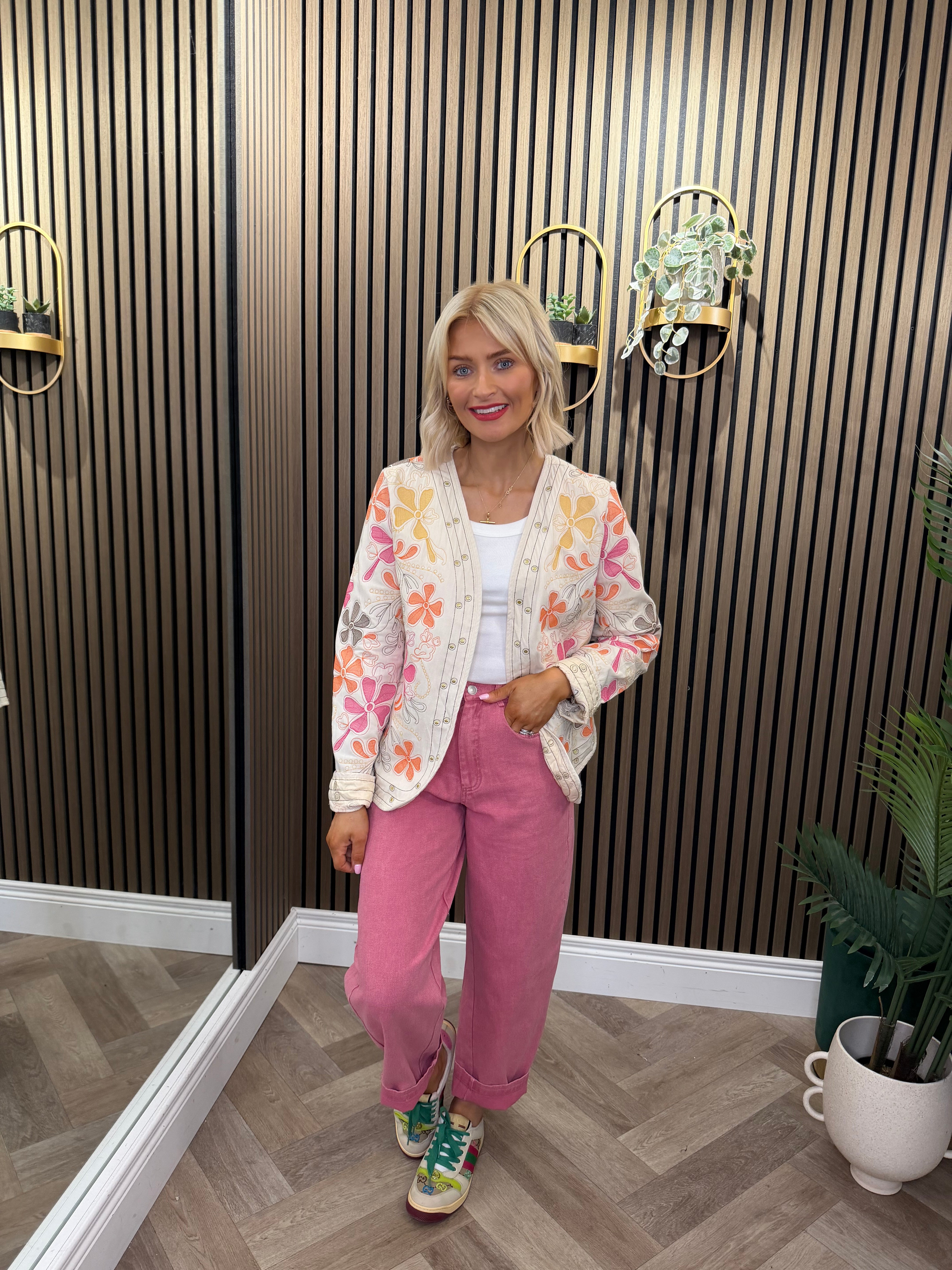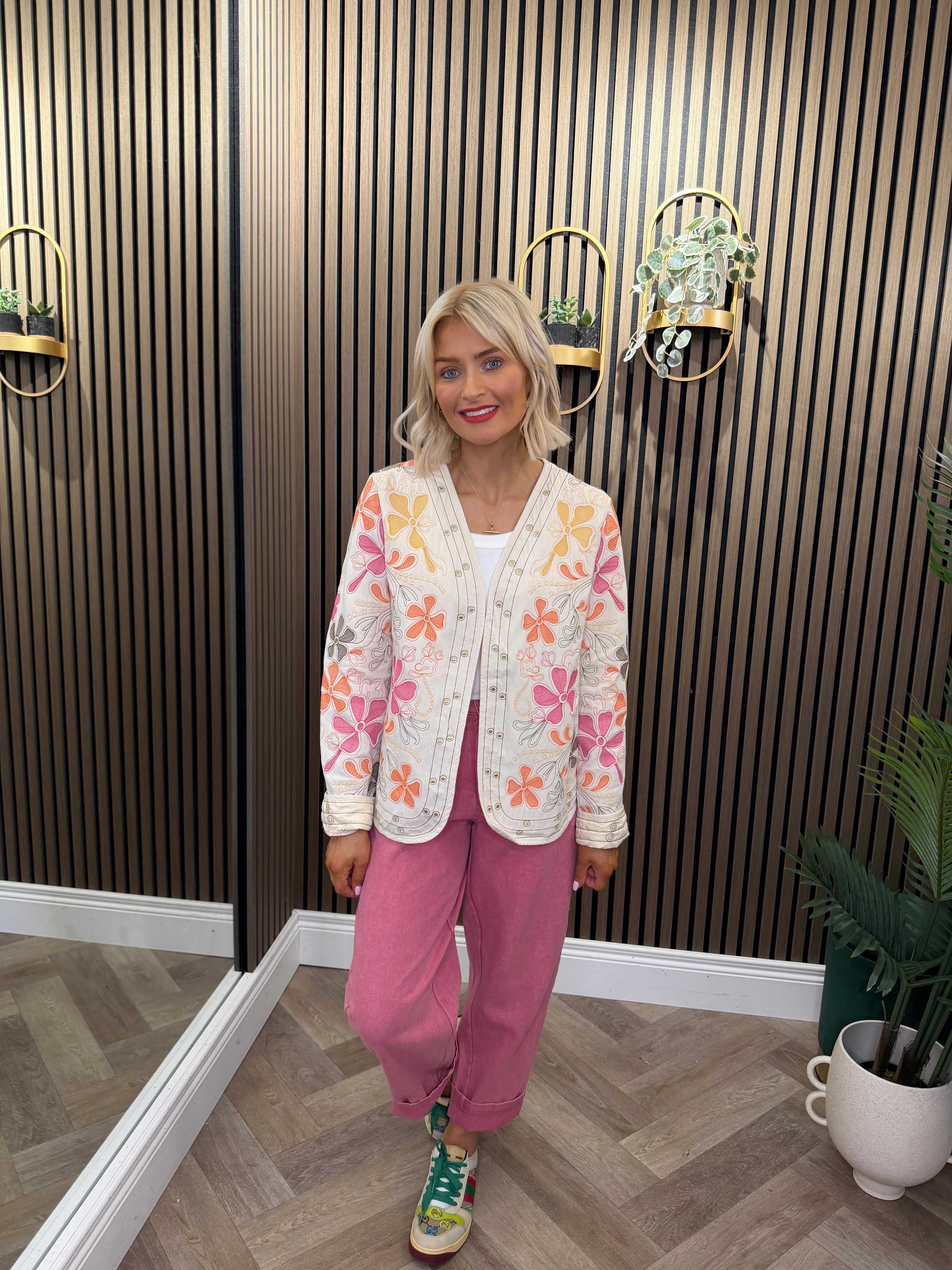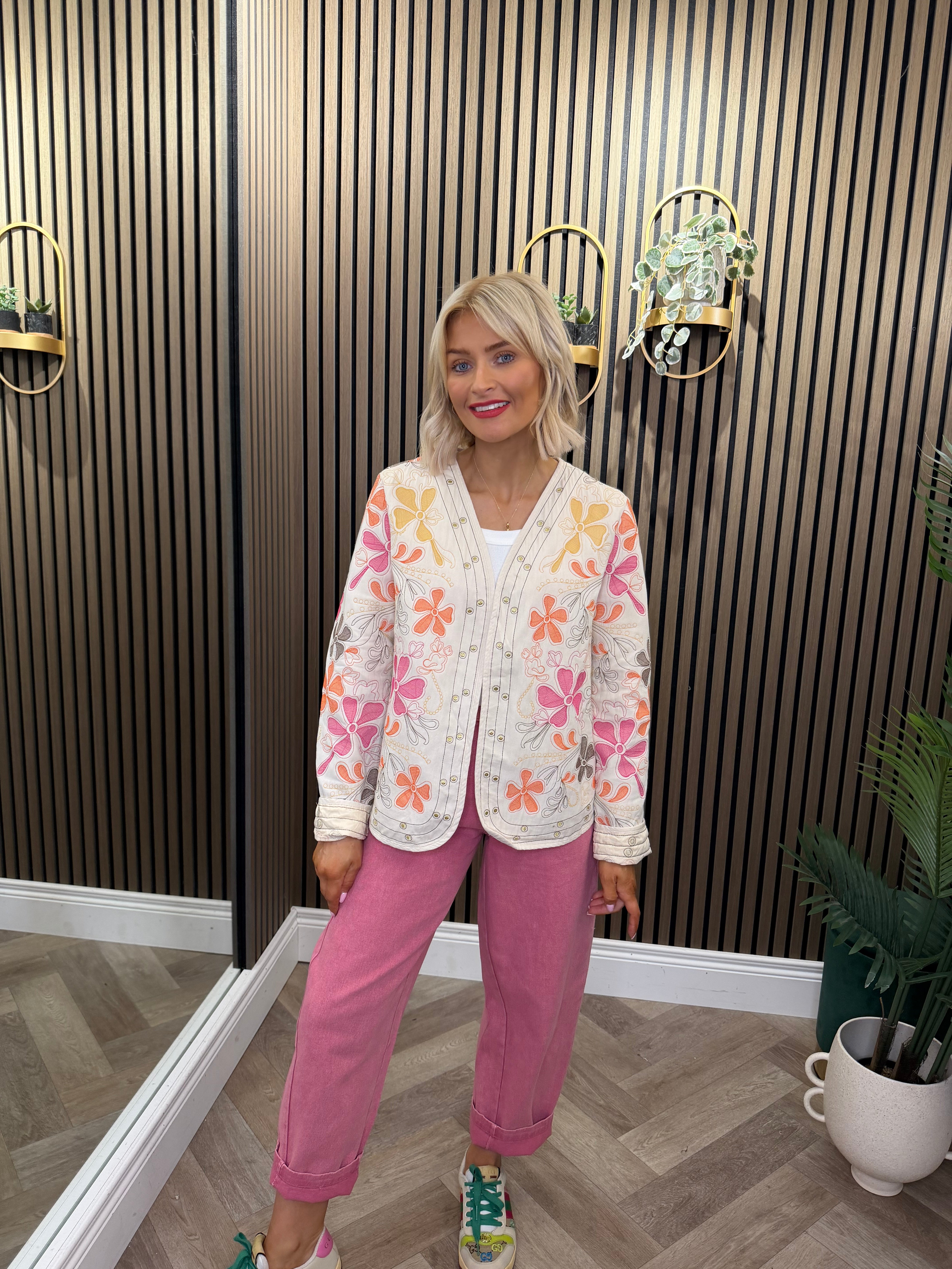 Long sleeve, relaxed style jacket. Flower embroidery detailing. Available in more colours.