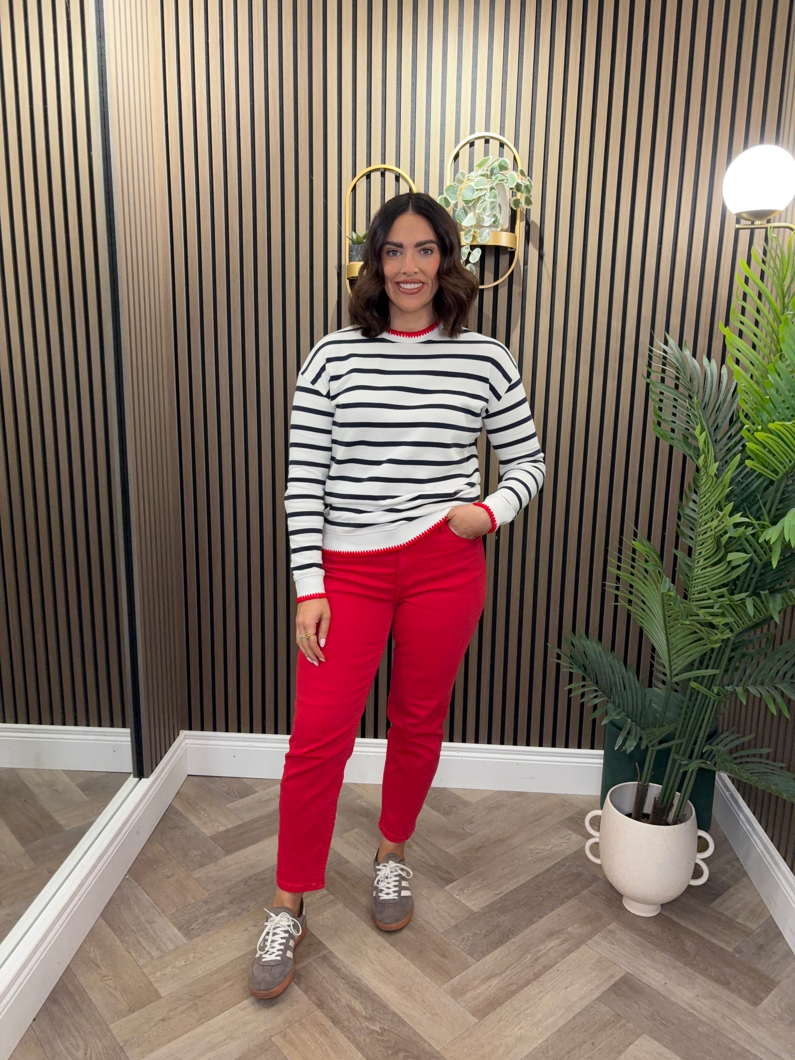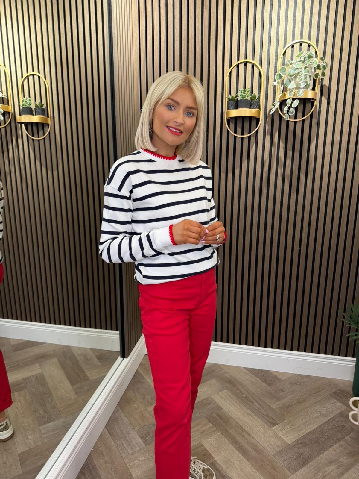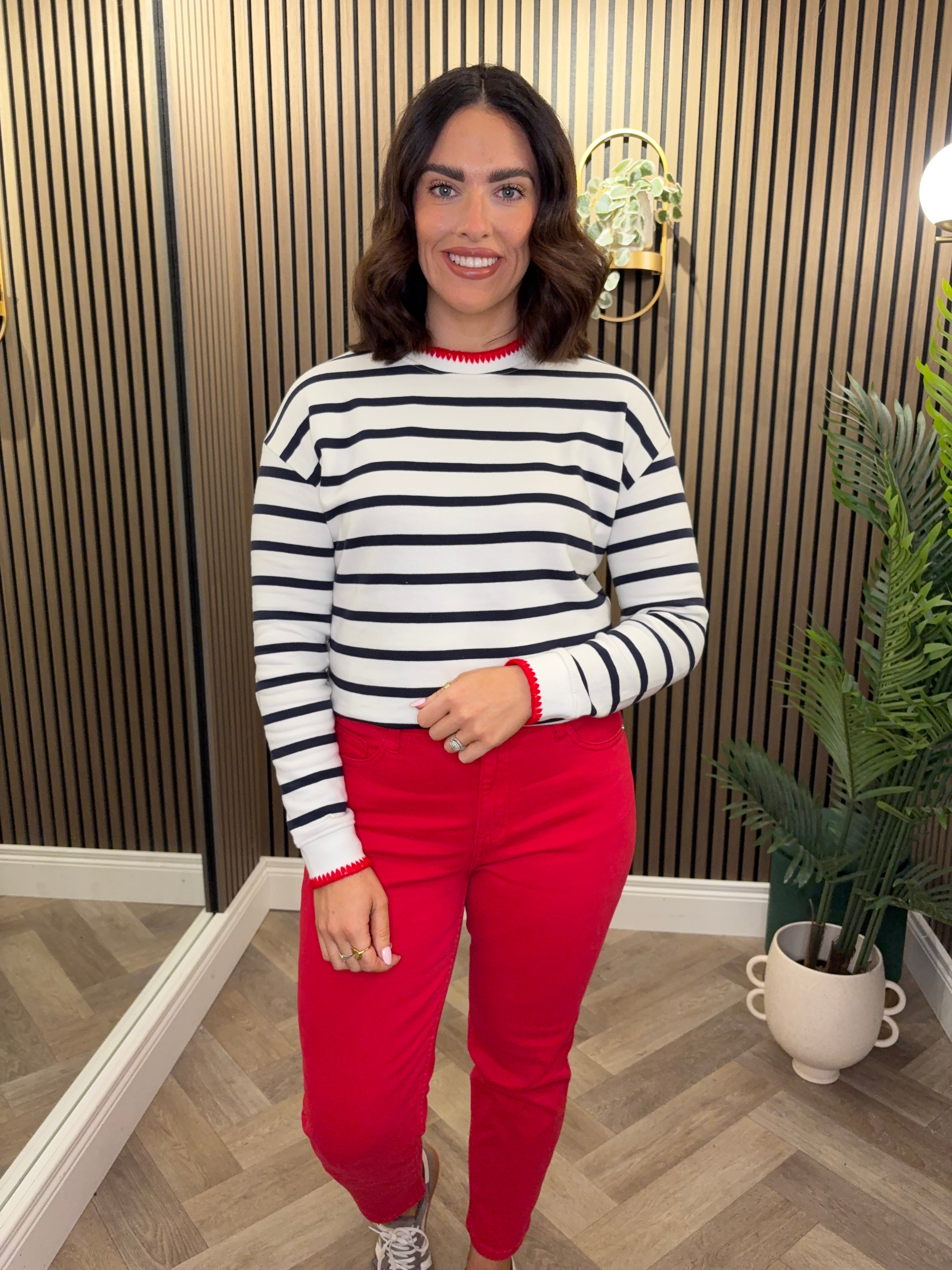 The Noah Sweatshirt offers effortless style and cosy comfort in one. This crew neck sweatshirt is crafted in a semi-relaxed fit with a super-soft brushed interior, perfect for everyday wear. Designed with a navy stripe on a contrasting off-white base and an embroidered detailing on the collar, cuffs and hem, this jumper brings a fun twist to your loungewear or casual wardrobe. Complete with a ribbed neckline, cuffs and hem, the Noah is a statement staple you’ll reach for all season.