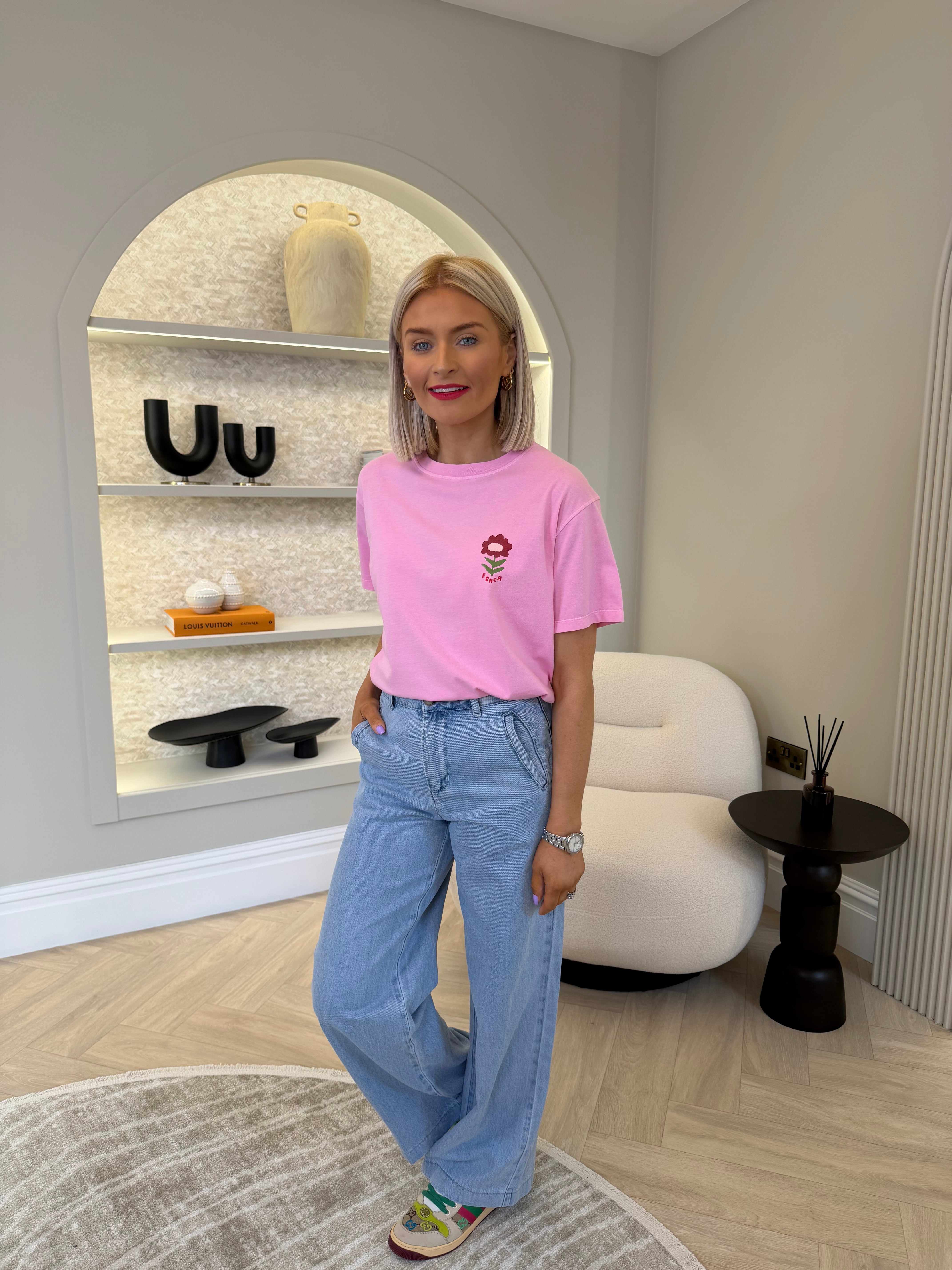 Short sleeve, round neckline, pink shade t-shirt with small flower detailing.
