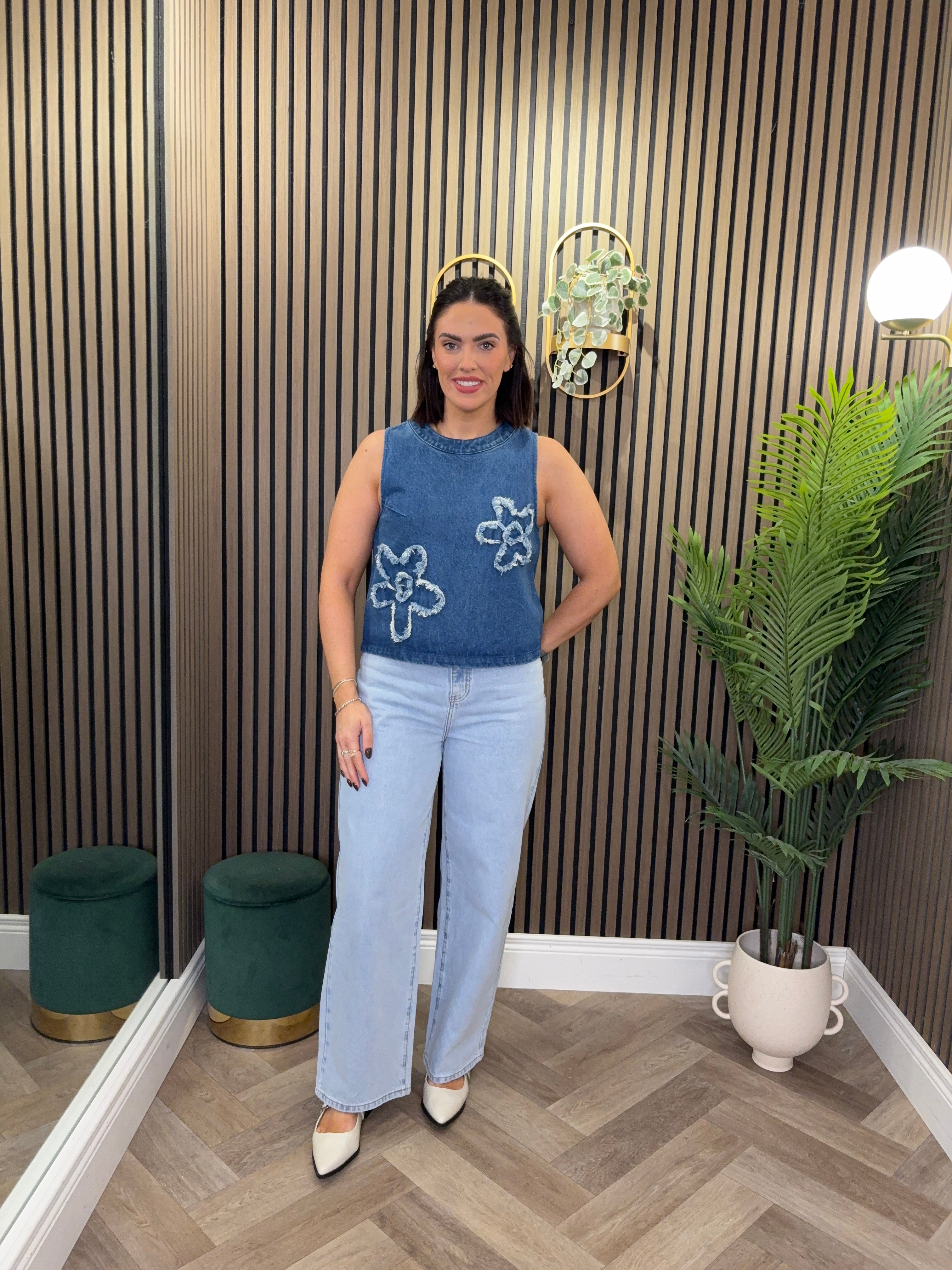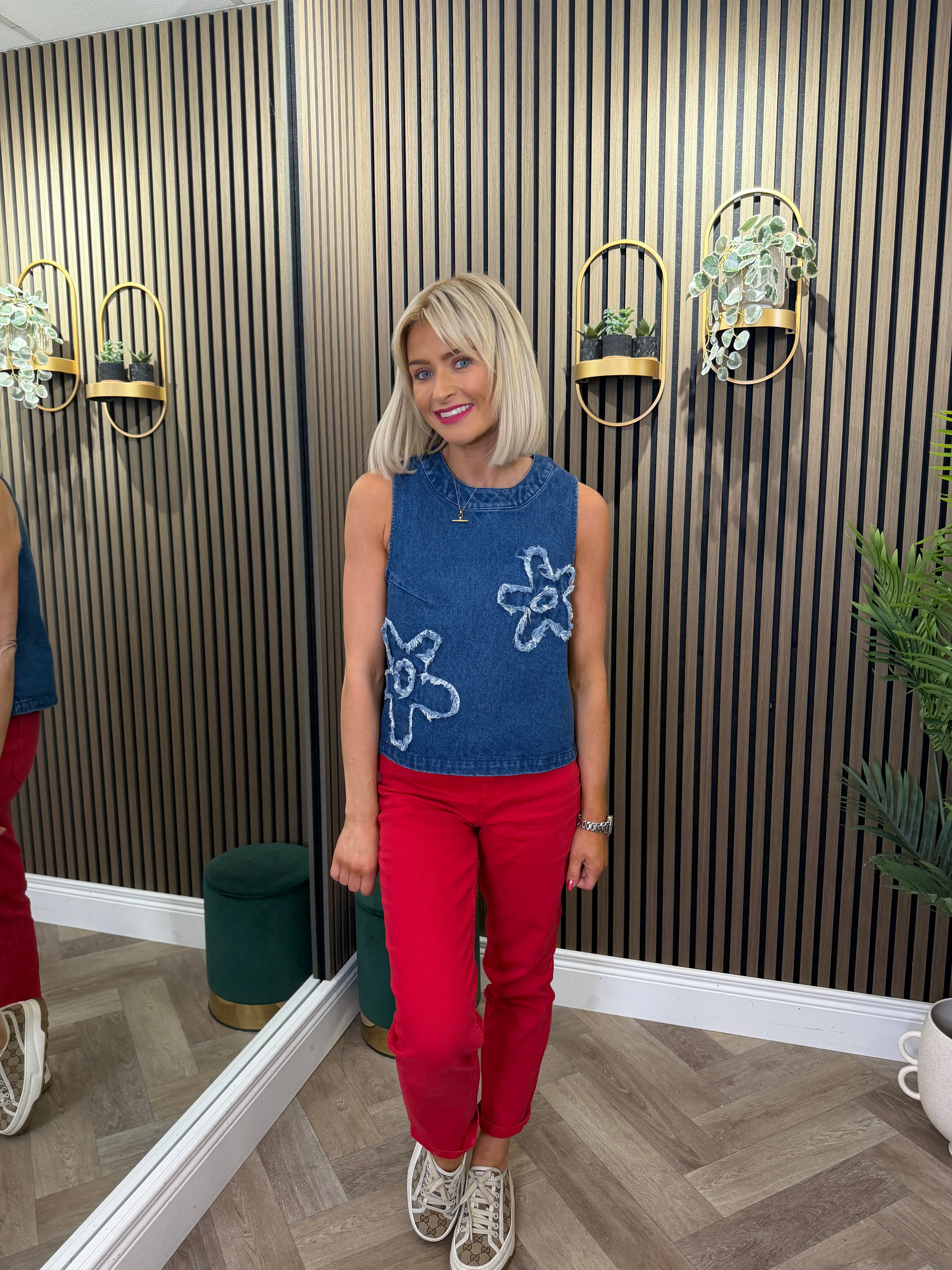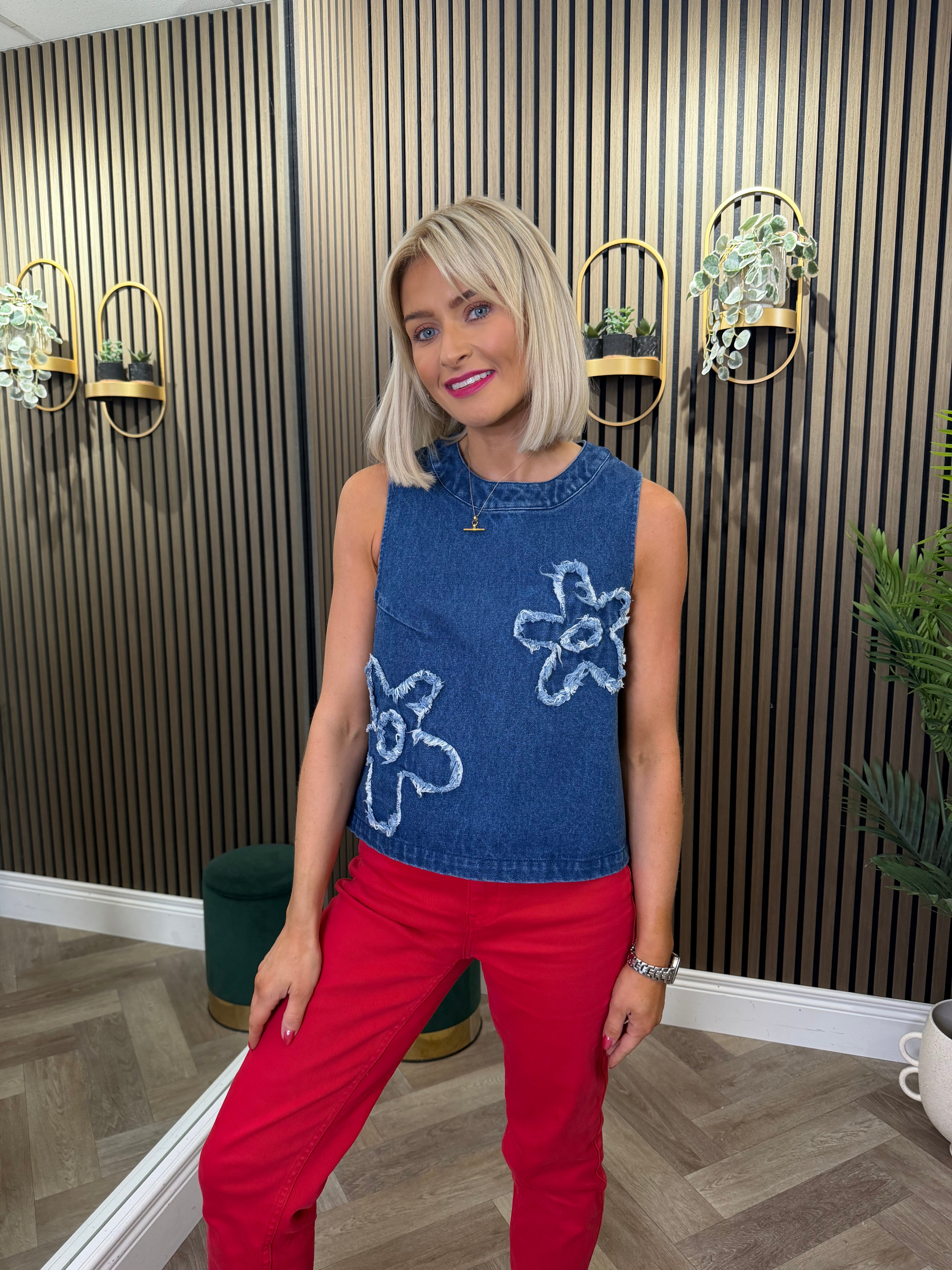 Sleeveless, round neckline, denim style top. Flower embroidered print. Dark wash denim.