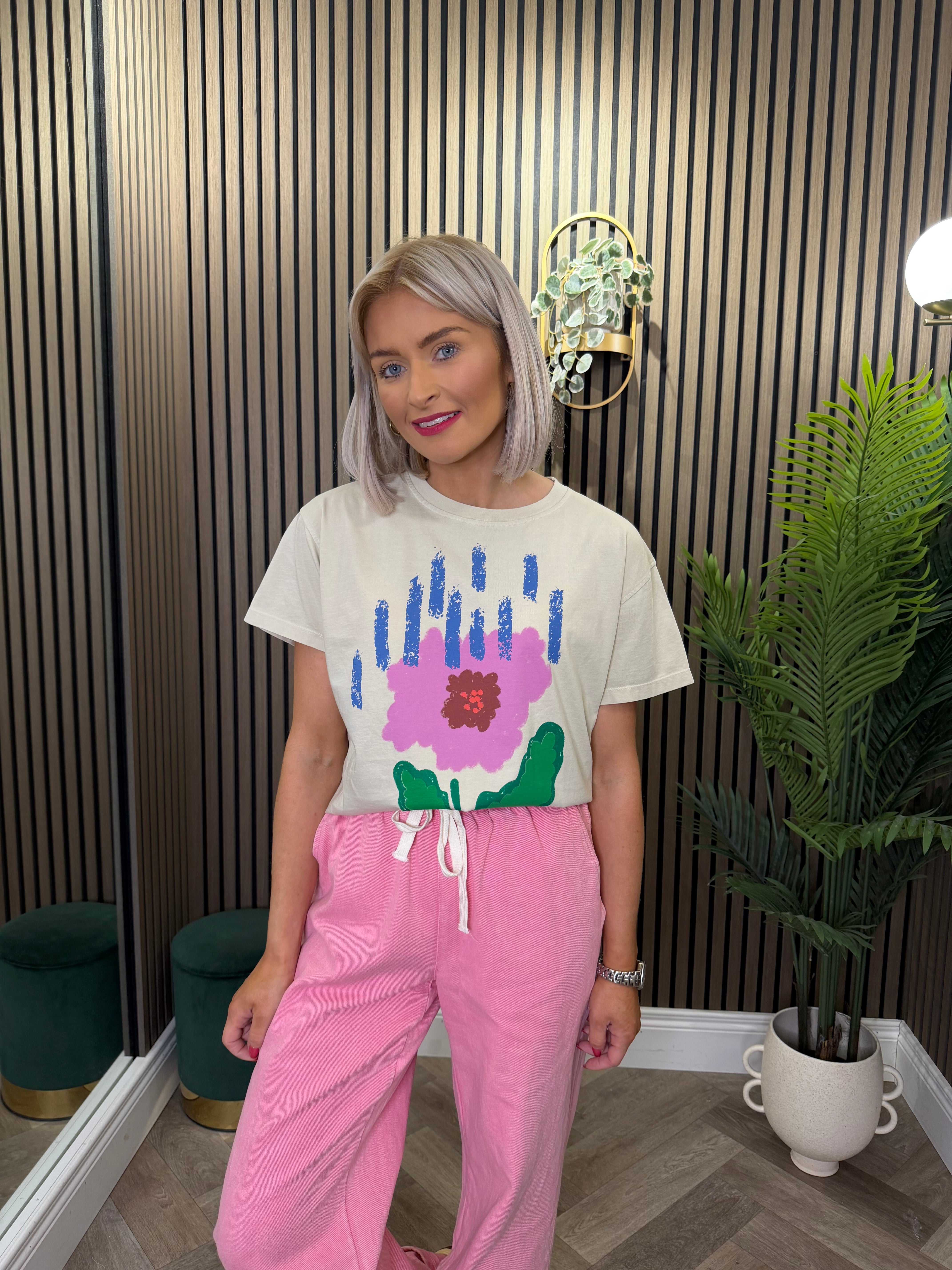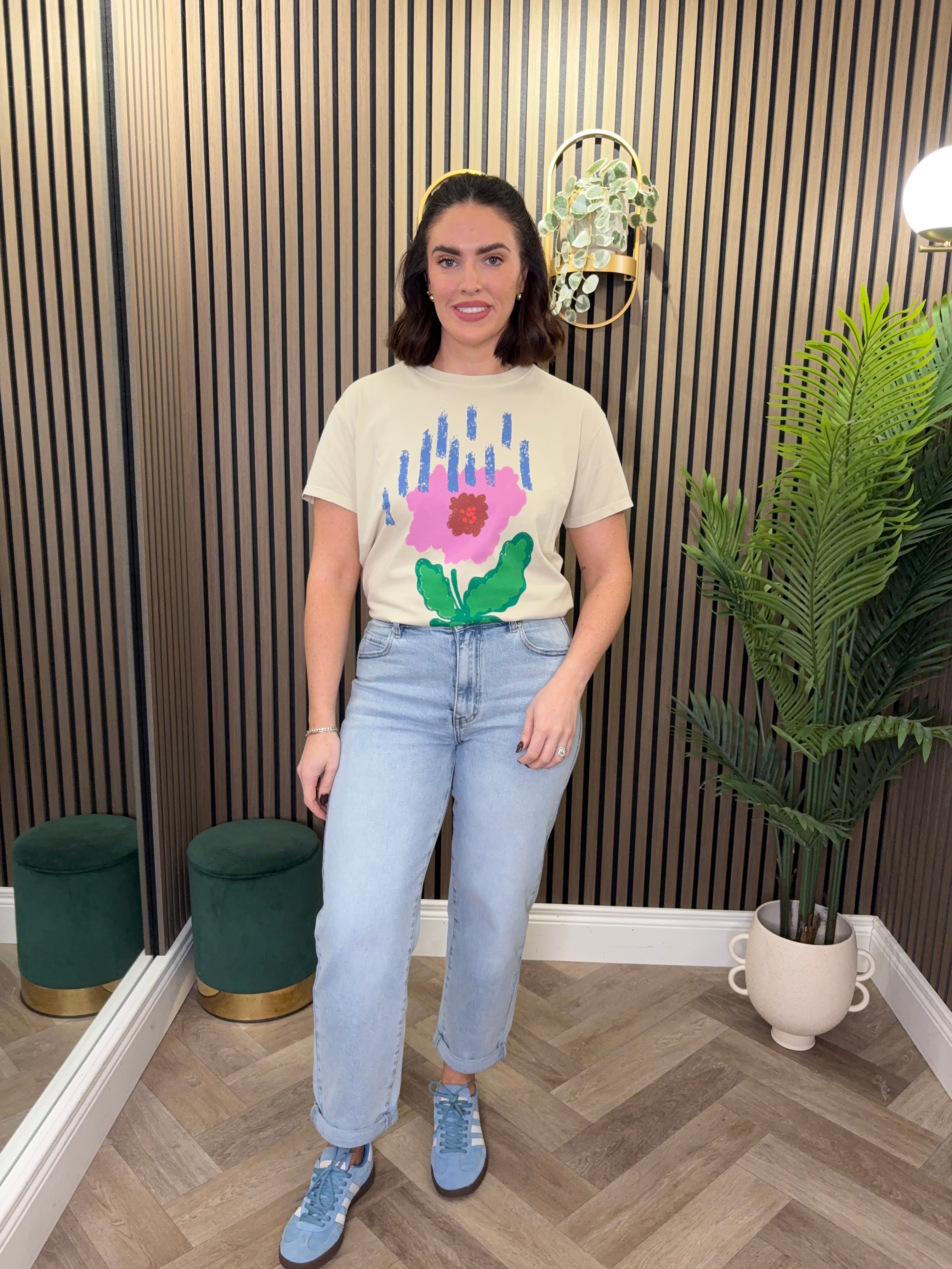 Short sleeve, round neckline t-shirt. Taupe coloured with flower print design.