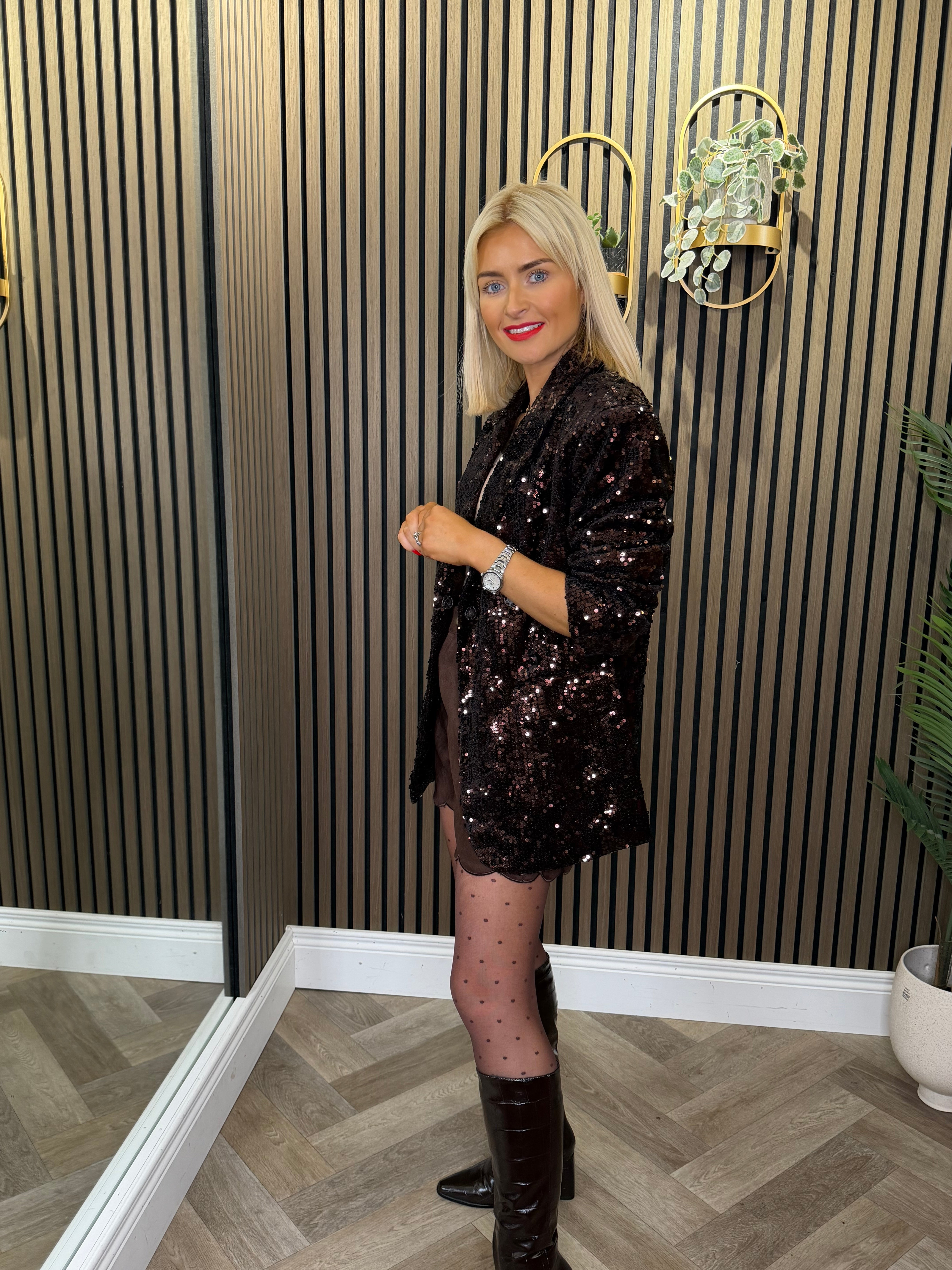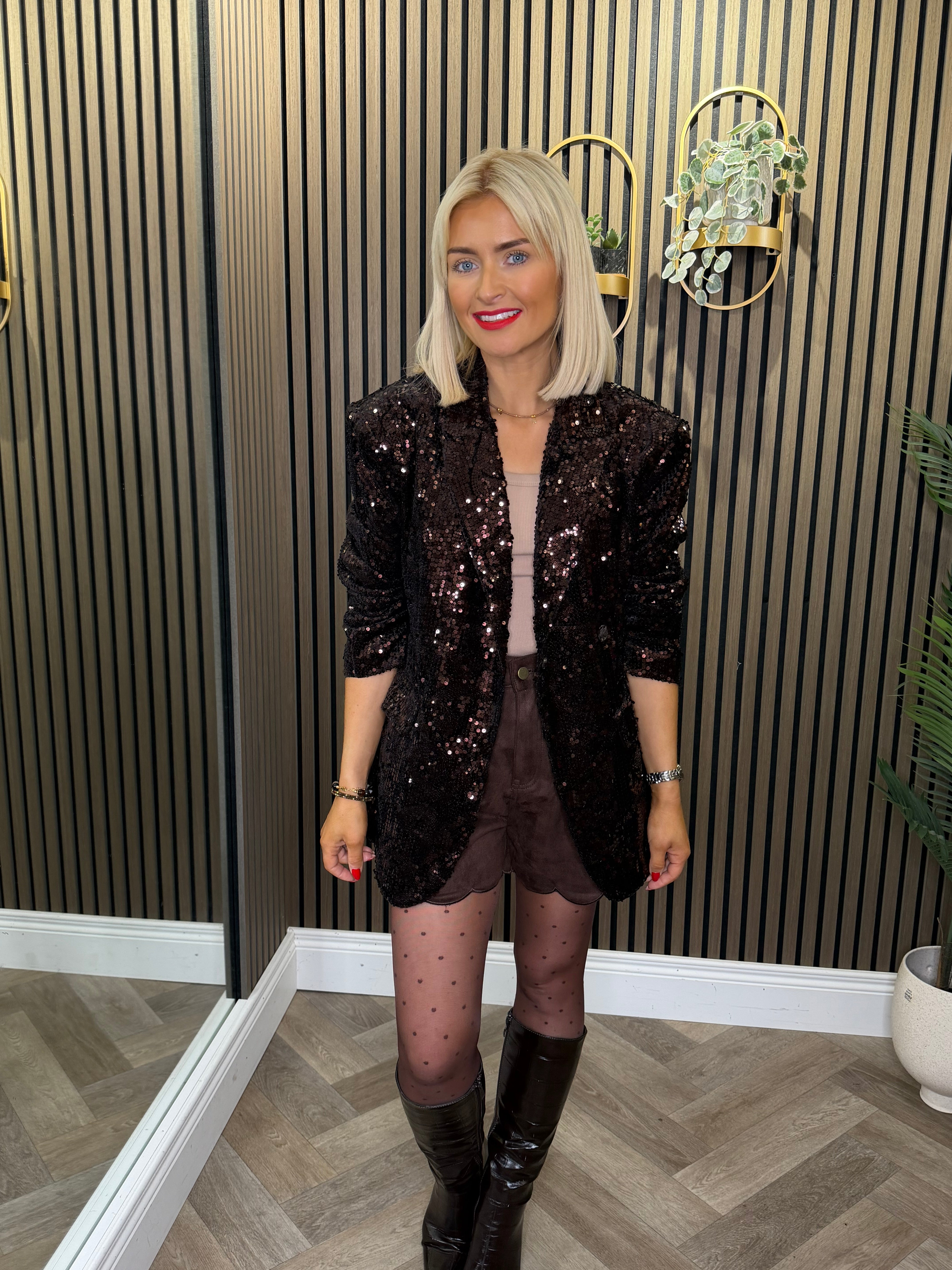 Long sleeve, regular fit, sequin style blazer. Gorgeous brown shade.