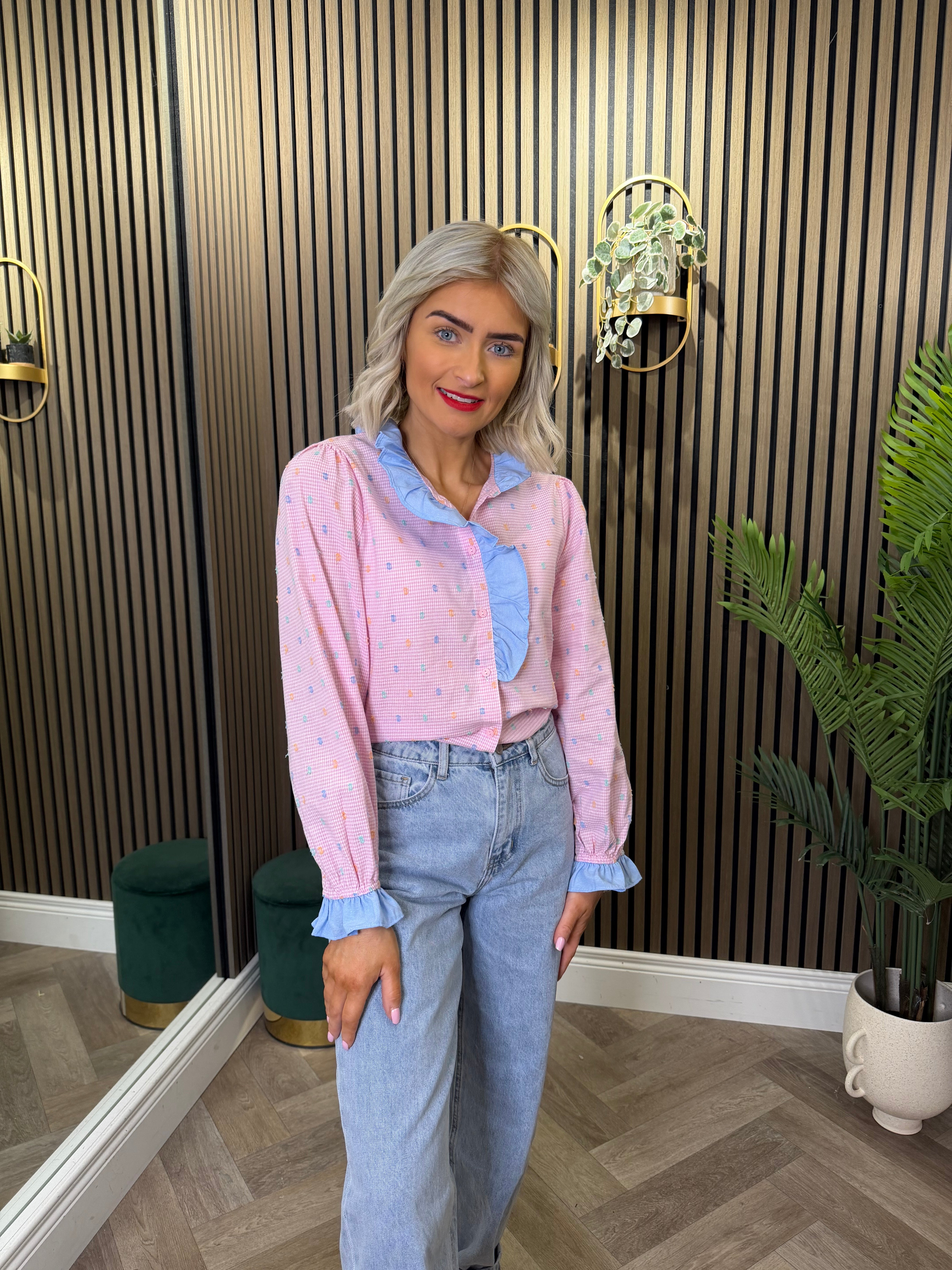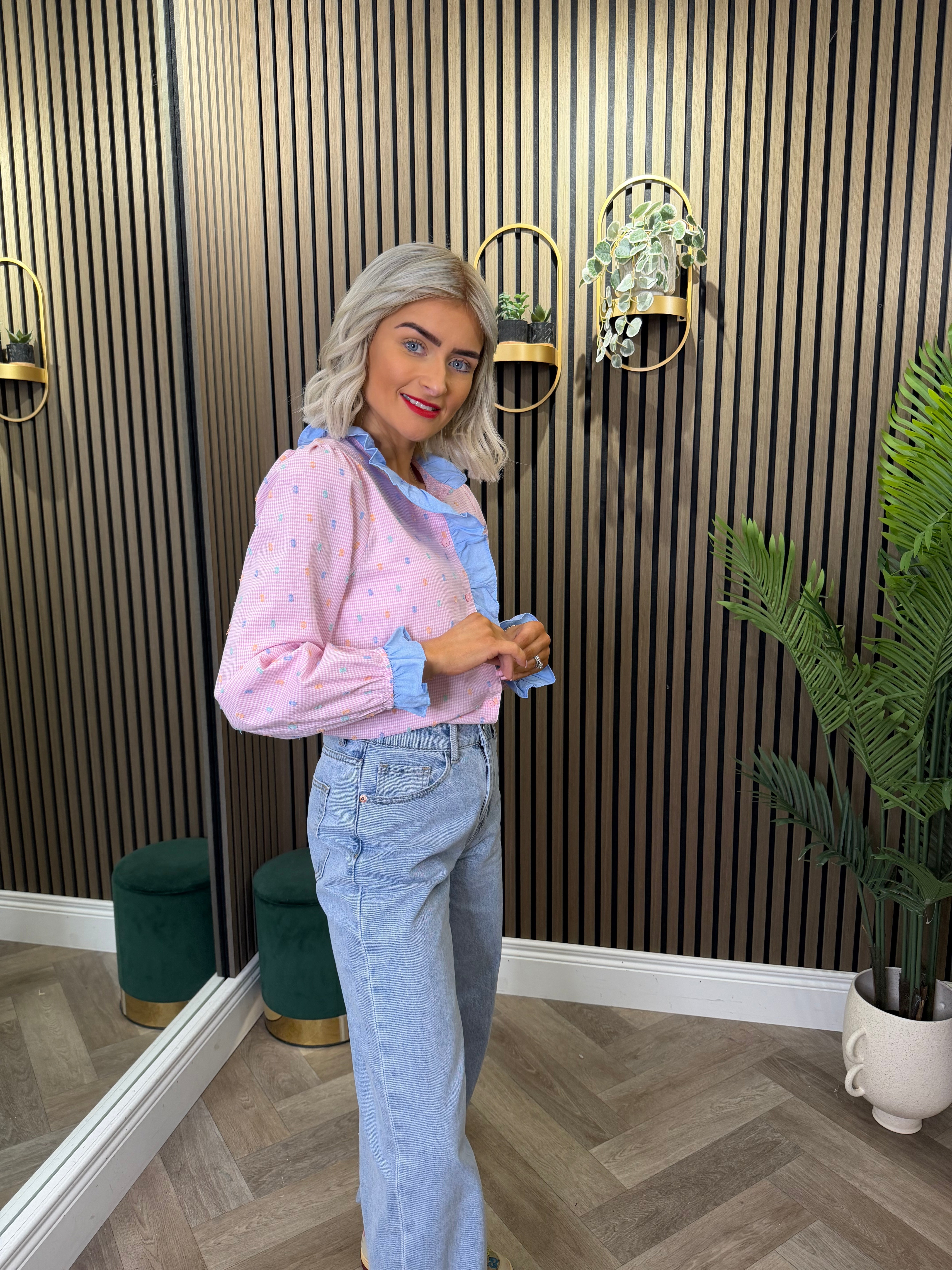 Long sleeve, button up, small gingham print. Frill detailing. Available in other colour ways.