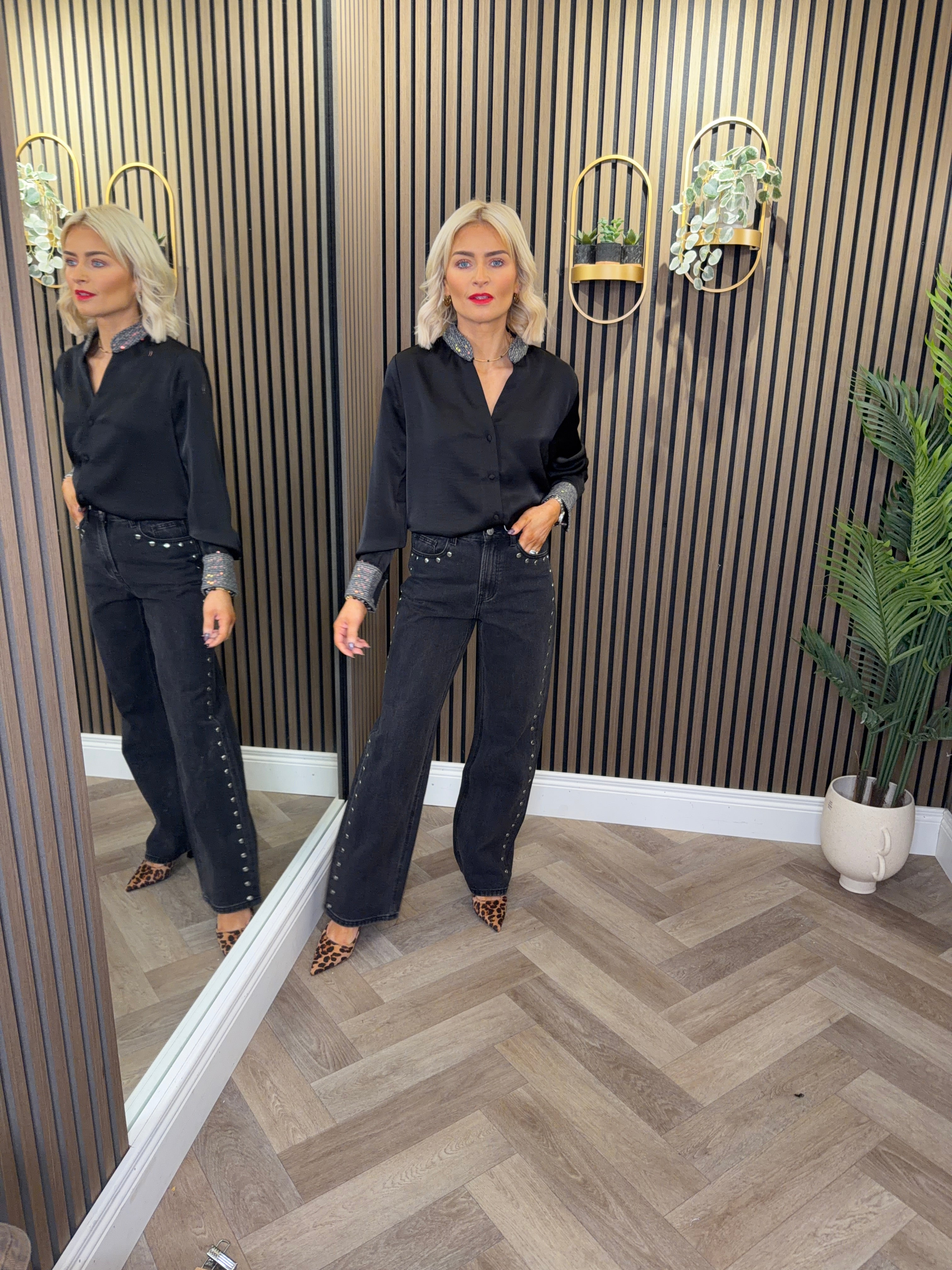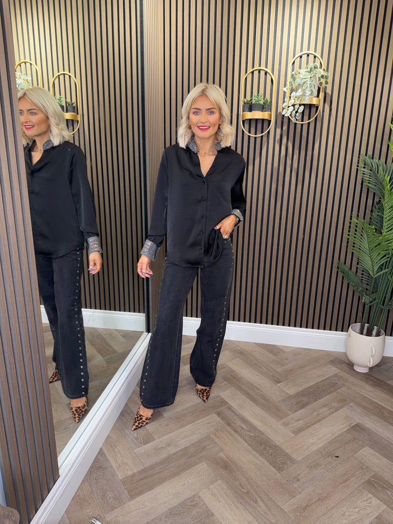 Long sleeve, satin style black shirt. Sequin detailing on the cuffs.