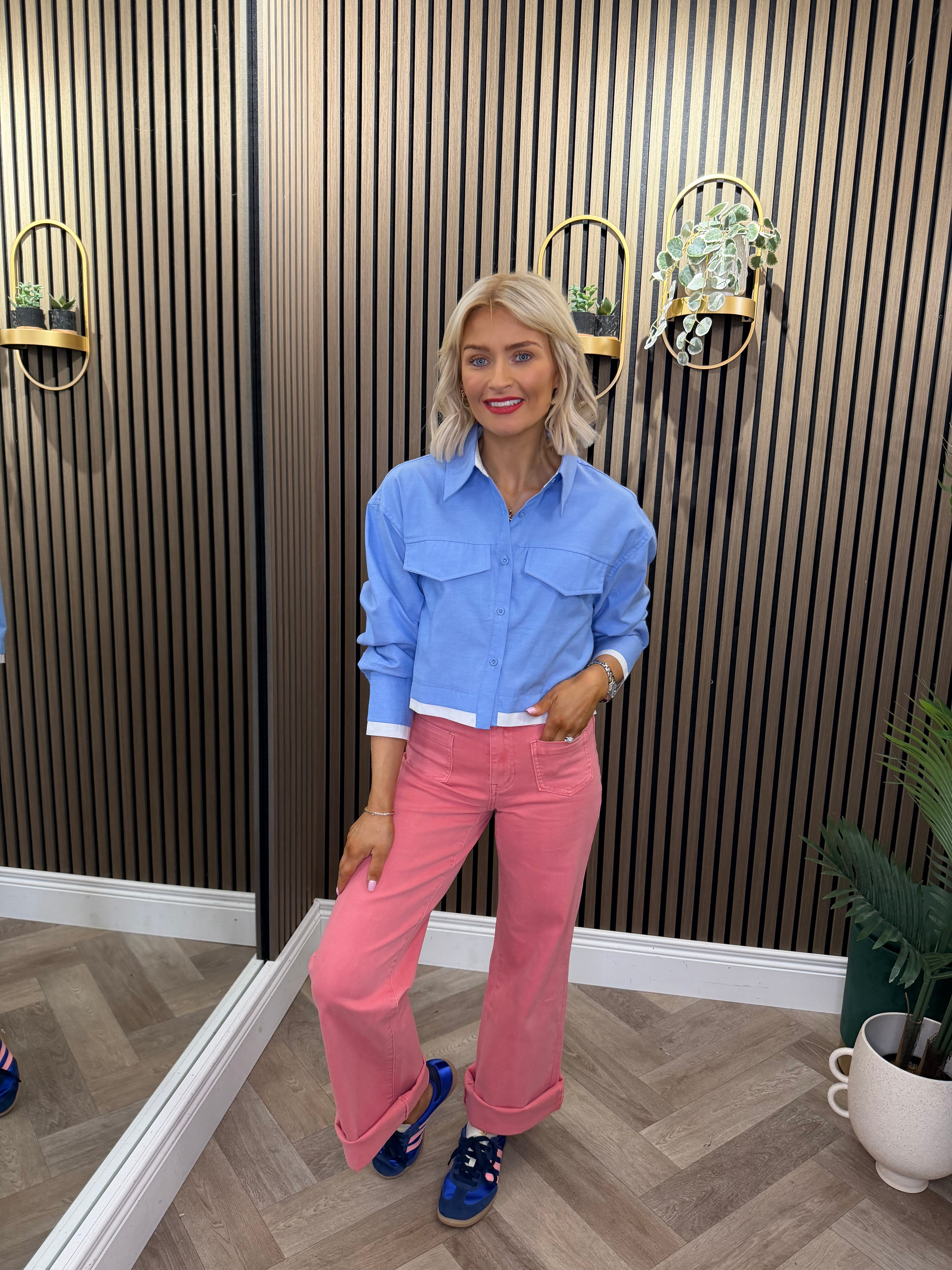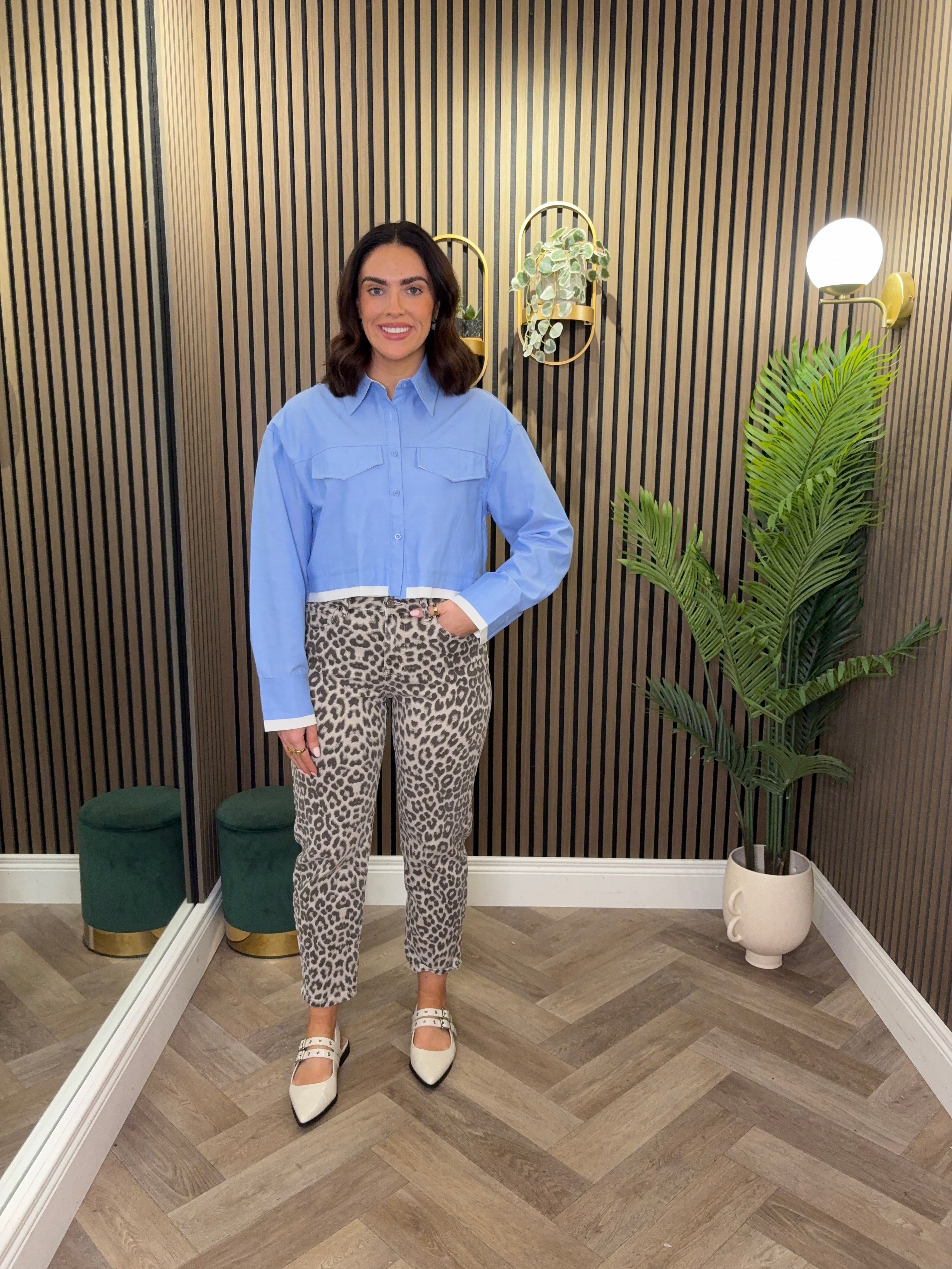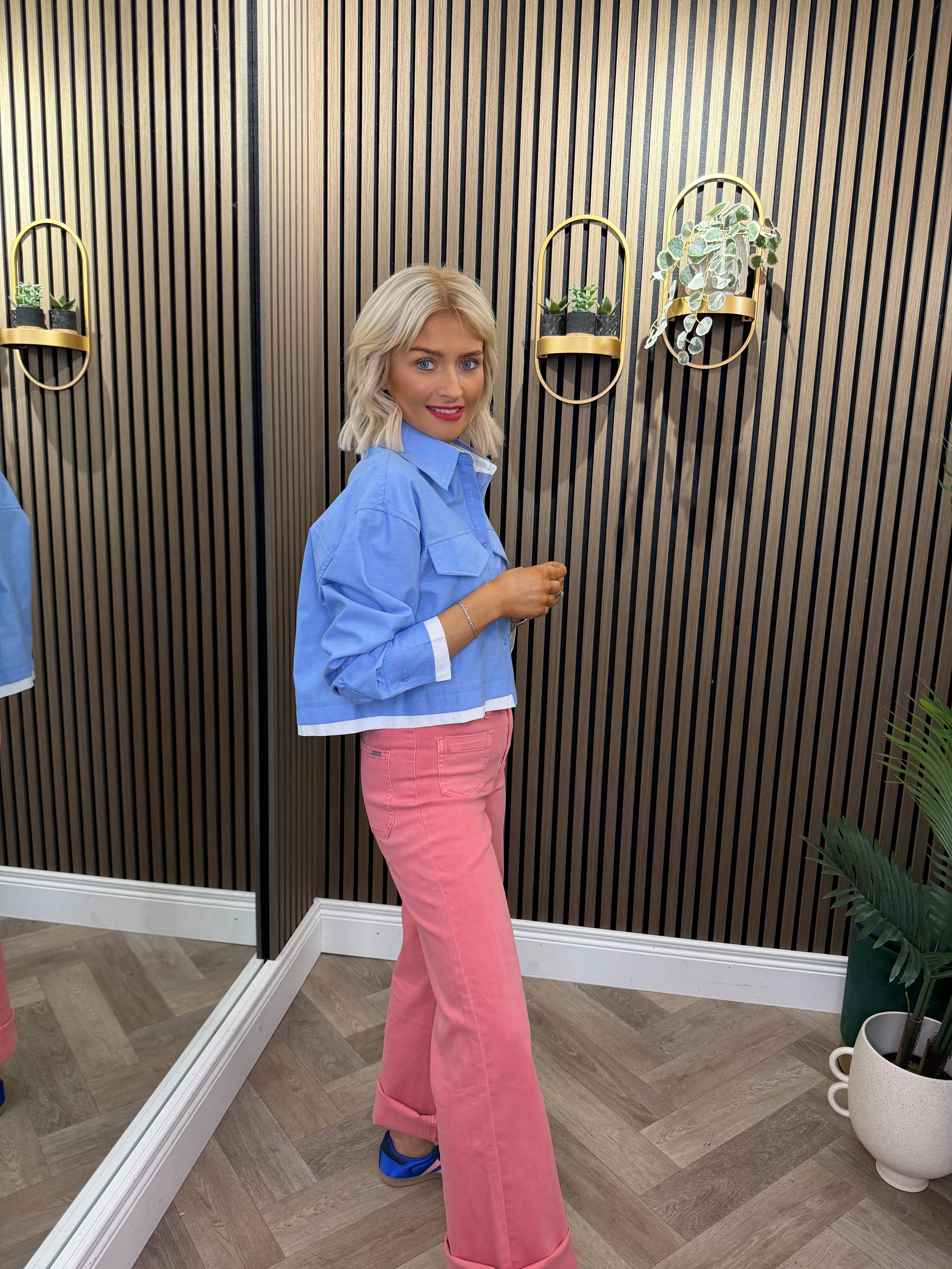 Long sleeve, button up, crop style shirt with white shirt detailing at the bottom.