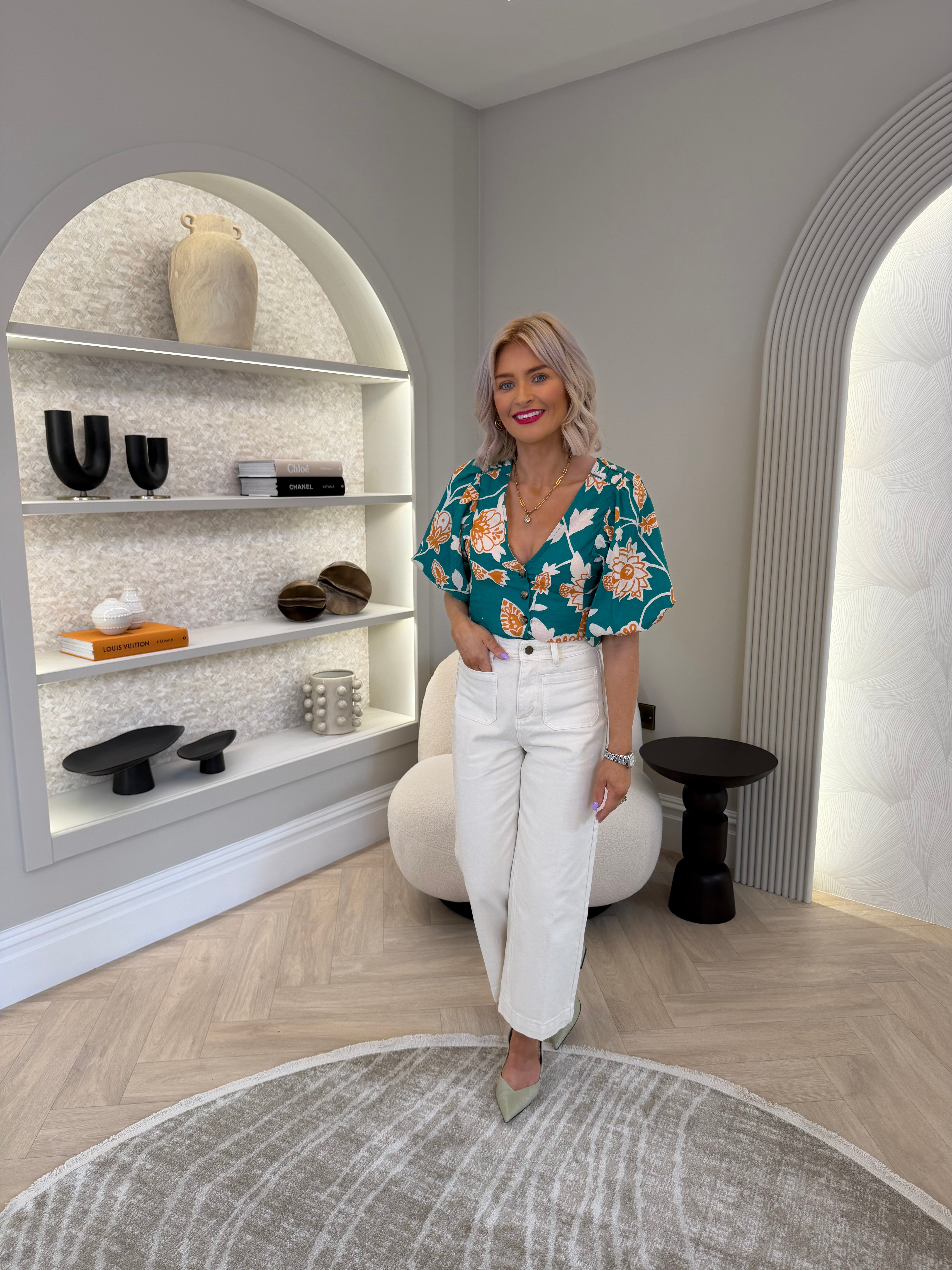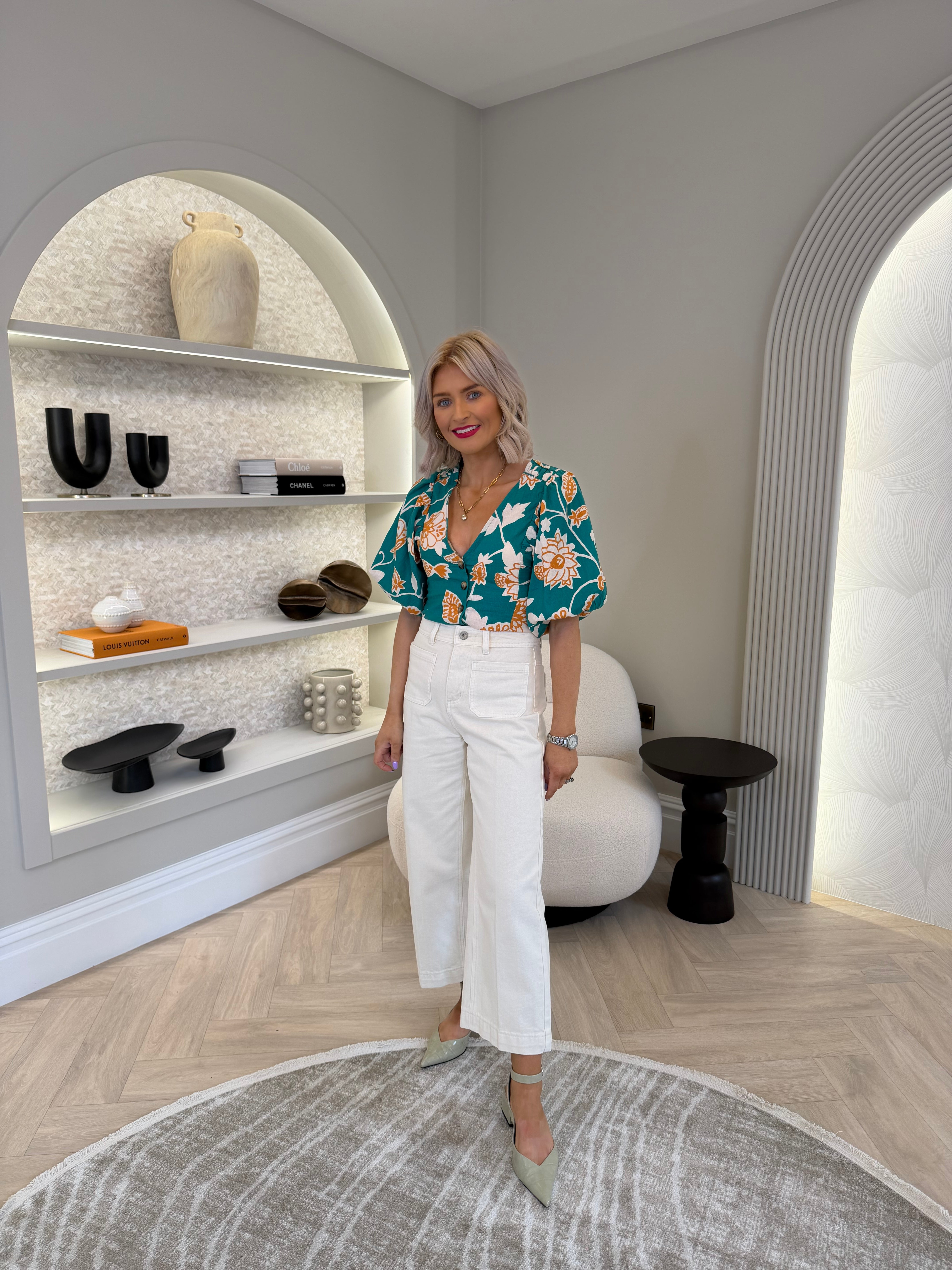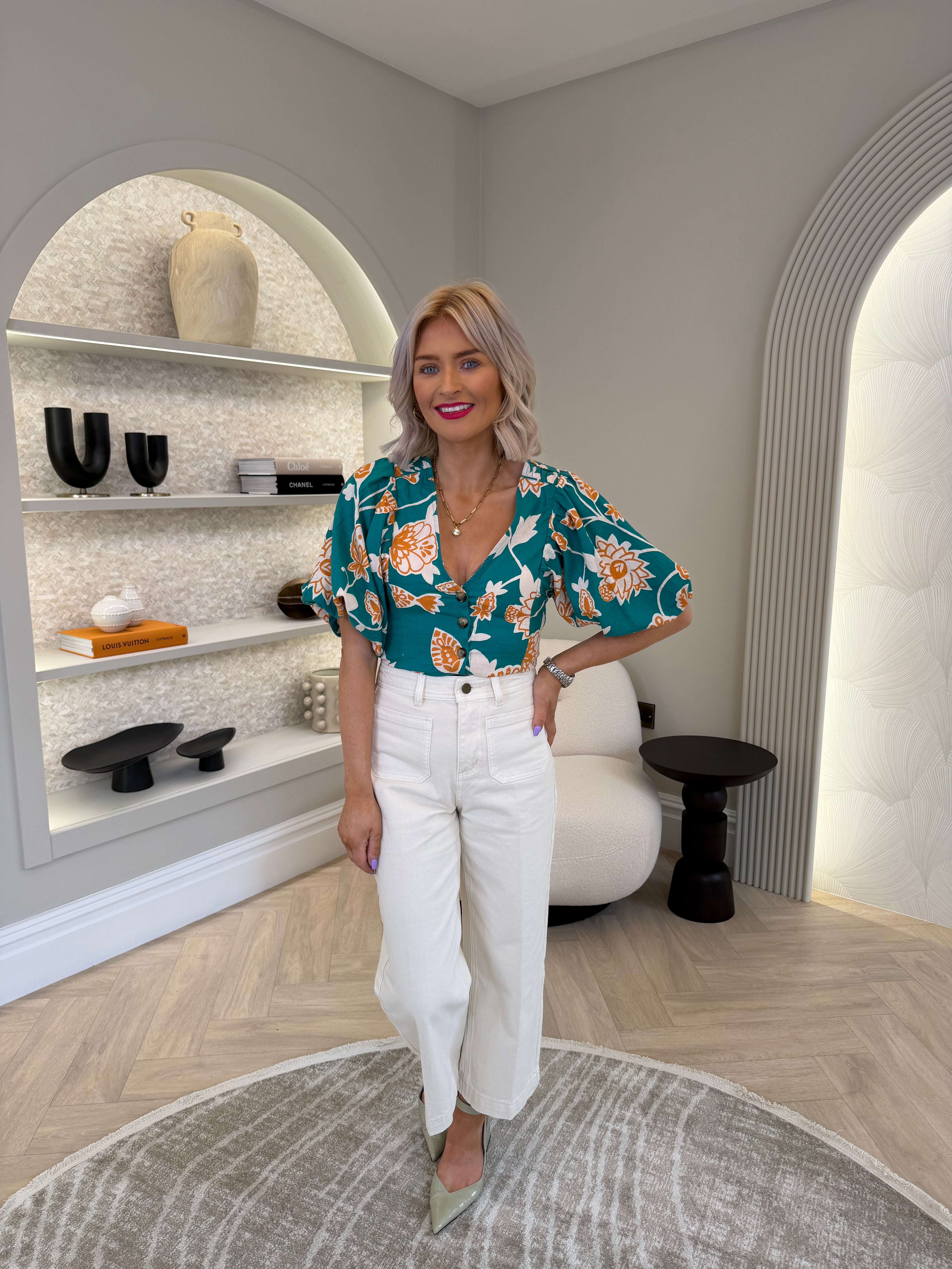 Short sleeve, V neckline, puff sleeve style top. Button up. Green flower print.