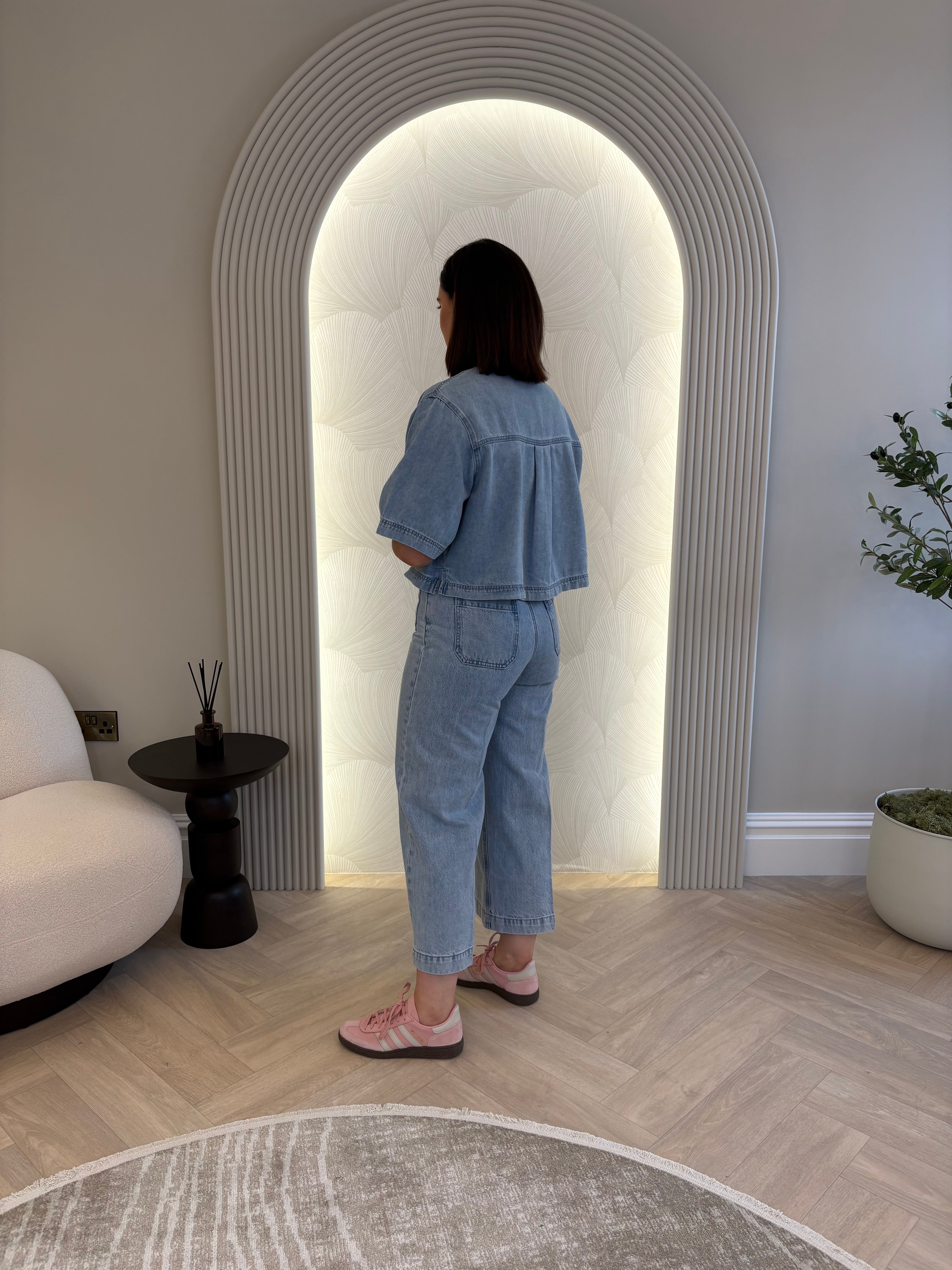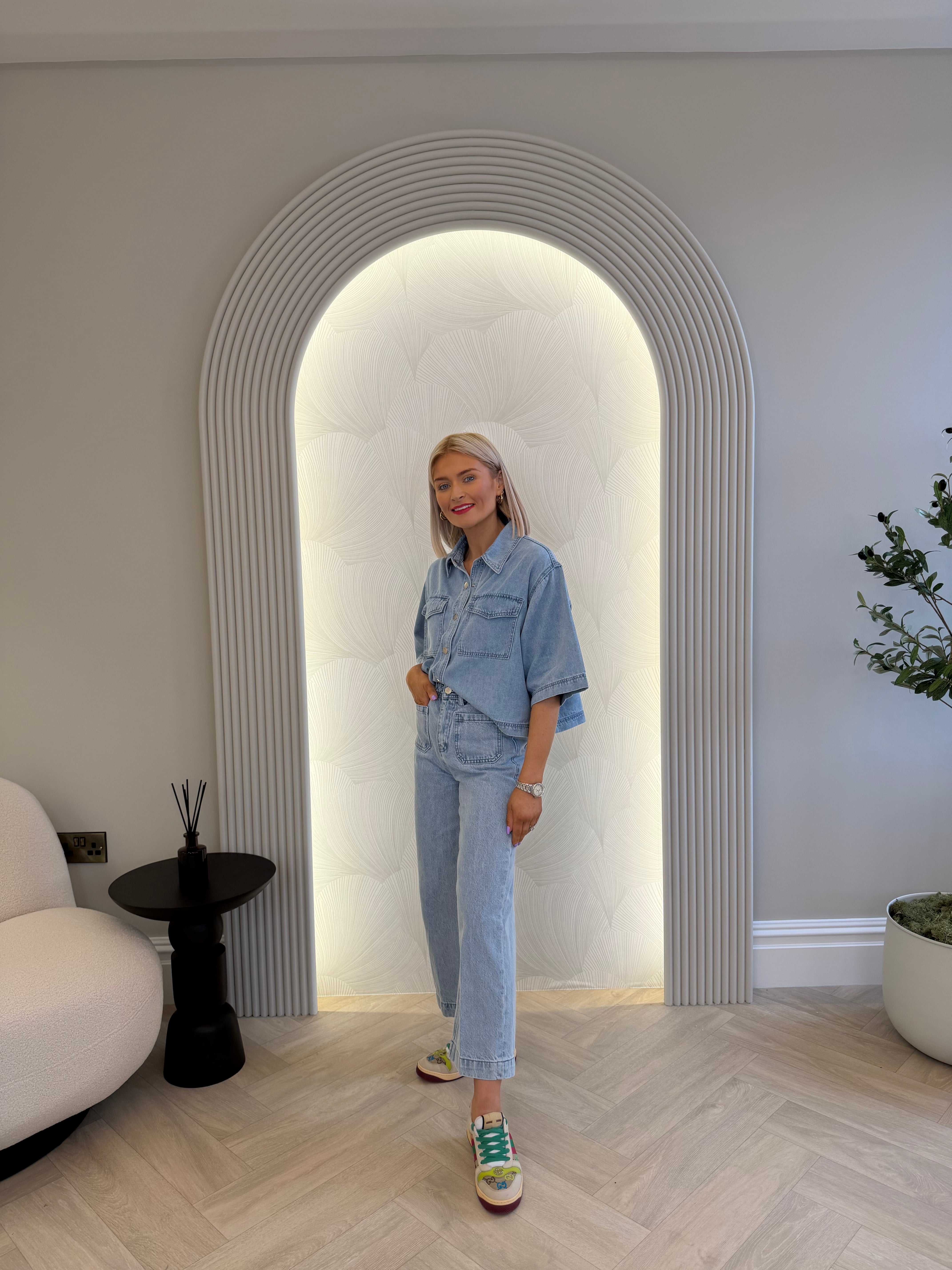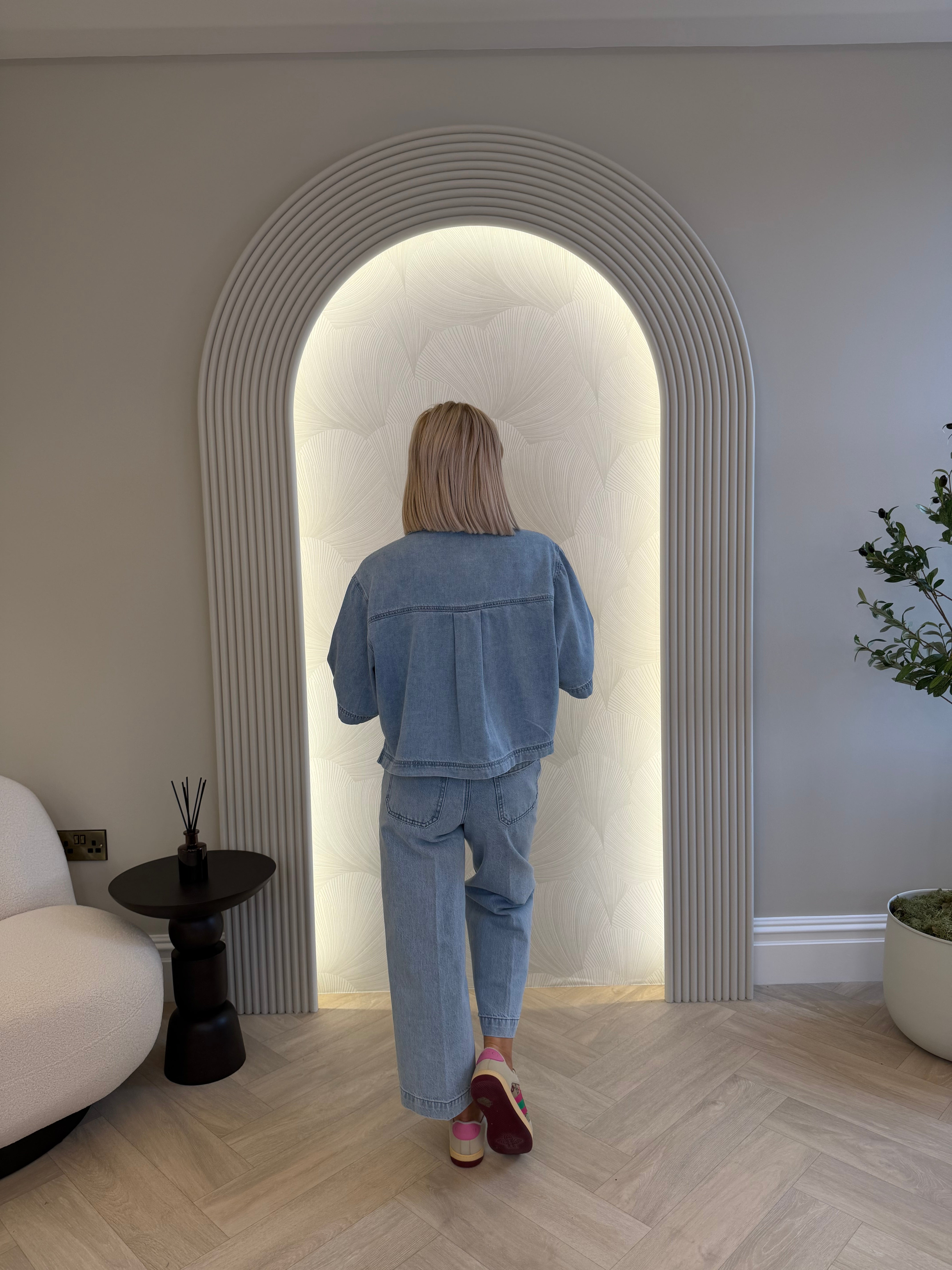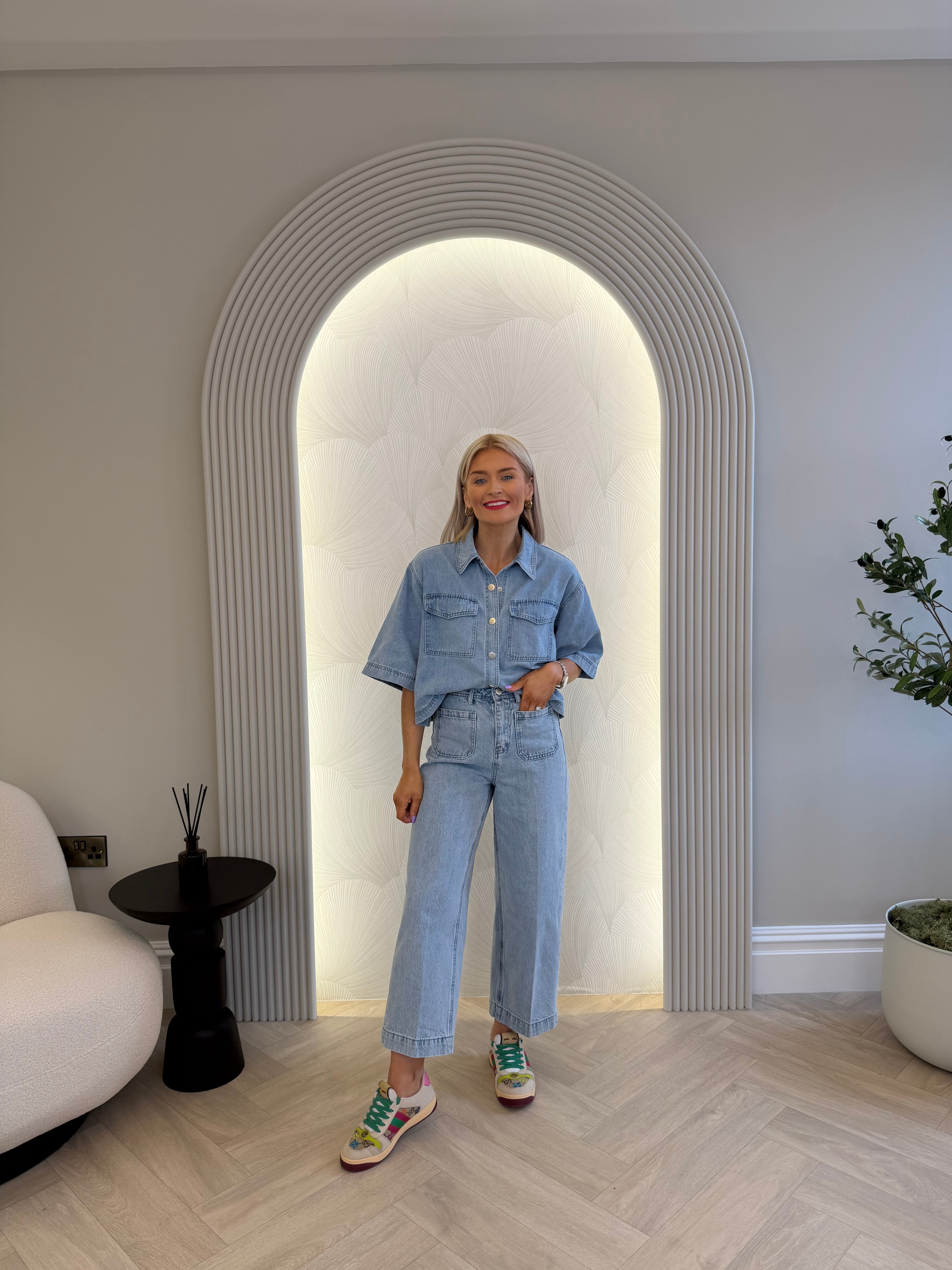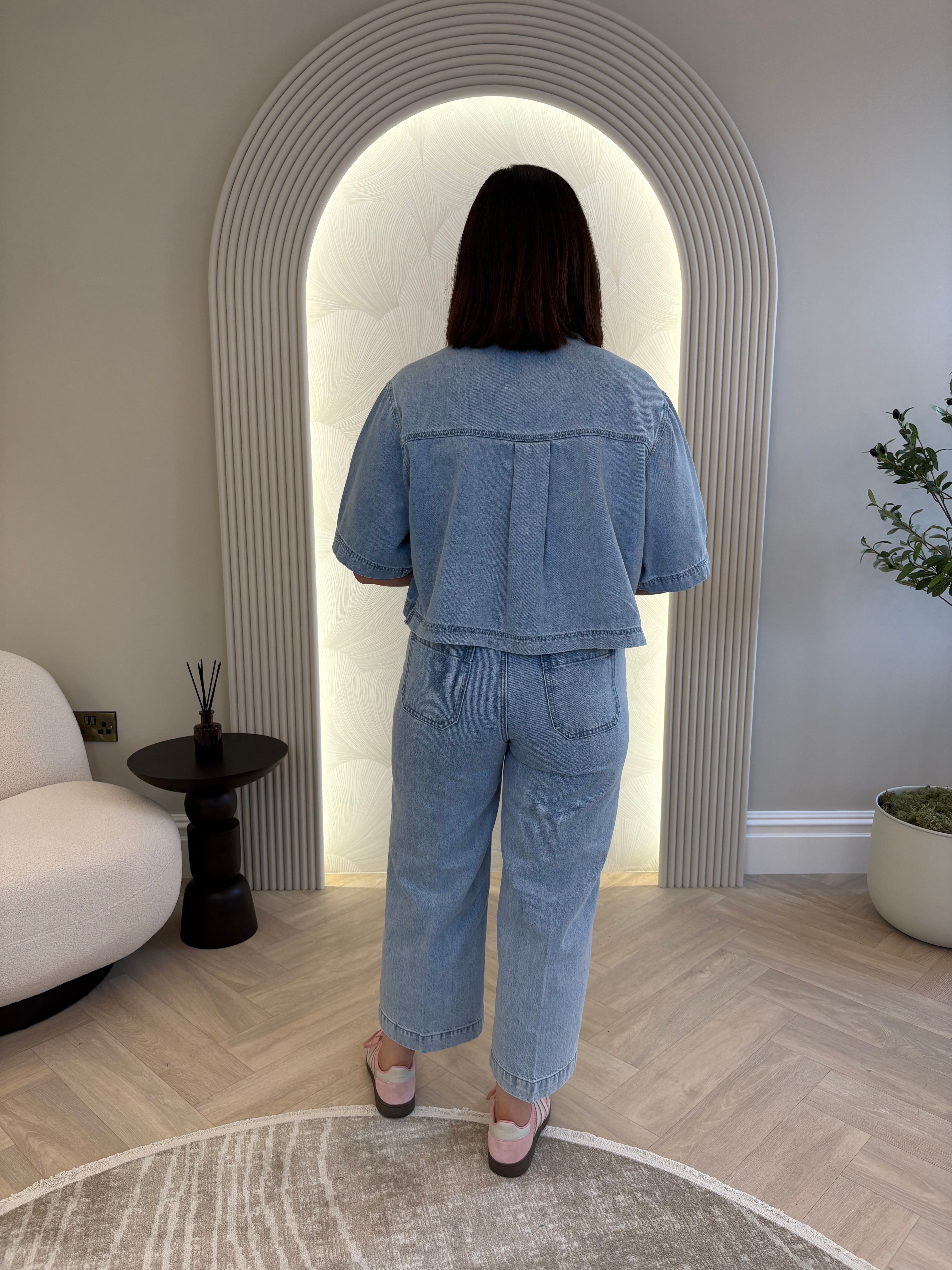 3/4 length sleeve, cropped/boxy style, light wash denim shirt. Button up.
