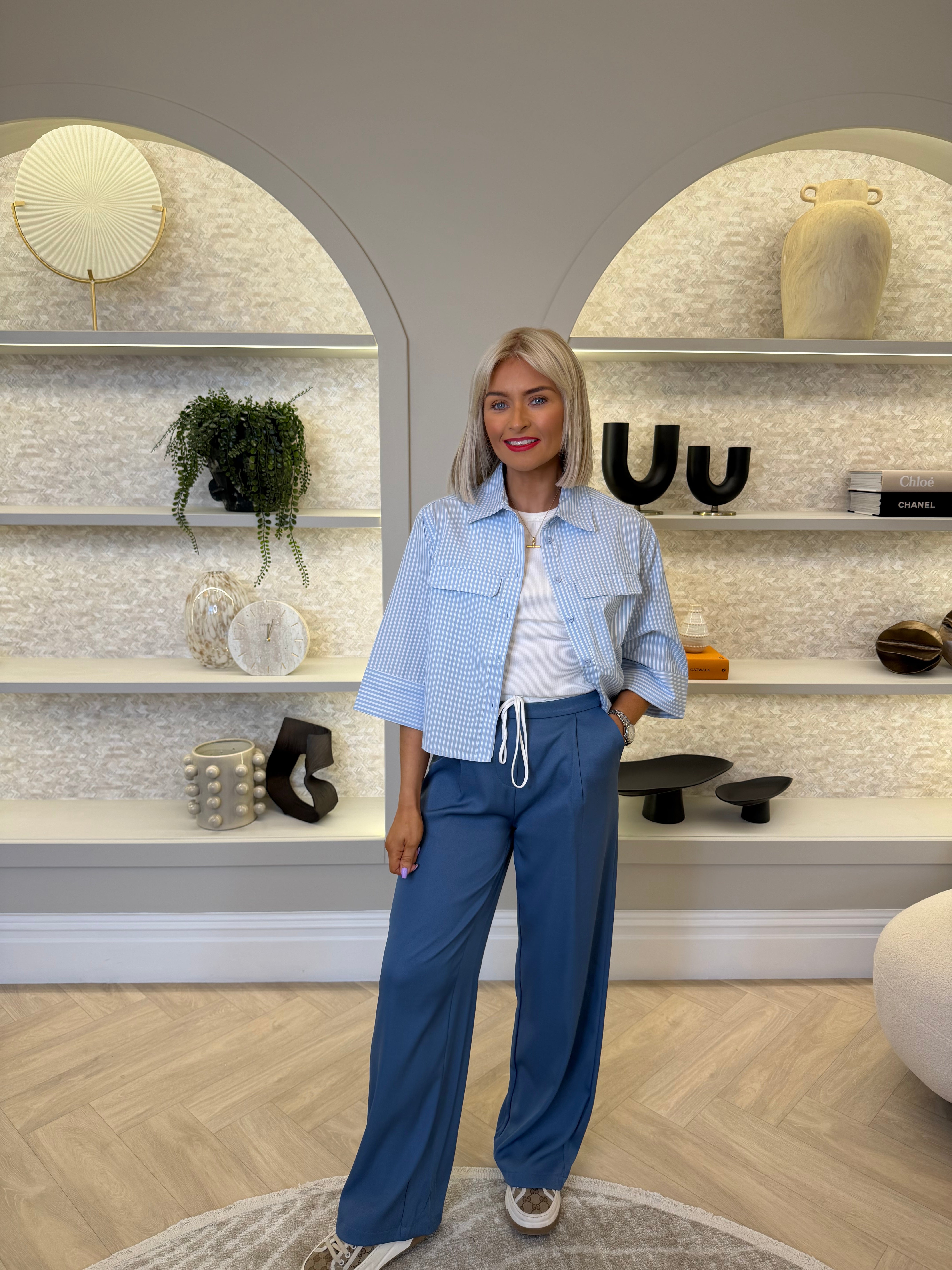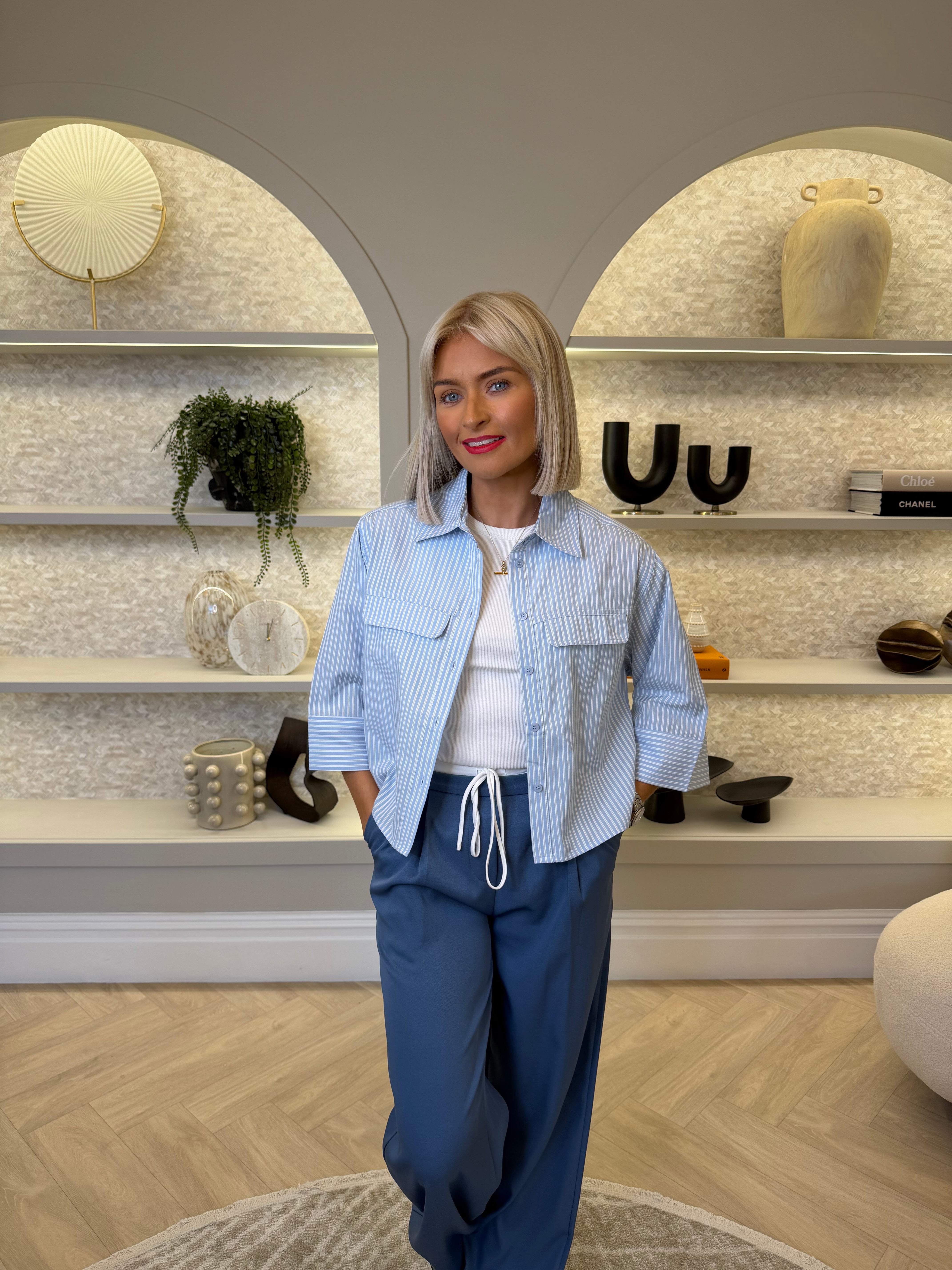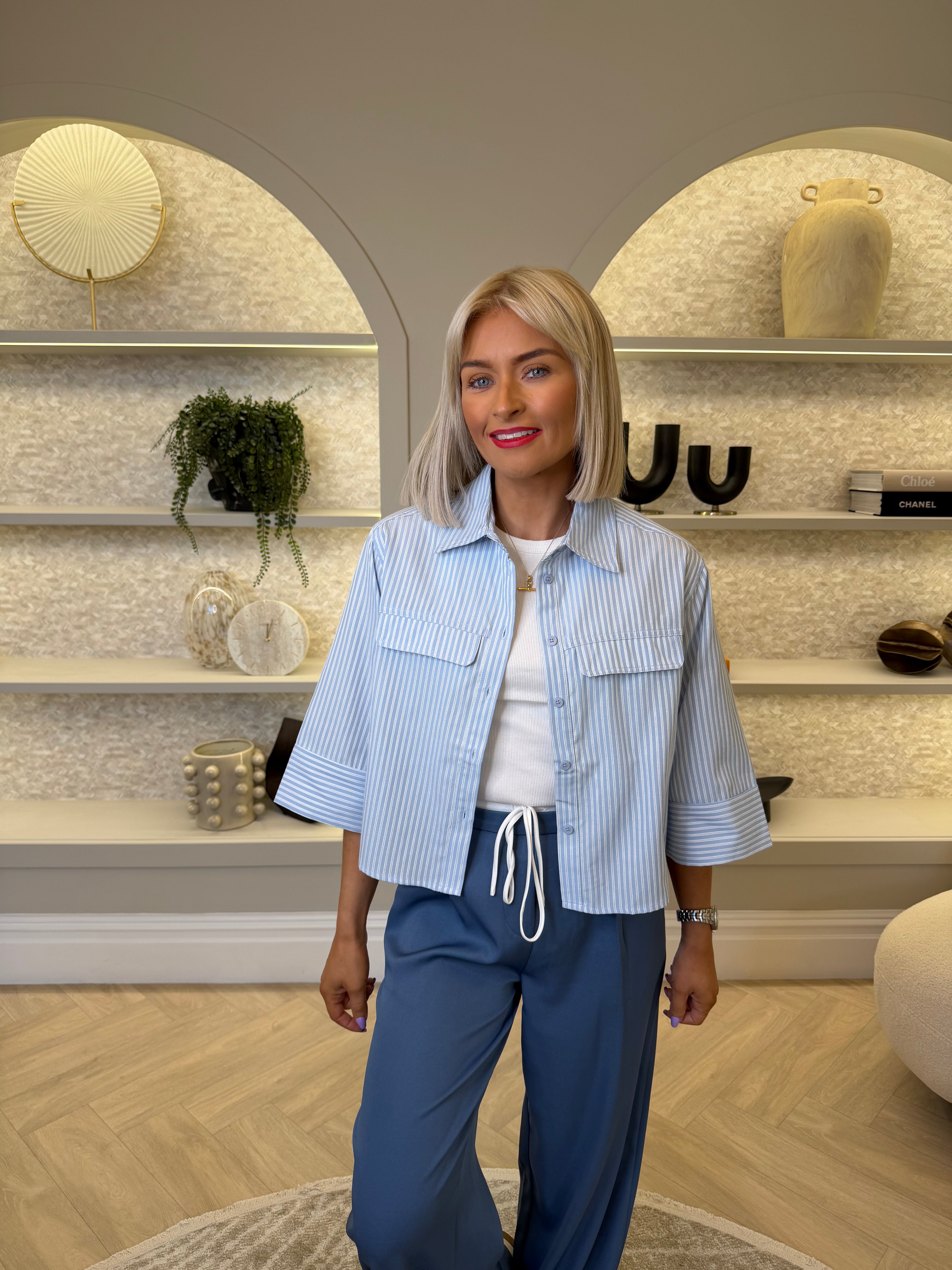 3/4 sleeve, boxy style, stripe printed shirt. Button up. Available in more colour ways.