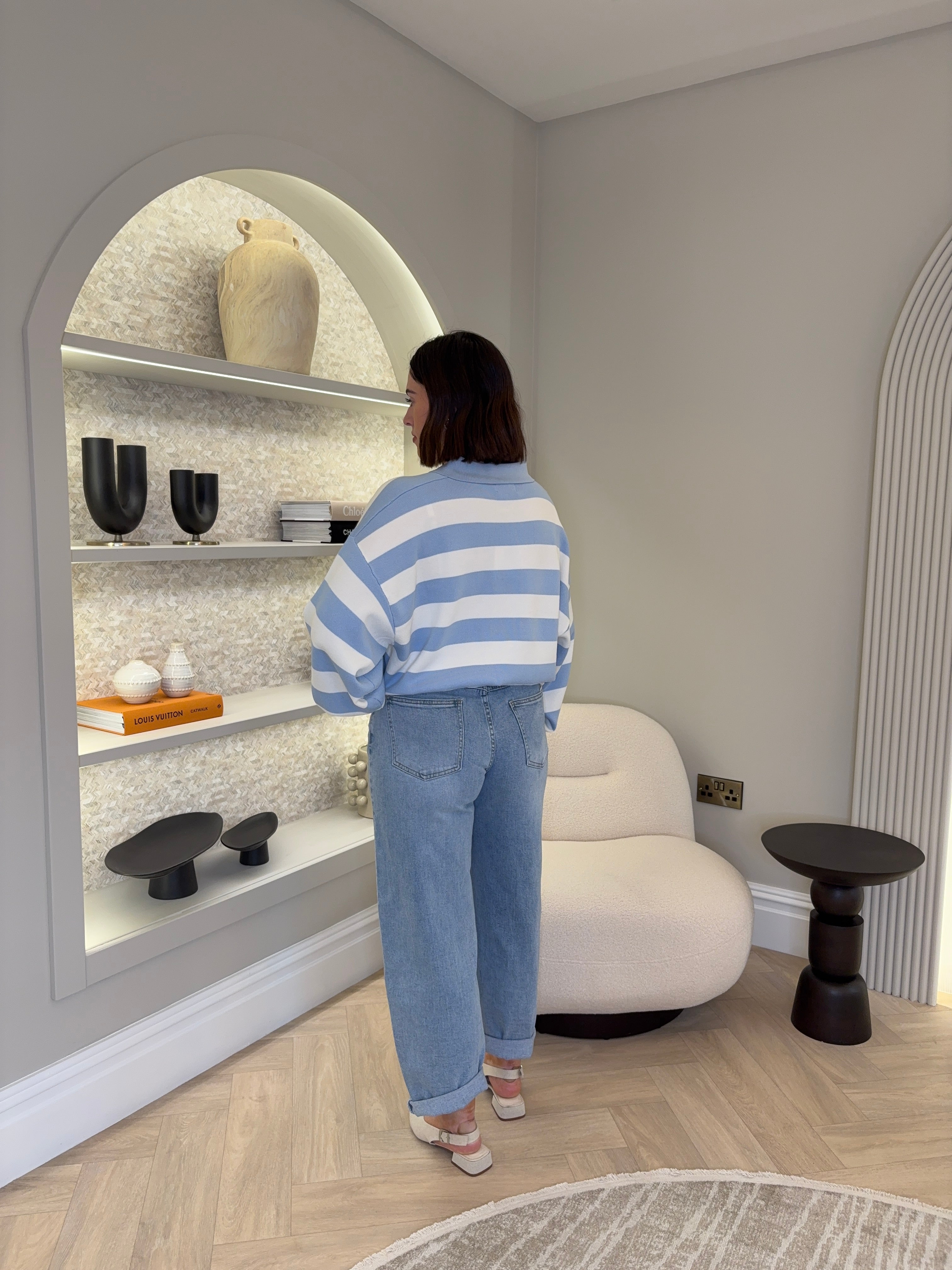 Long sleeve, 1/4 zip detailing, knit jumper. Stripe print.