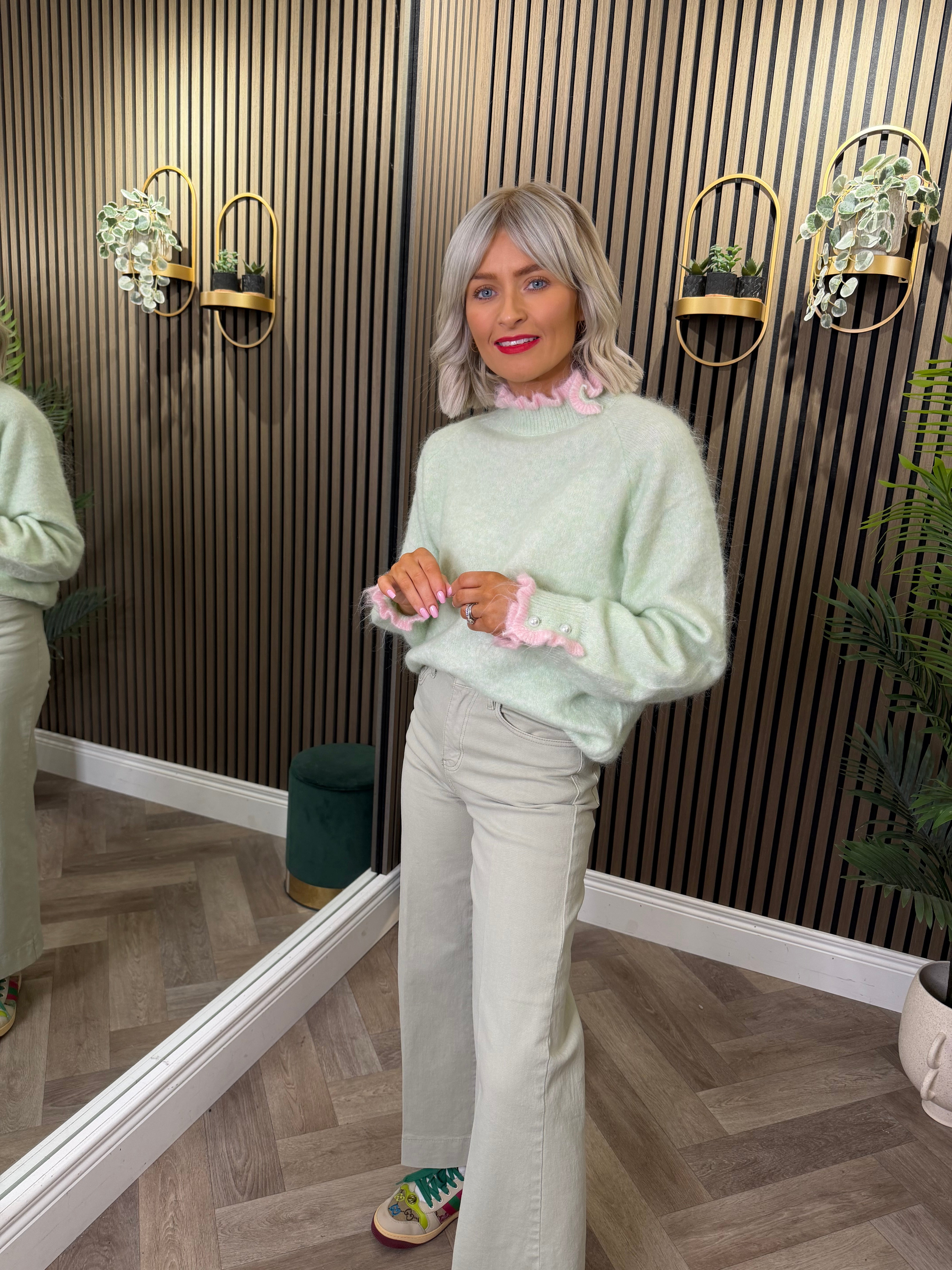 High waisted, crop, wide leg style jeans.