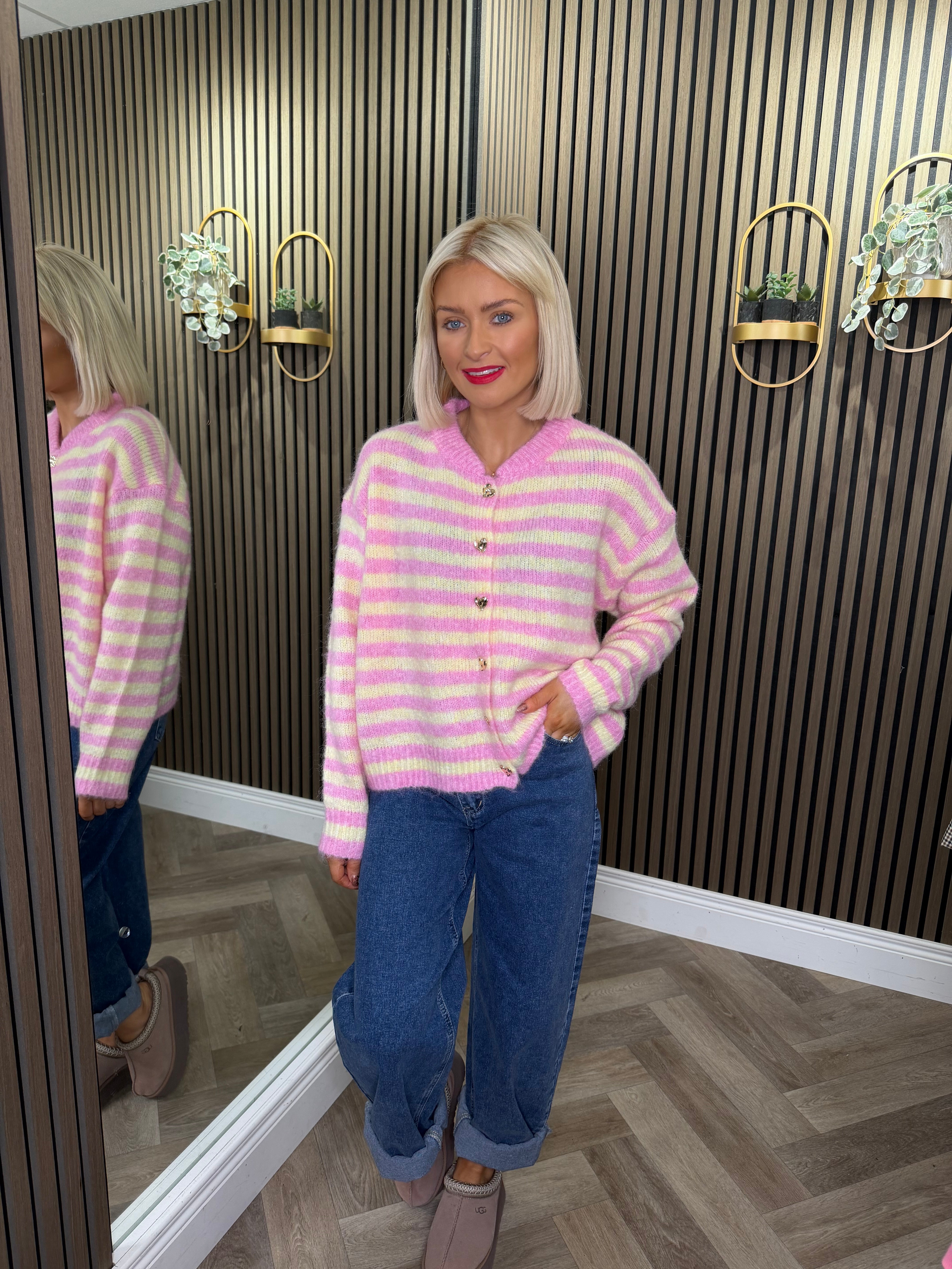 Long sleeve, round neckline, stripe knit cardigan. Gold heart button detailing. Available in more colours.