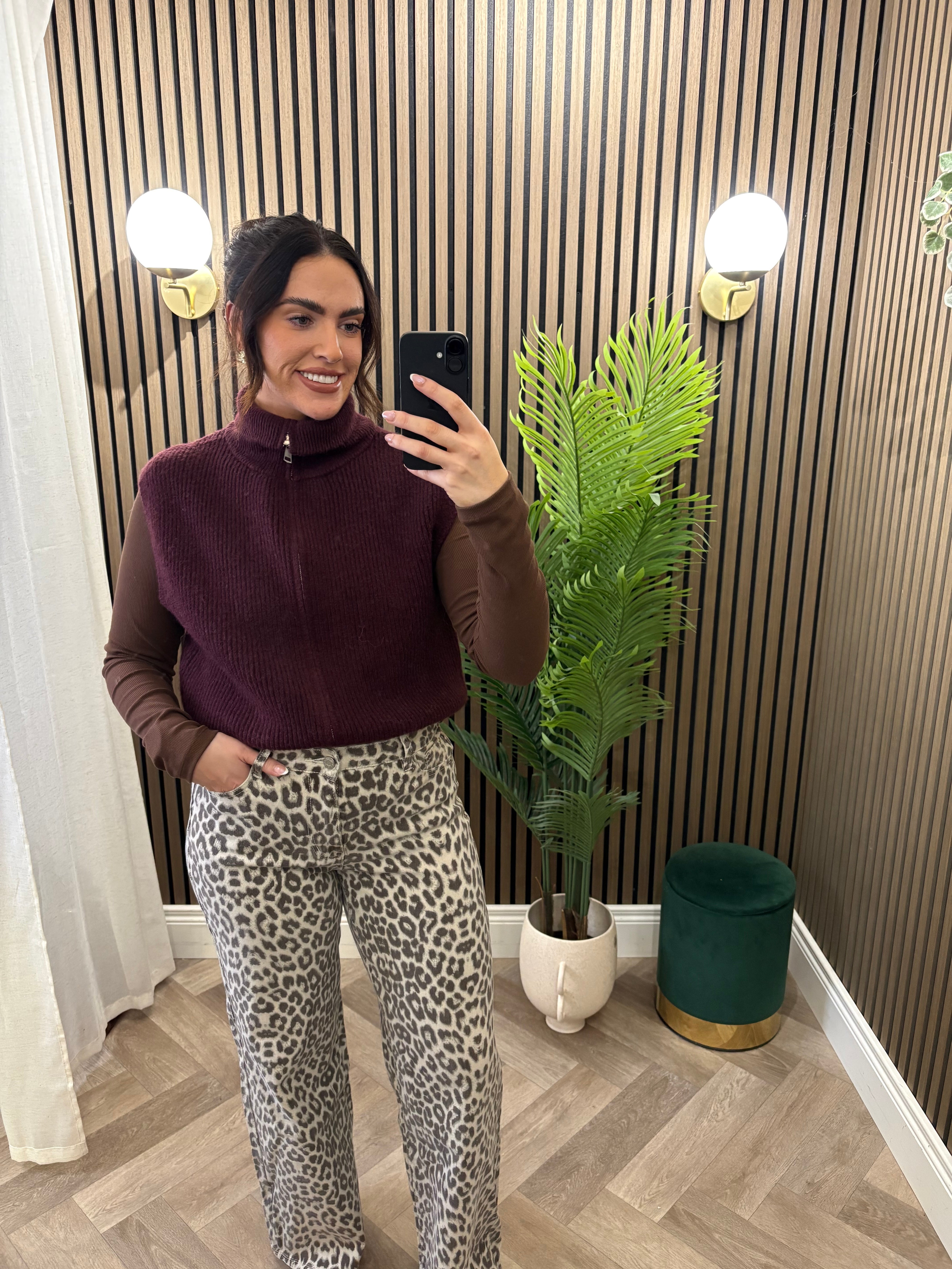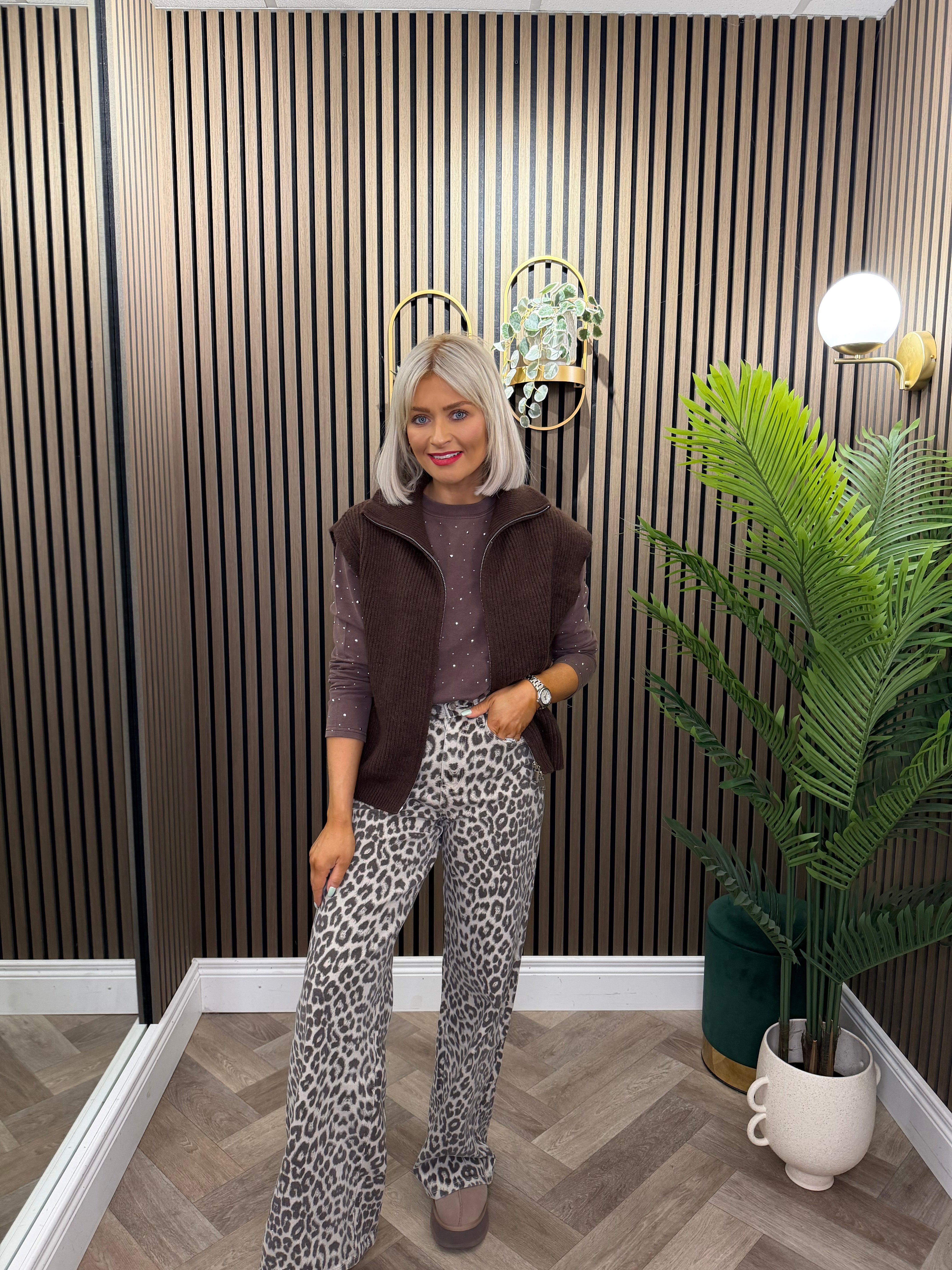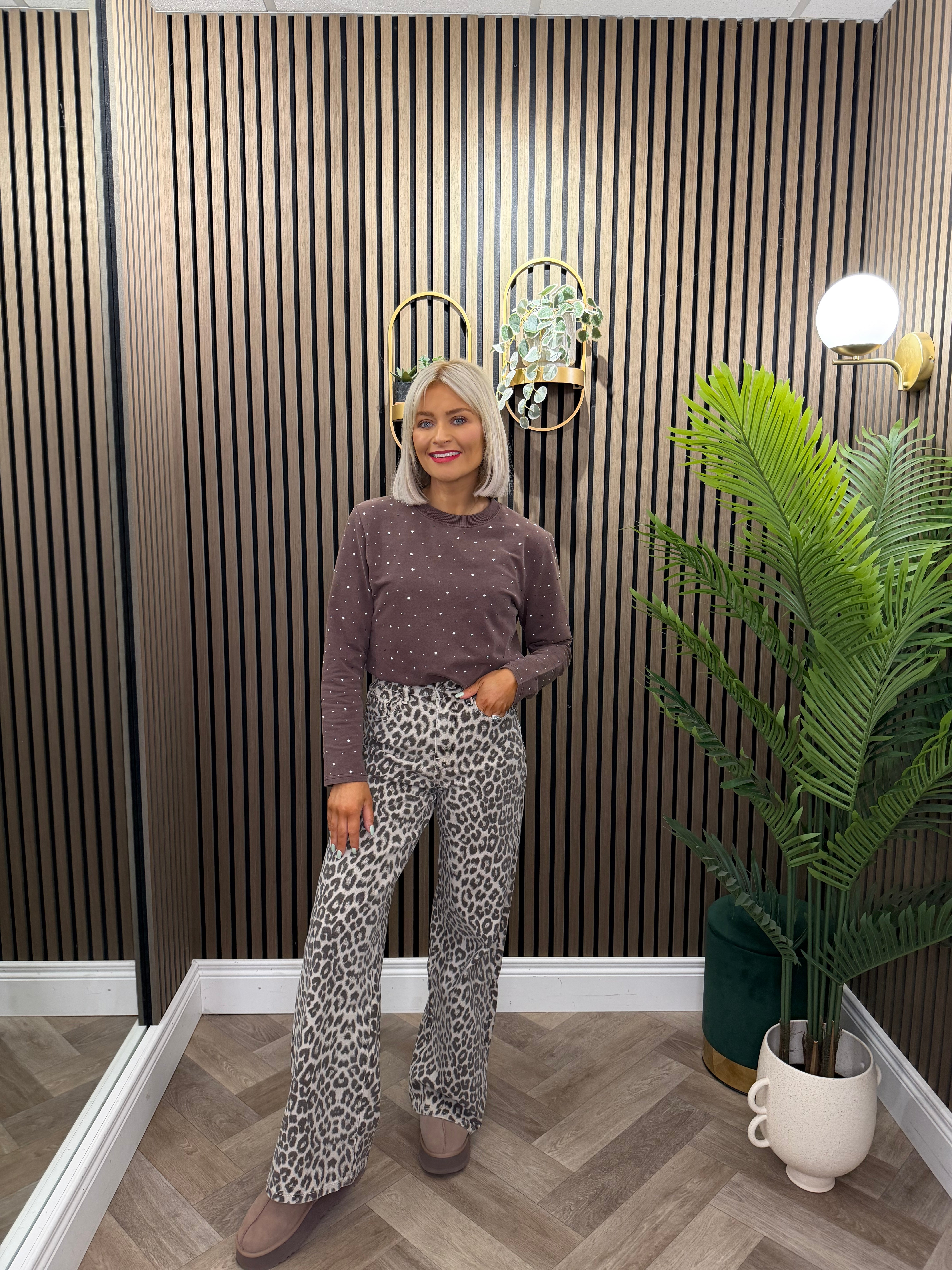 High waisted, wide leg style jeans. Full length, leopard print.