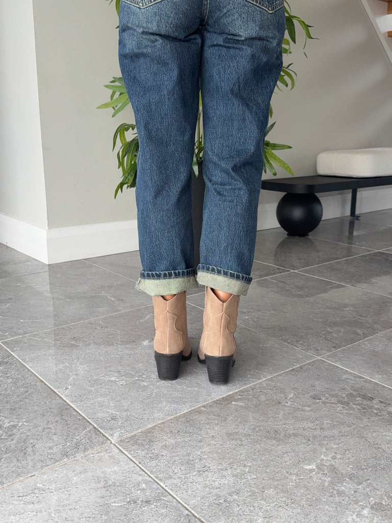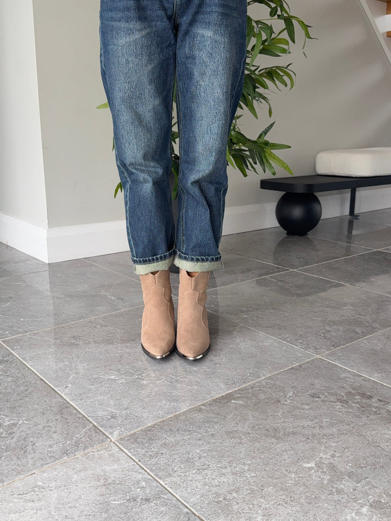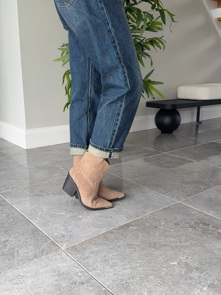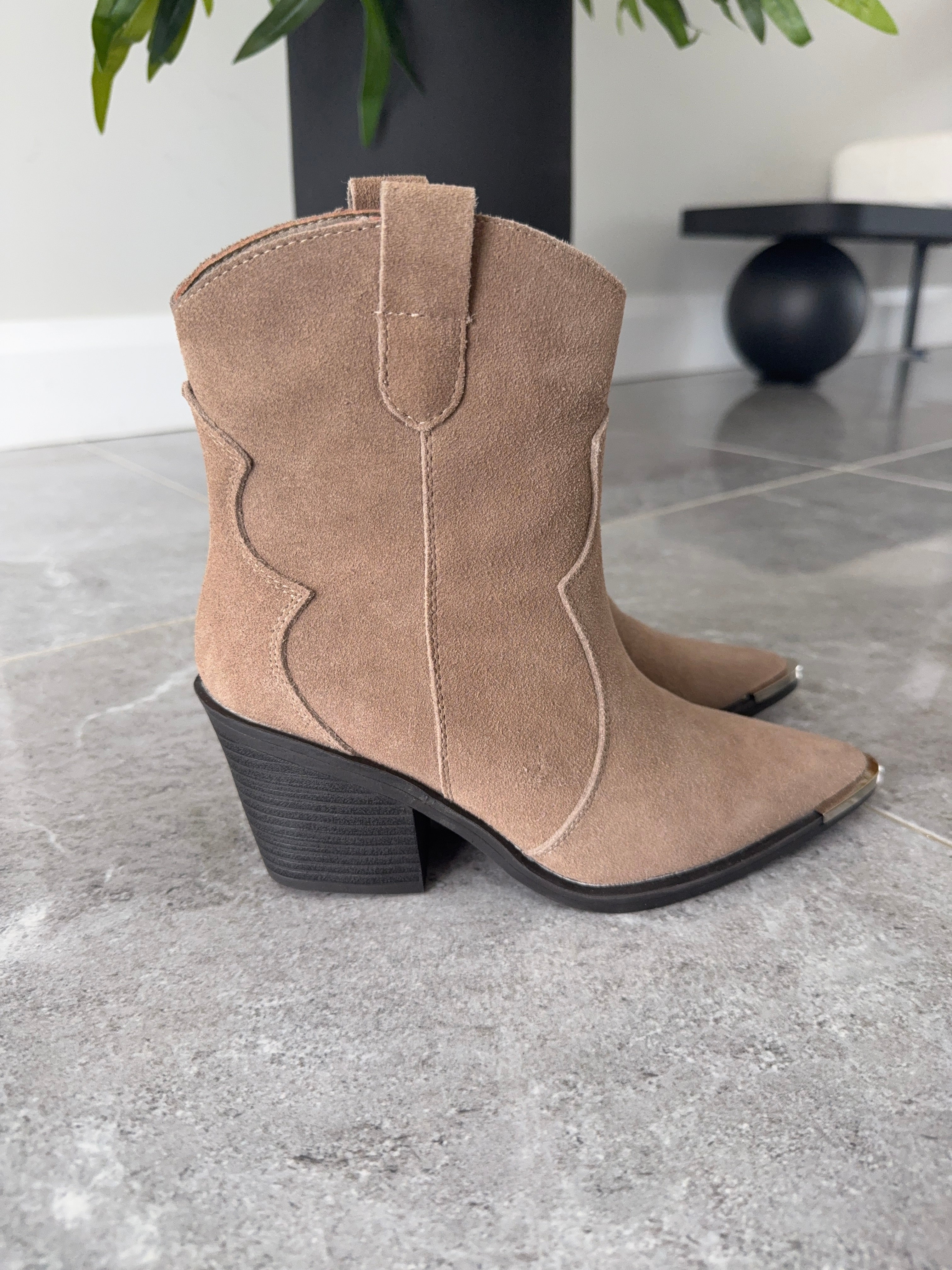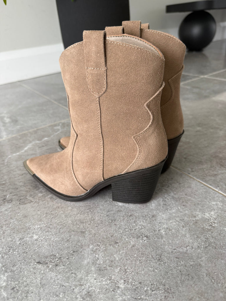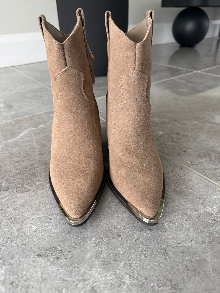 Ankle length taupe coloured western boots. Silver toe detailing, suede boots.