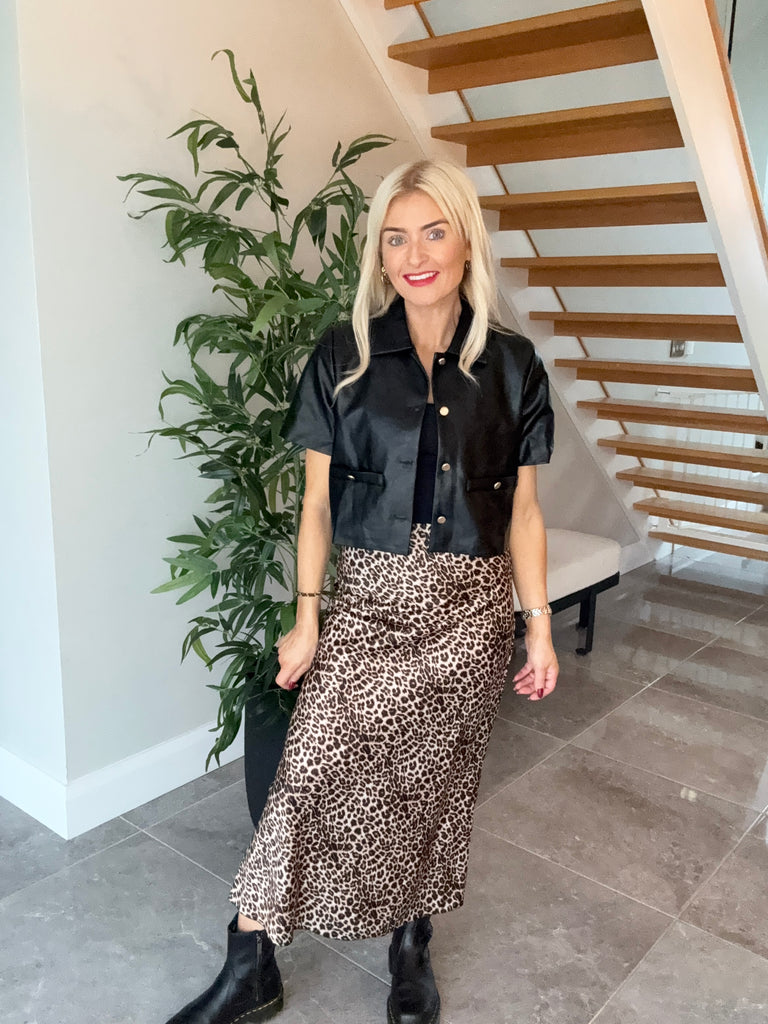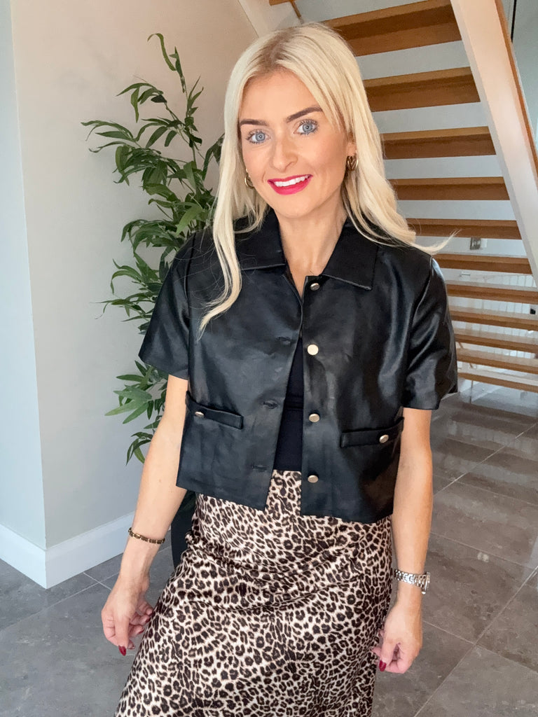 Short sleeve, faux black leather top. Boxy style. Gold button detailing.
