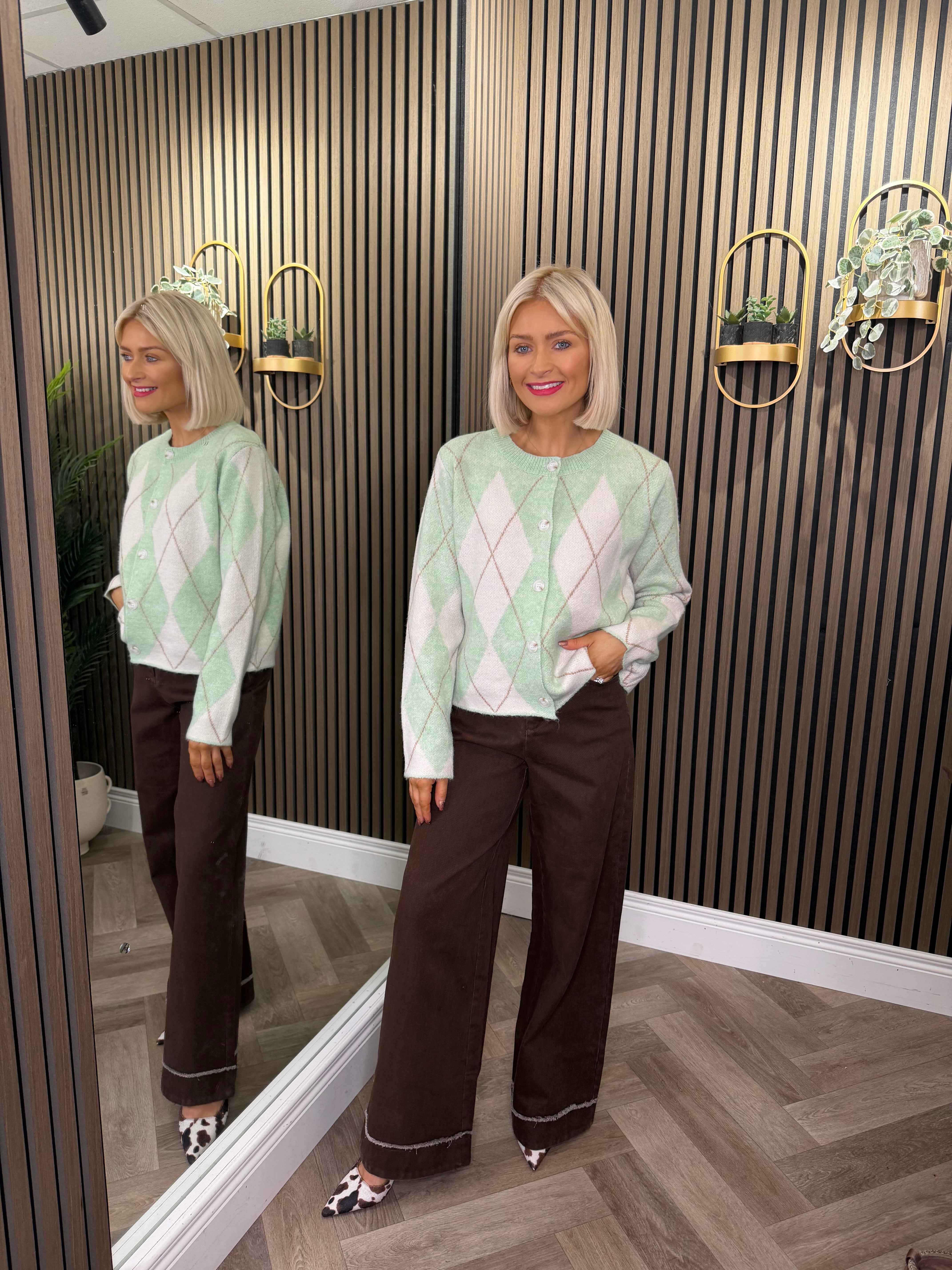 Long sleeve, knit, button up, check print design. Available in more colour ways.