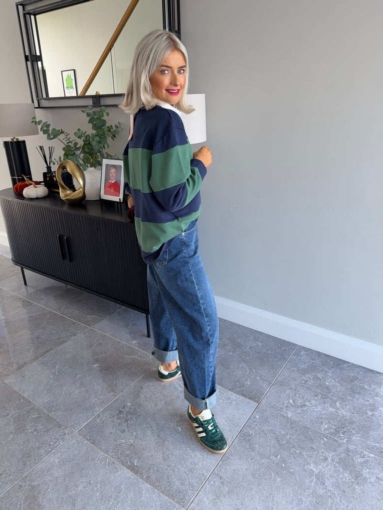 High waisted, full length, barrel style medium denim wash jeans.