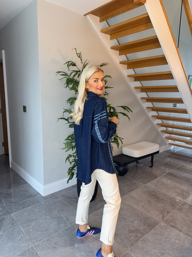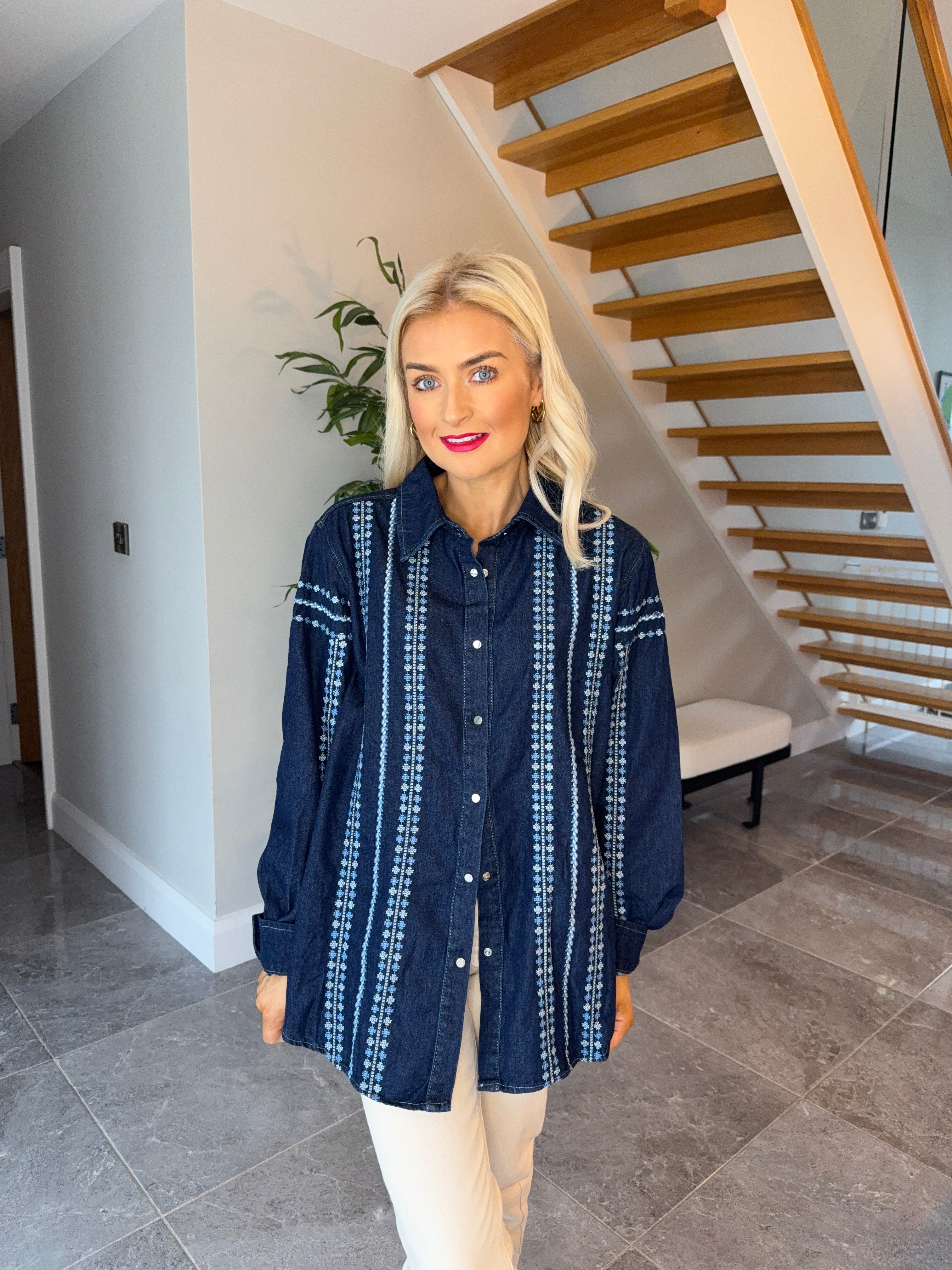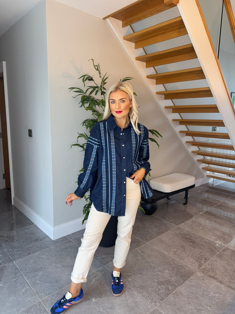 Long sleeve, relaxed fit, medium denim wash shirt. Button up. Flower embroidery detailing.