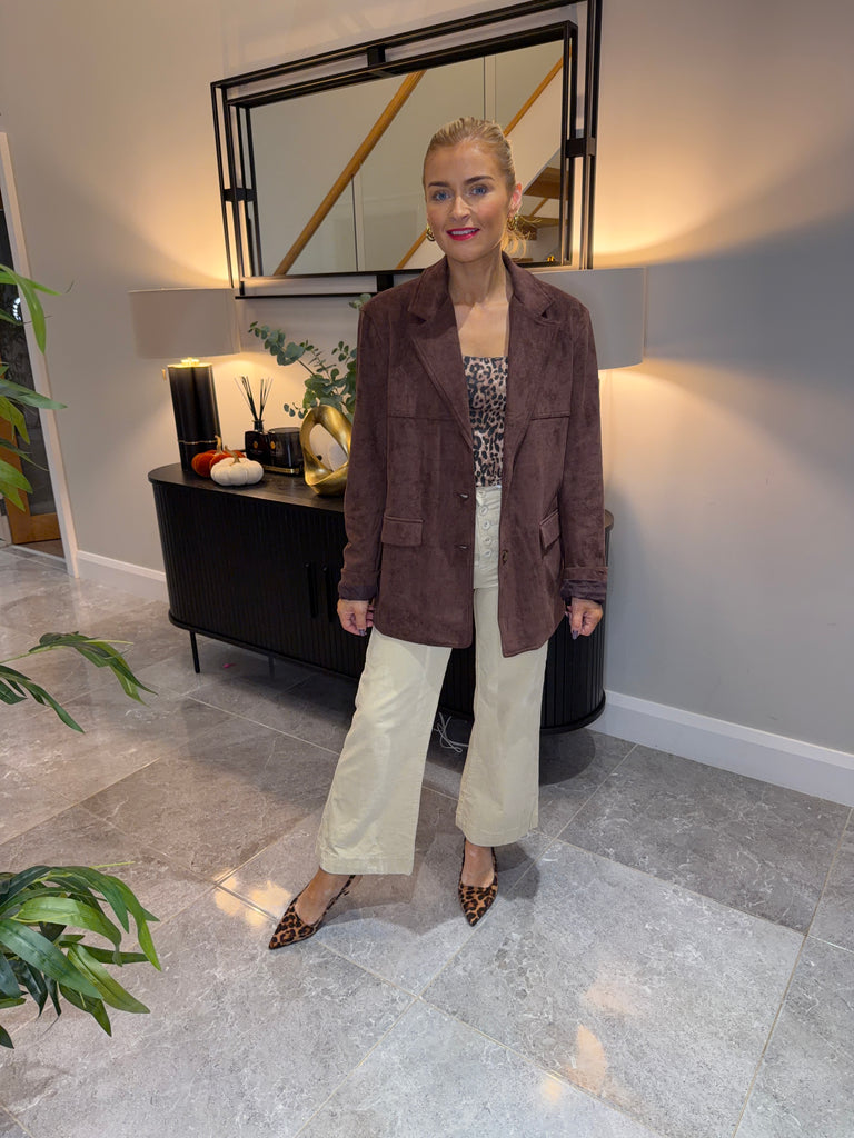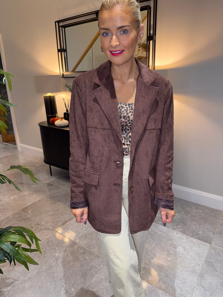 Long sleeve, relaxed fit style blazer. Suede fabric. Matching skirt available.