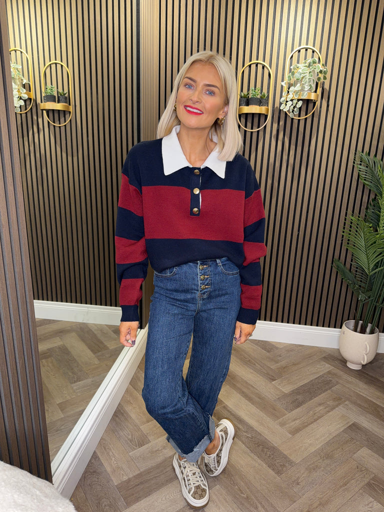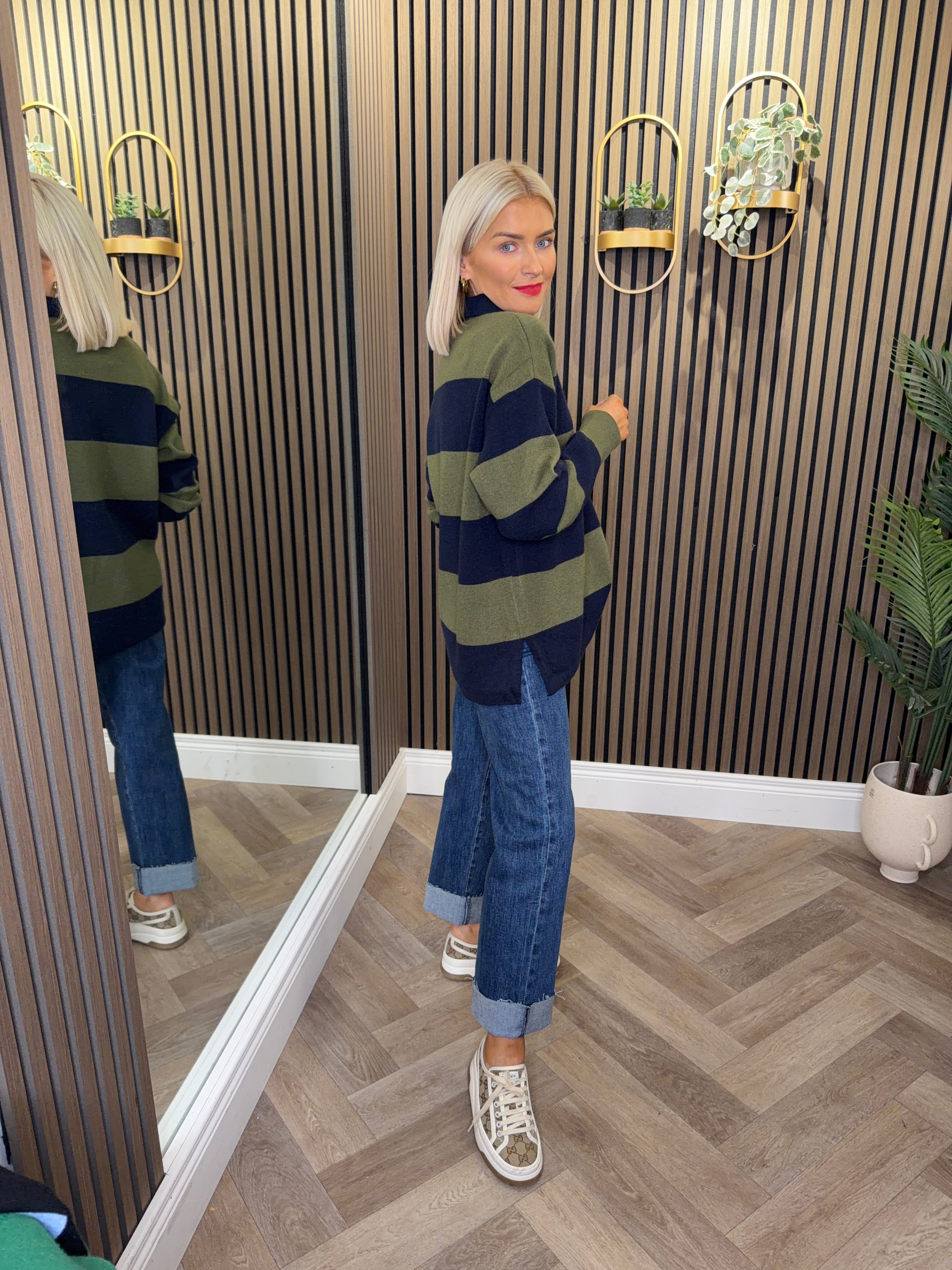 High waisted, straight leg, raw hem jeans. Denim shade. 4 gold button detailing.