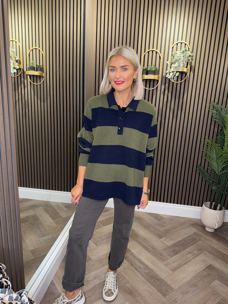 Long sleeve, knit rugby style jumper. Stripe print and collar detailing.