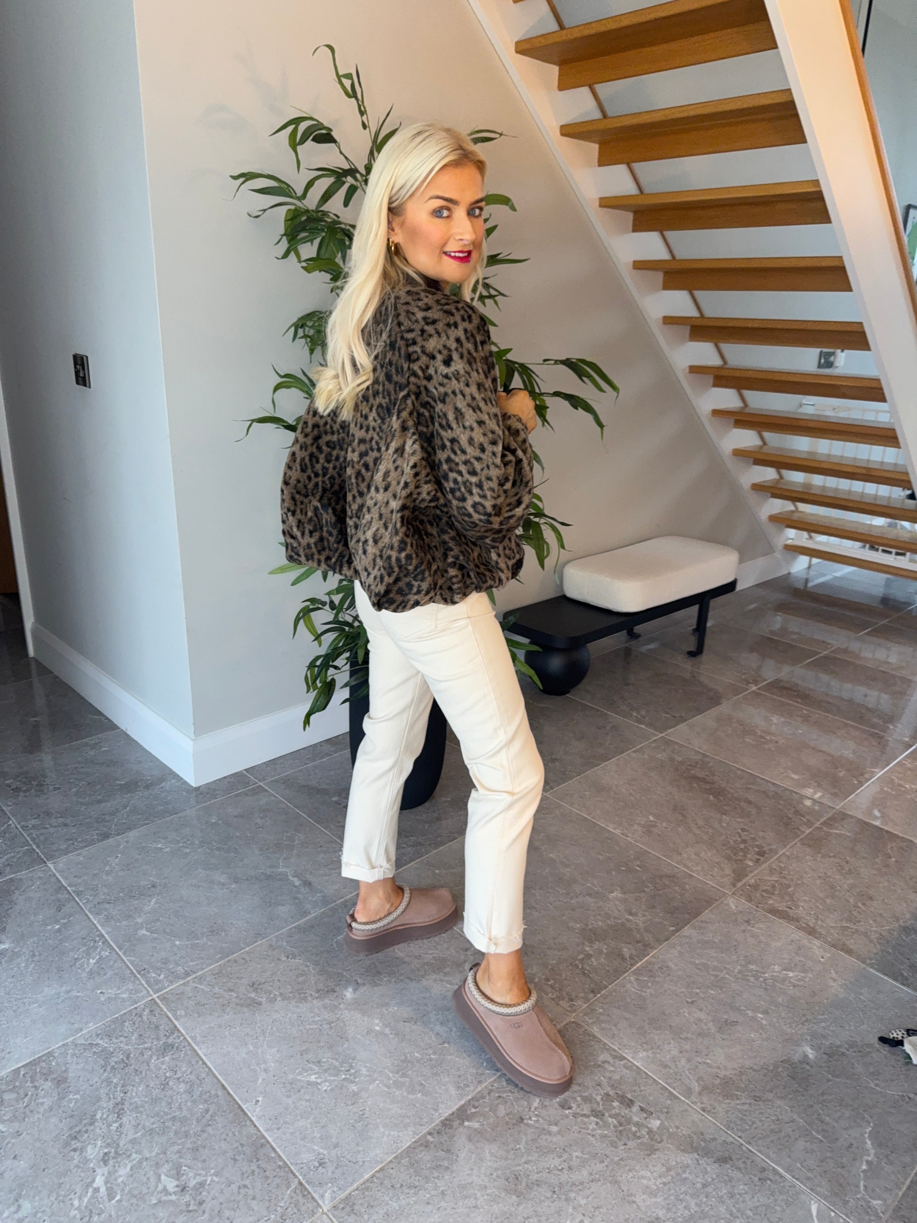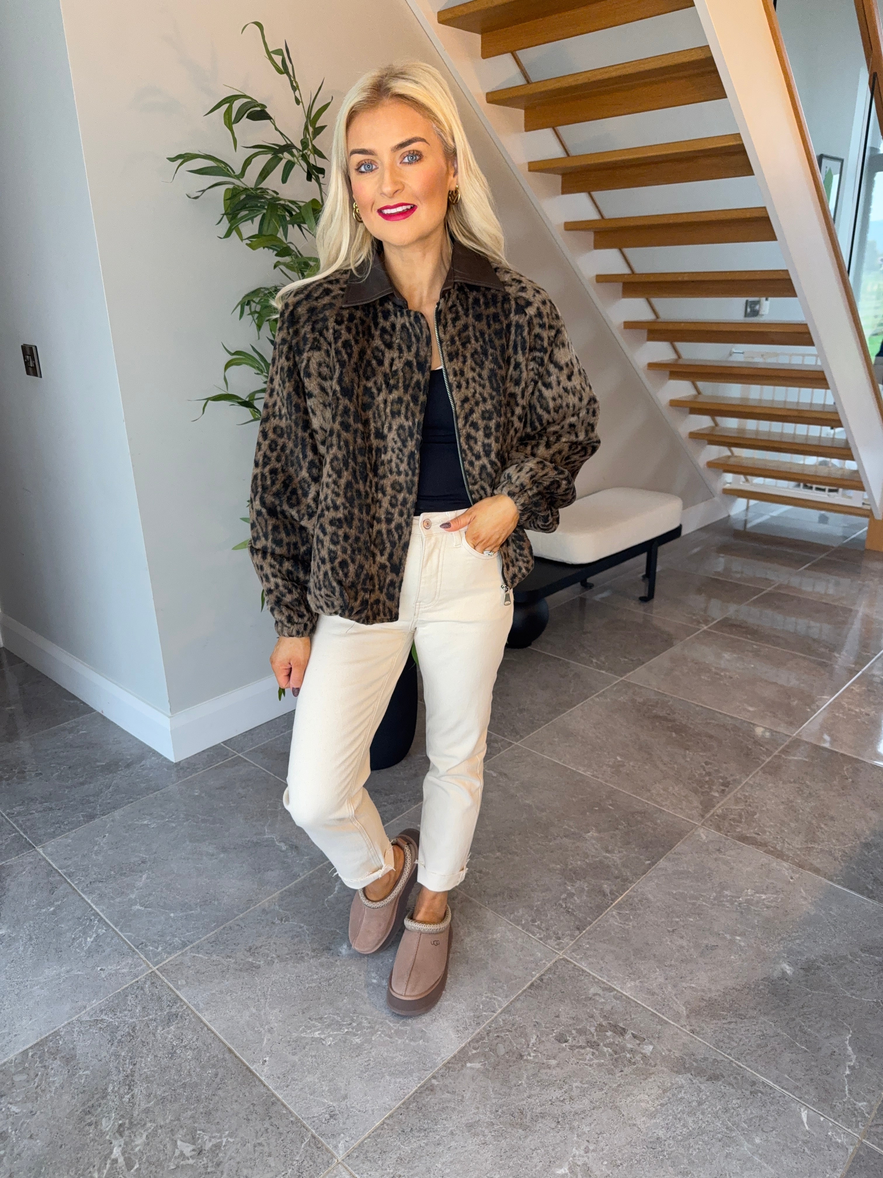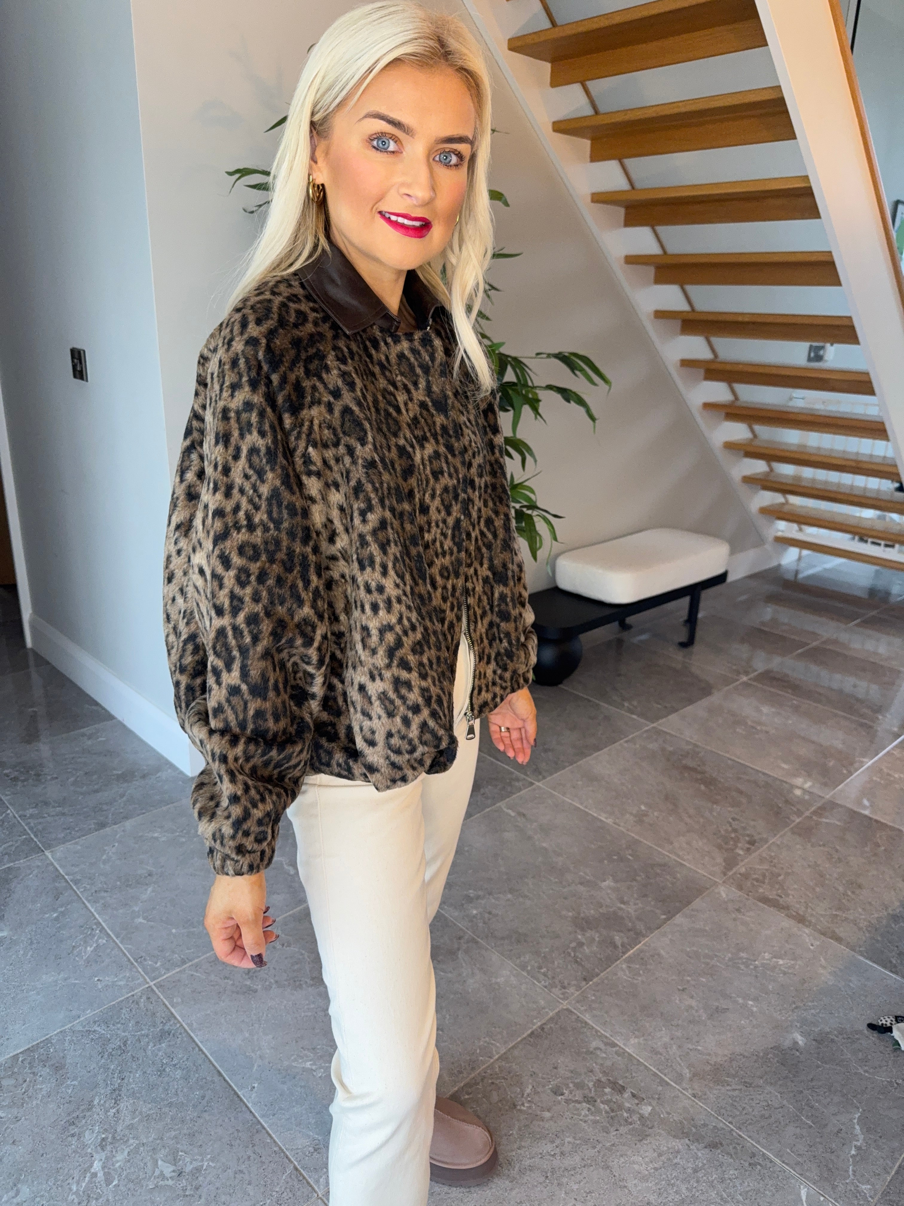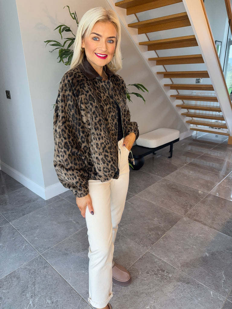 Long sleeve, faux fur leopard print style bomber jacket. Faux leather collar and zip up.