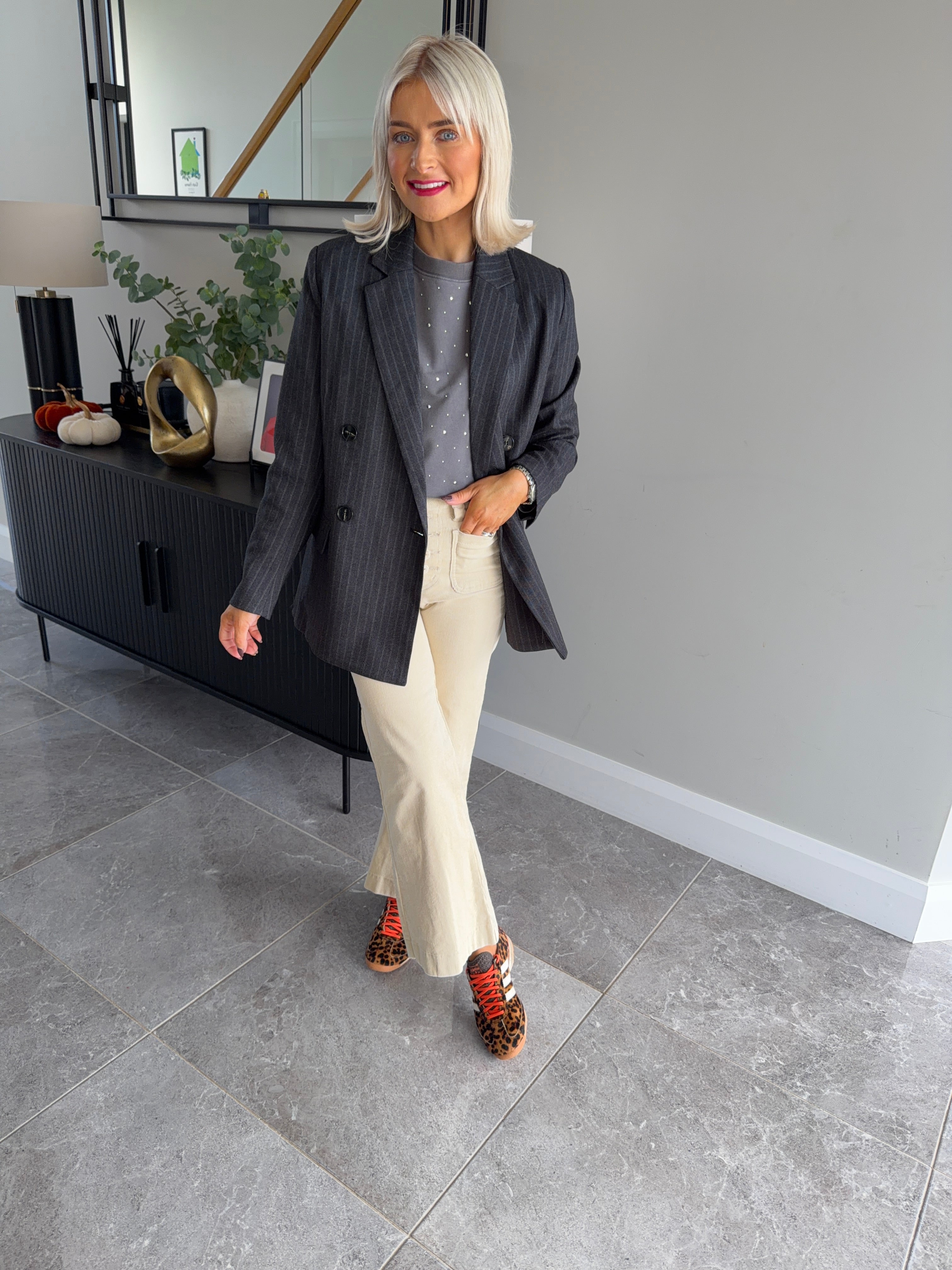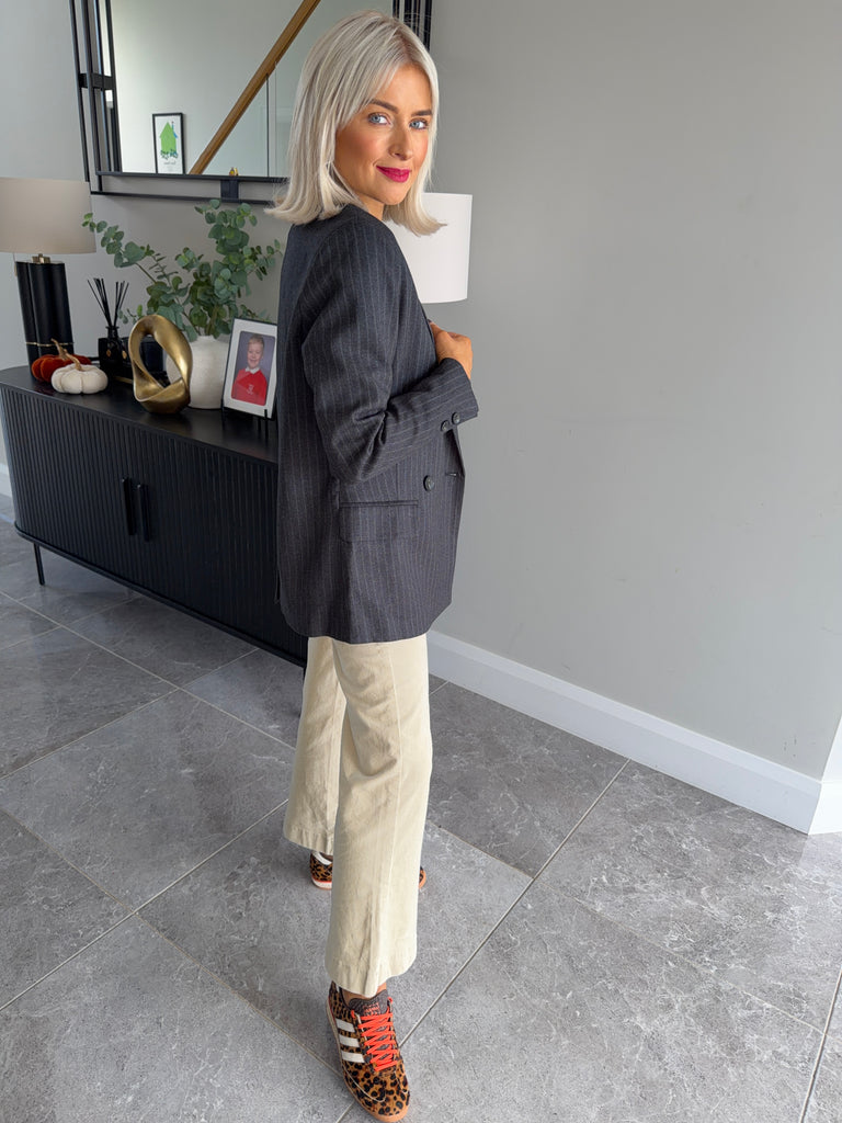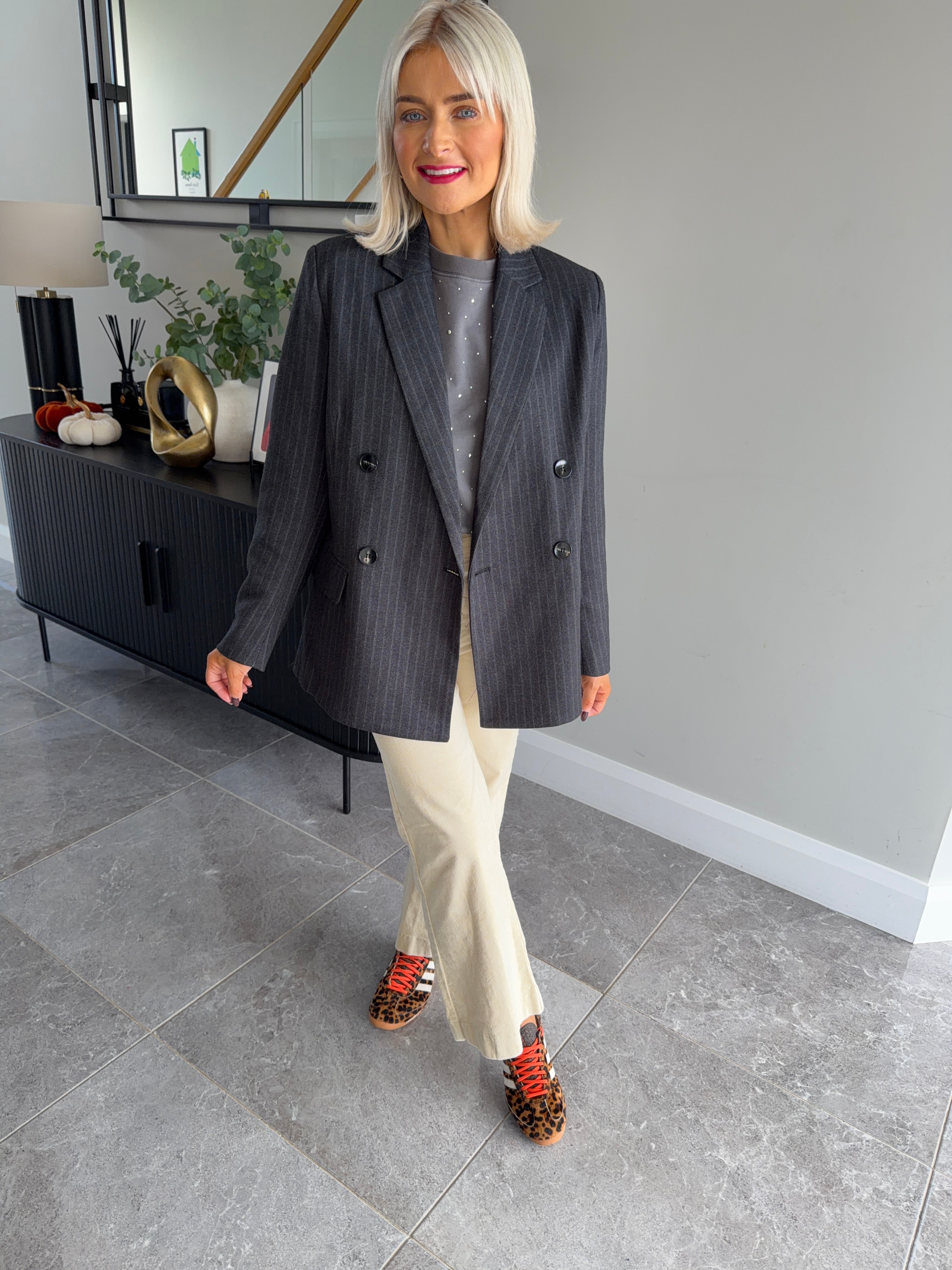 Long sleeve, regular fit blazer. Wool fabric with a stripe print detail.