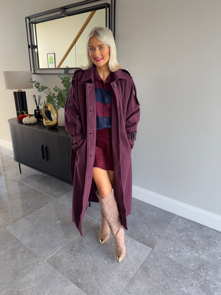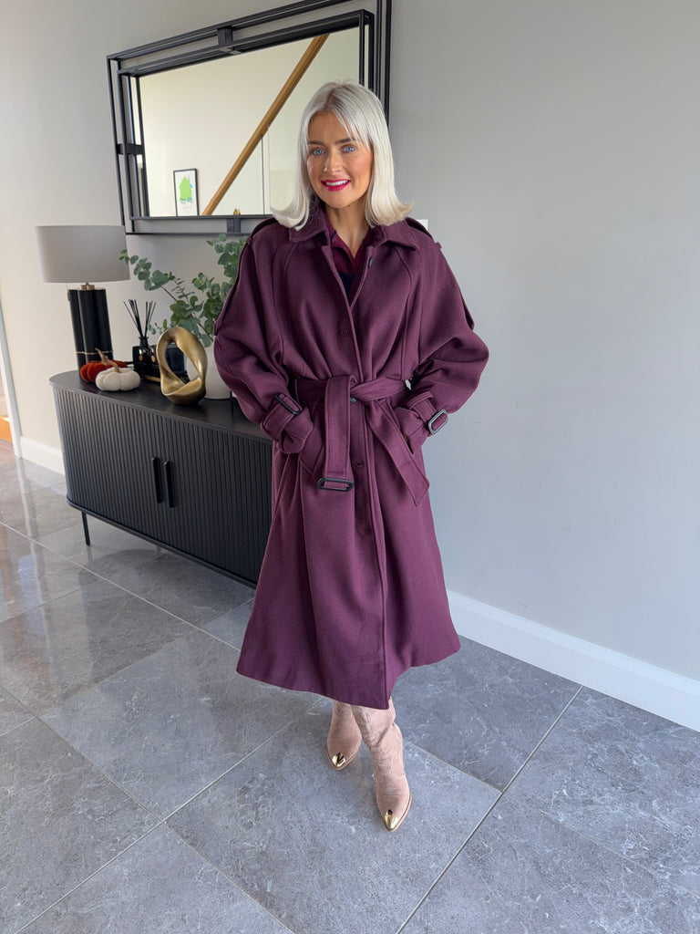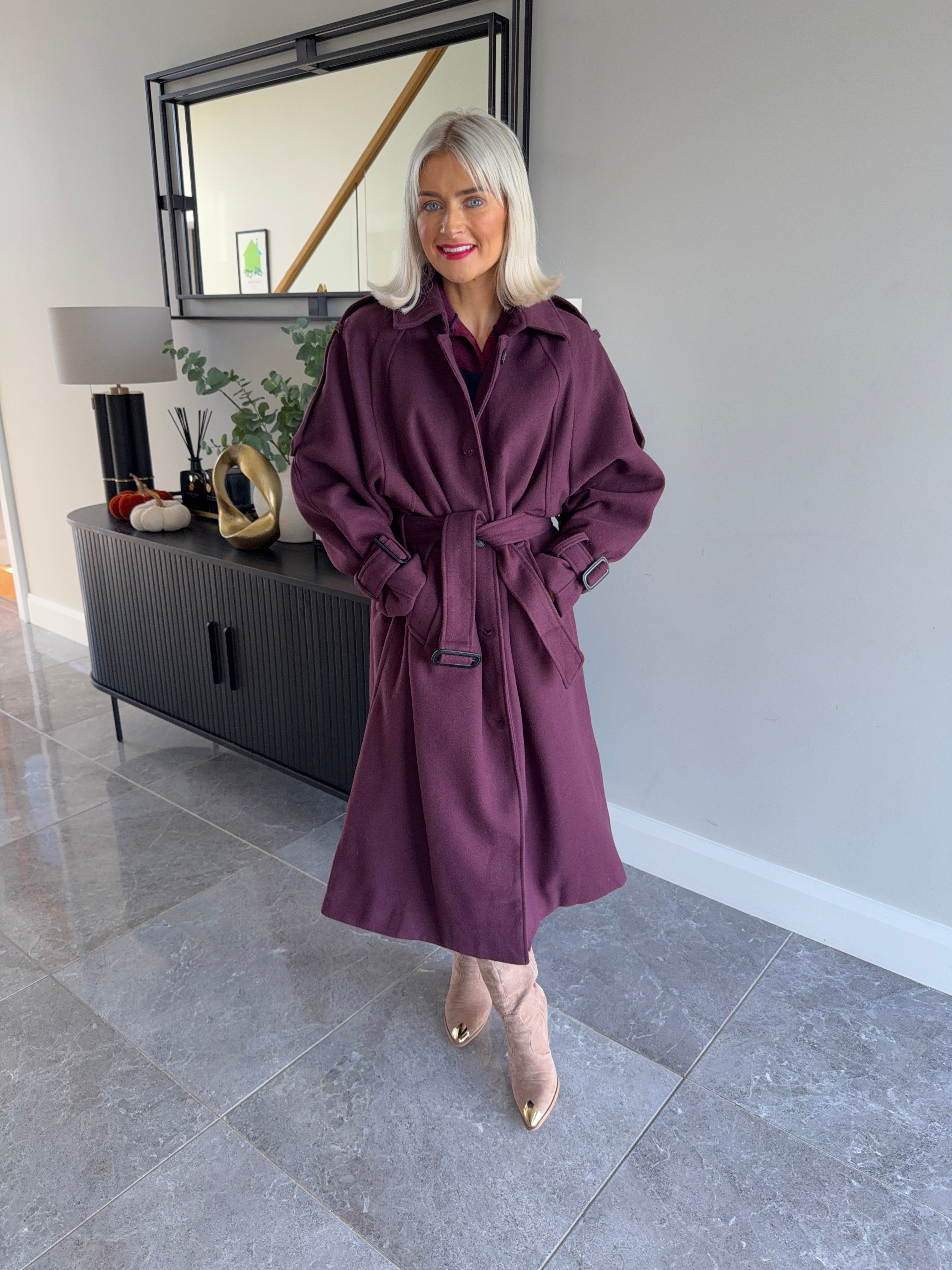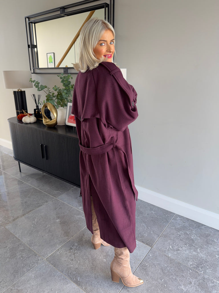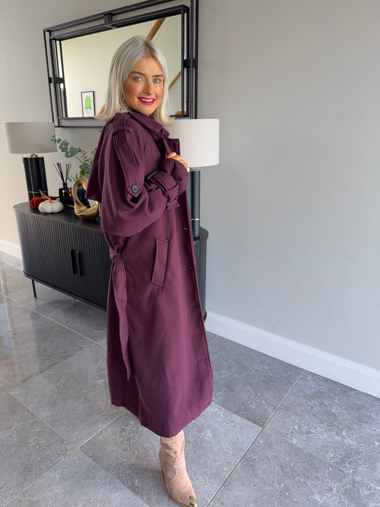 Longline, heavy wool style coat. Button up with tie belt detailing. Side pockets. Relaxed fit. Available in more colours.
