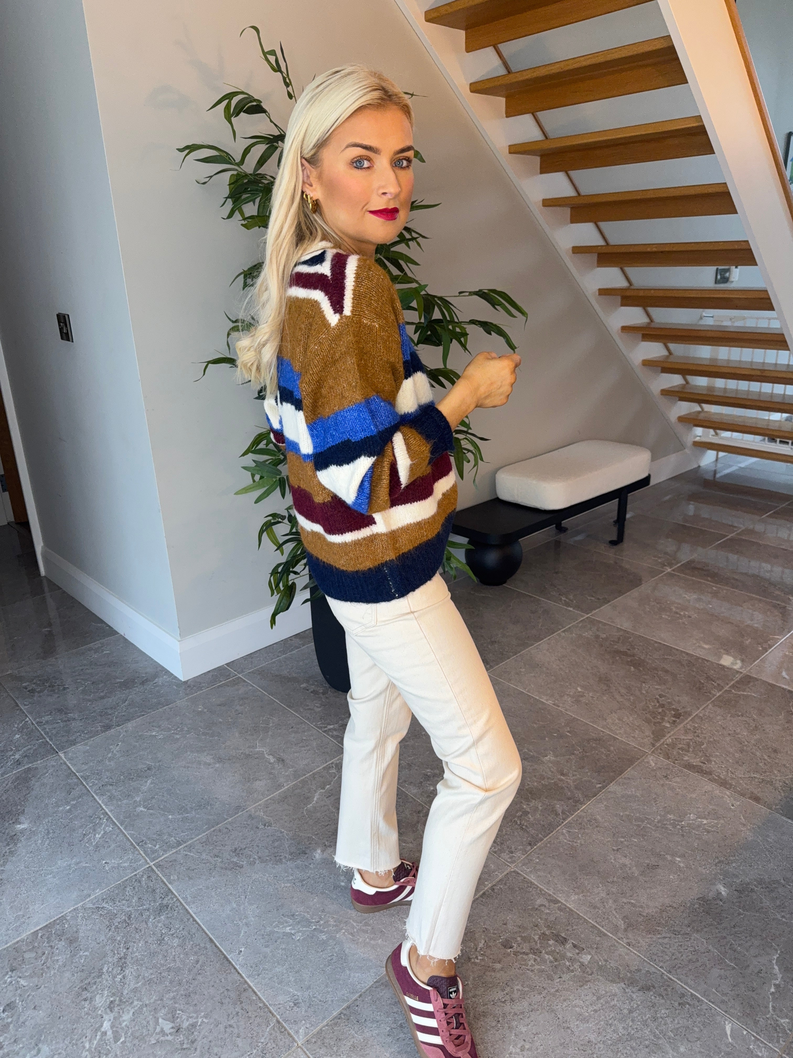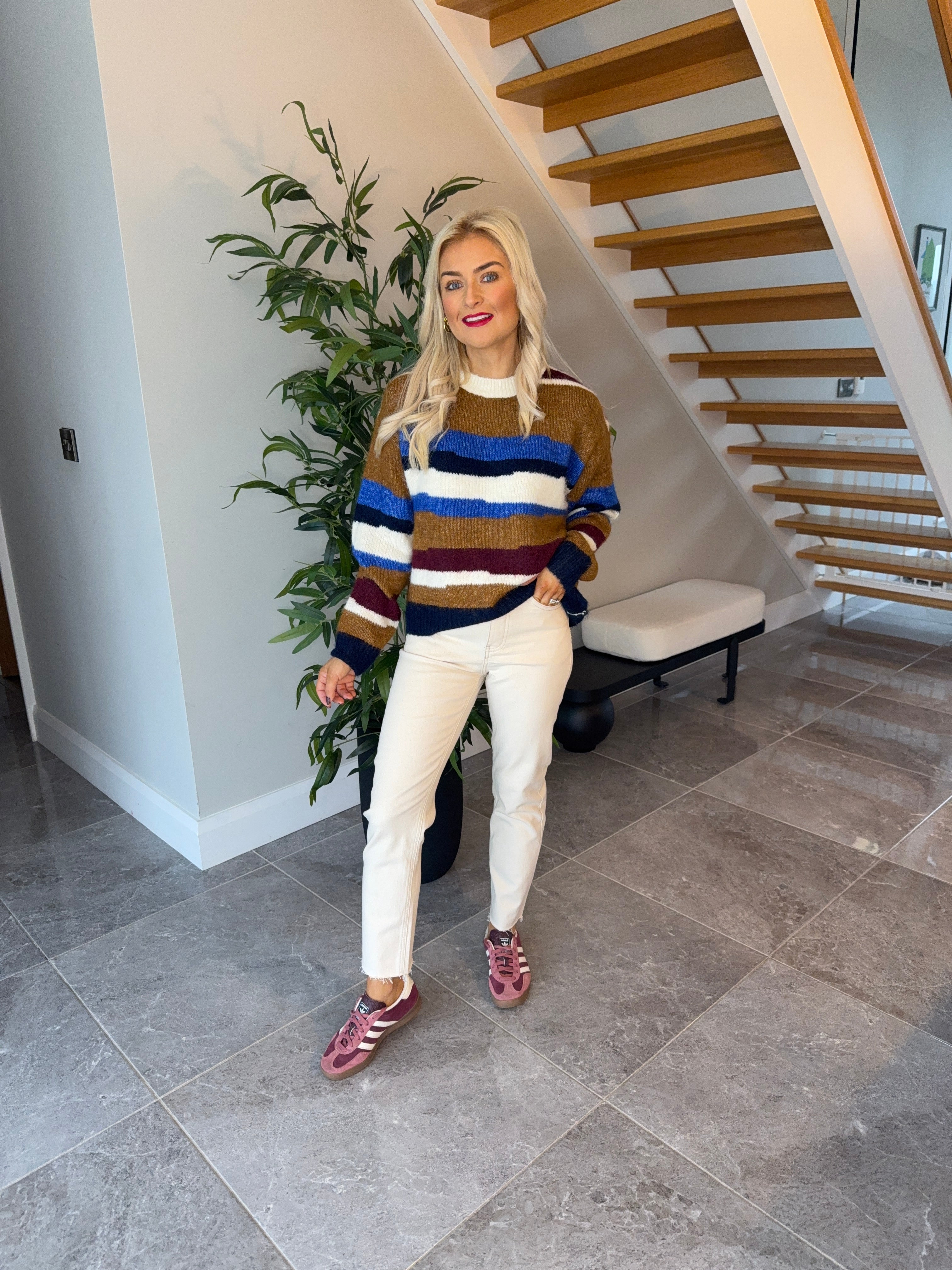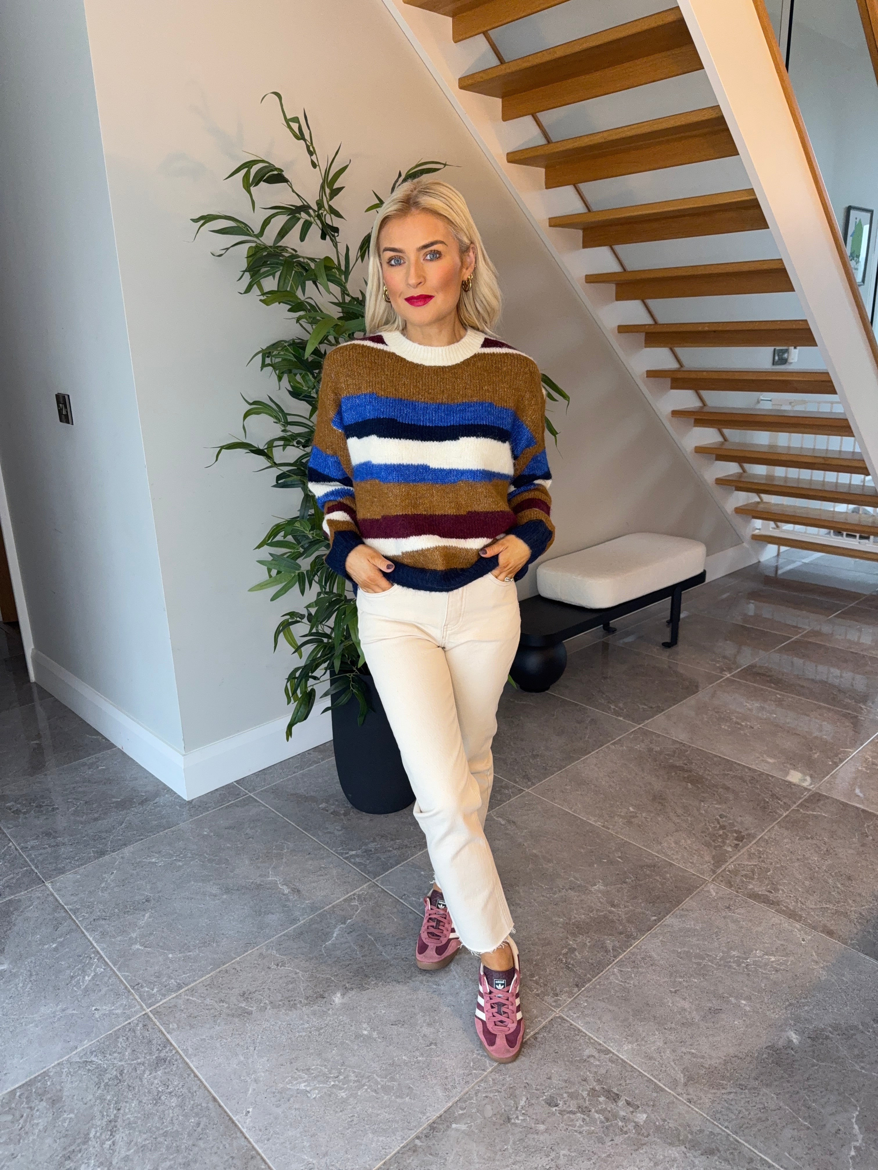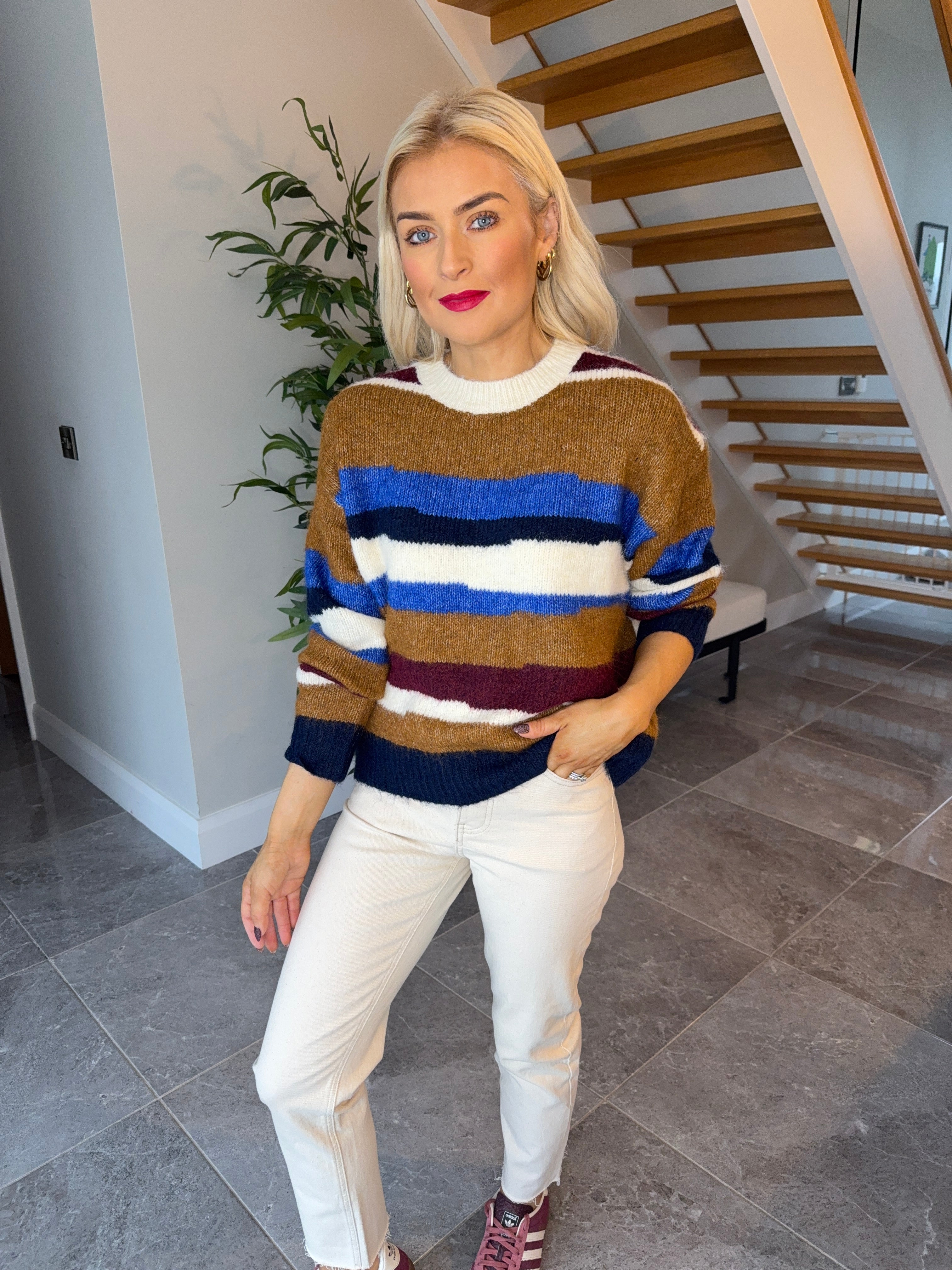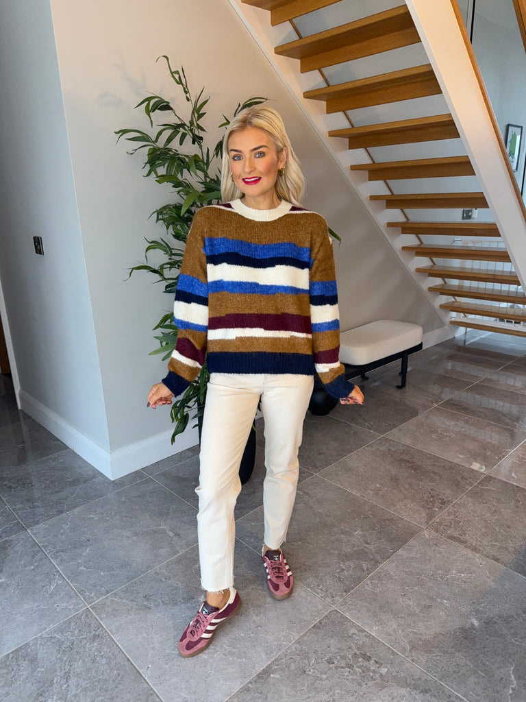 Long sleeve, round neckline, knit style jumper. Stripe print of blue, navy, burgundy, cream and tan.