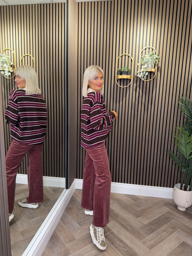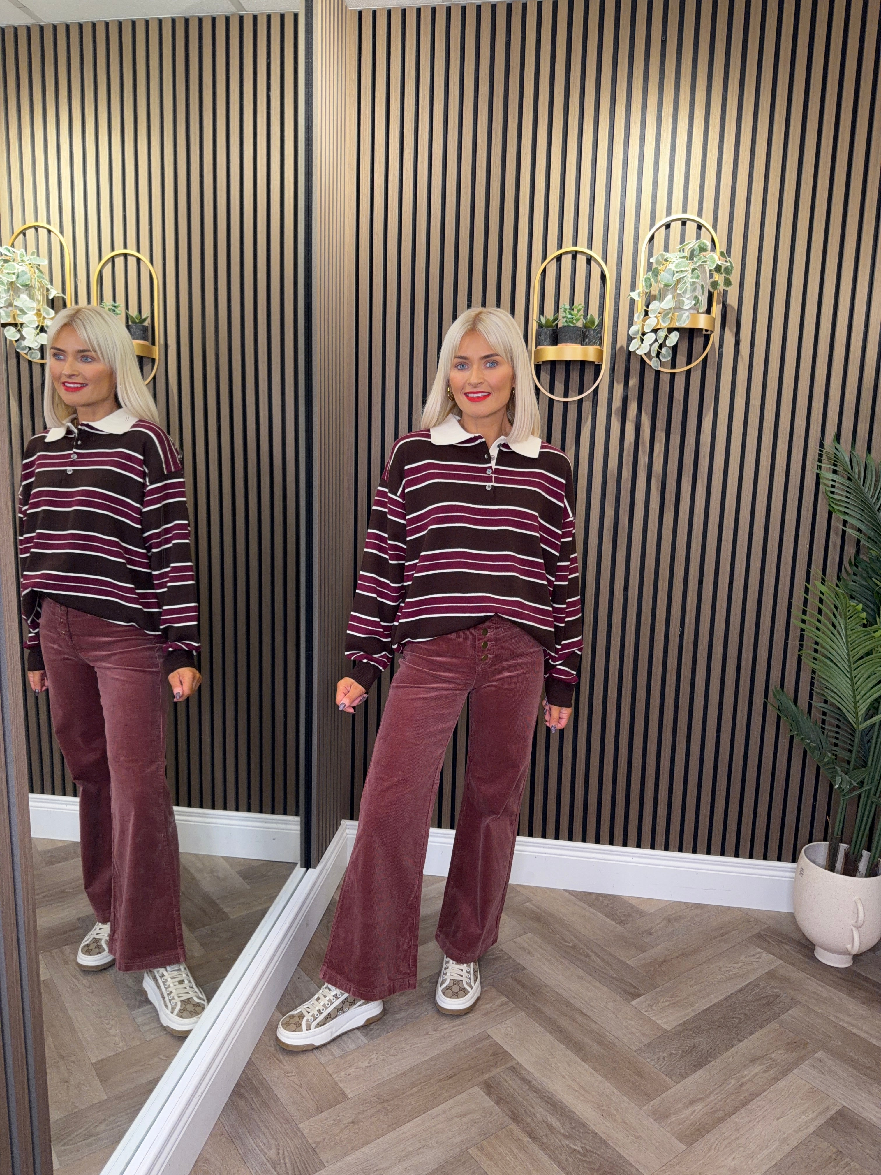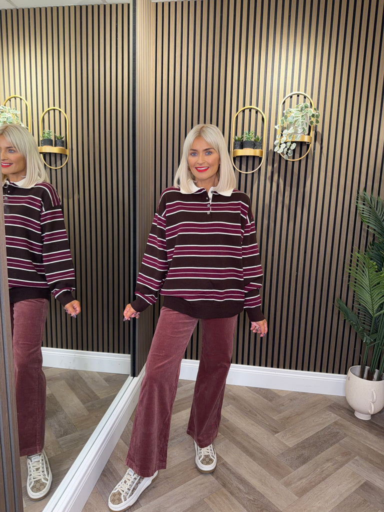 Long sleeve, collar detailing with 3/4 buttons. Stripe print. Knit jumper.