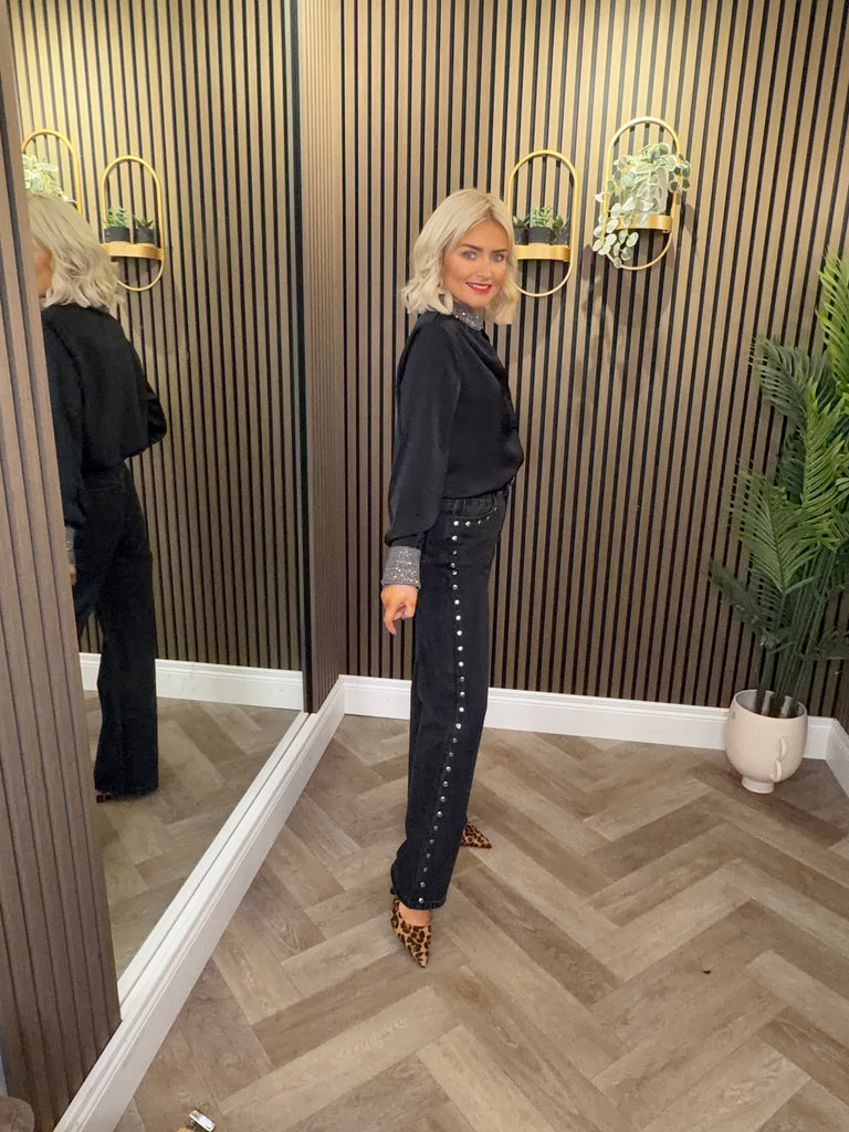 High waisted, full length, wide leg style jeans. Washed black with stud detailing down the leg.