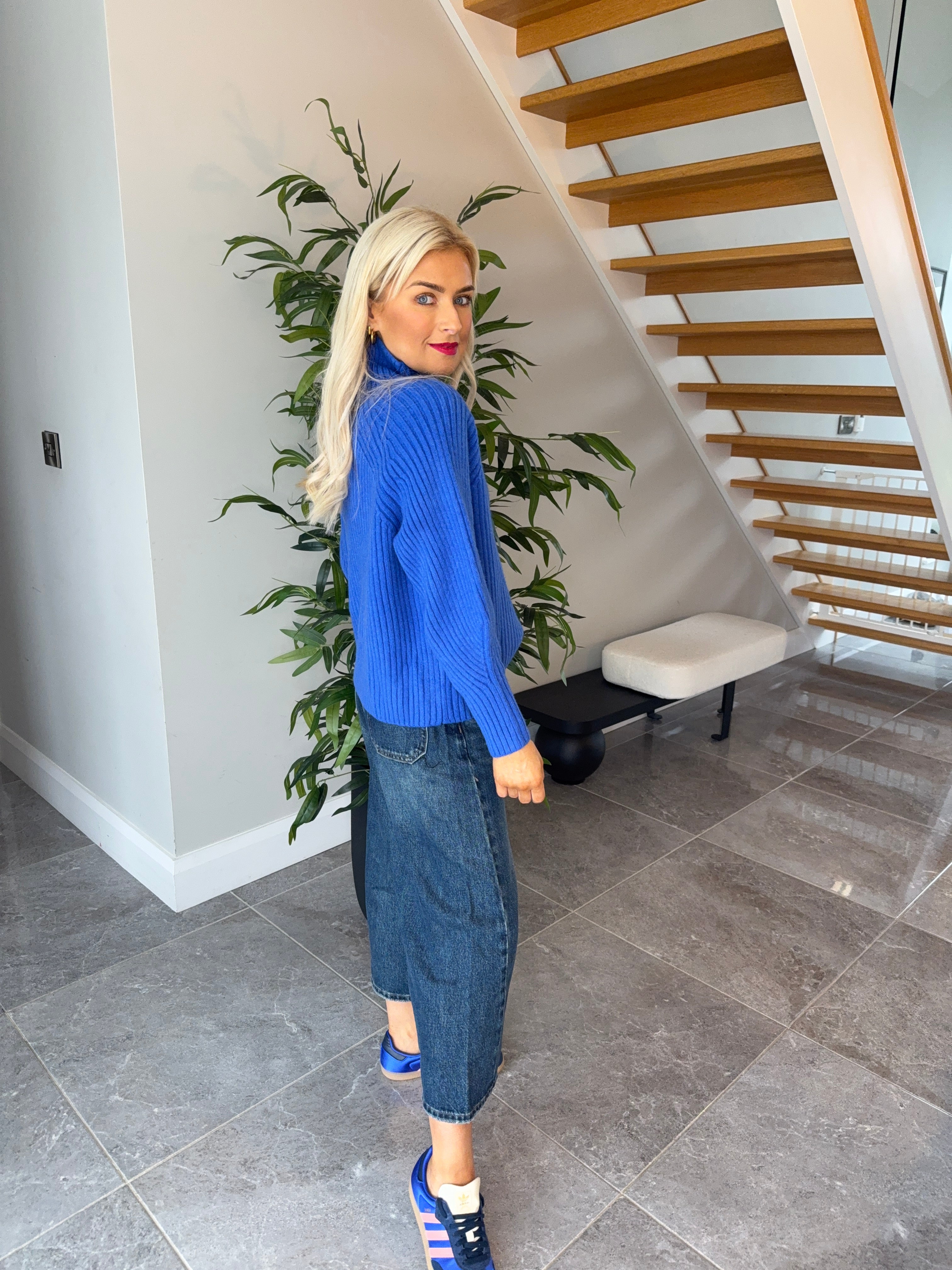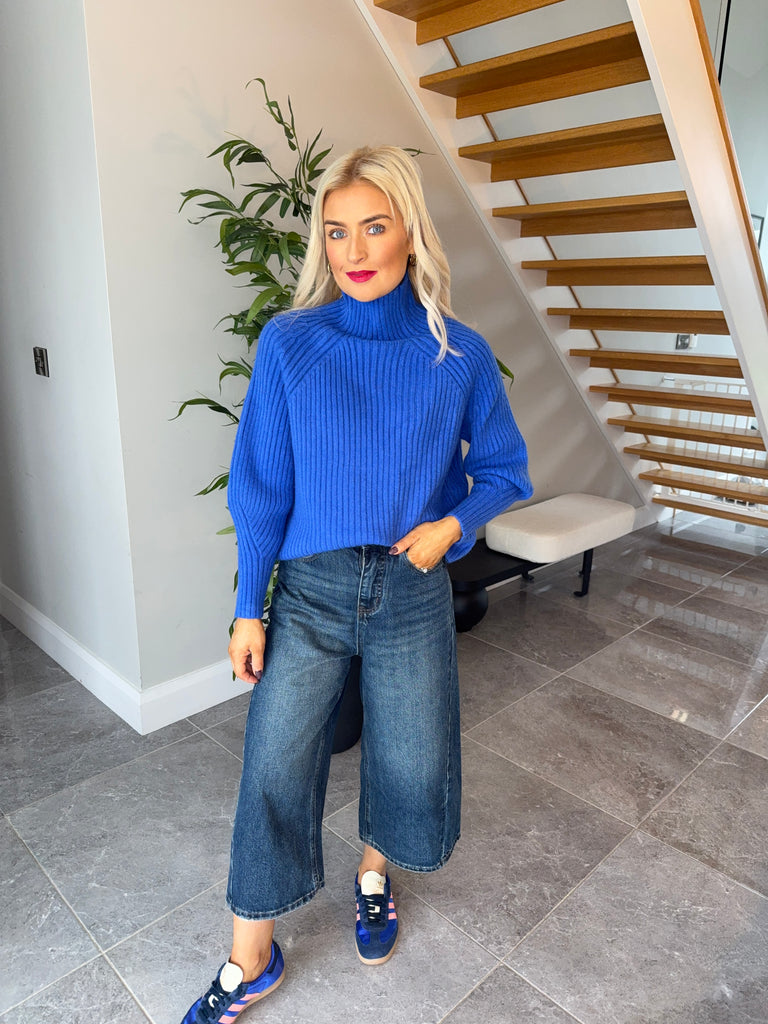 High neckline, long sleeve, relaxed fit knitted jumper. Available in more colours.