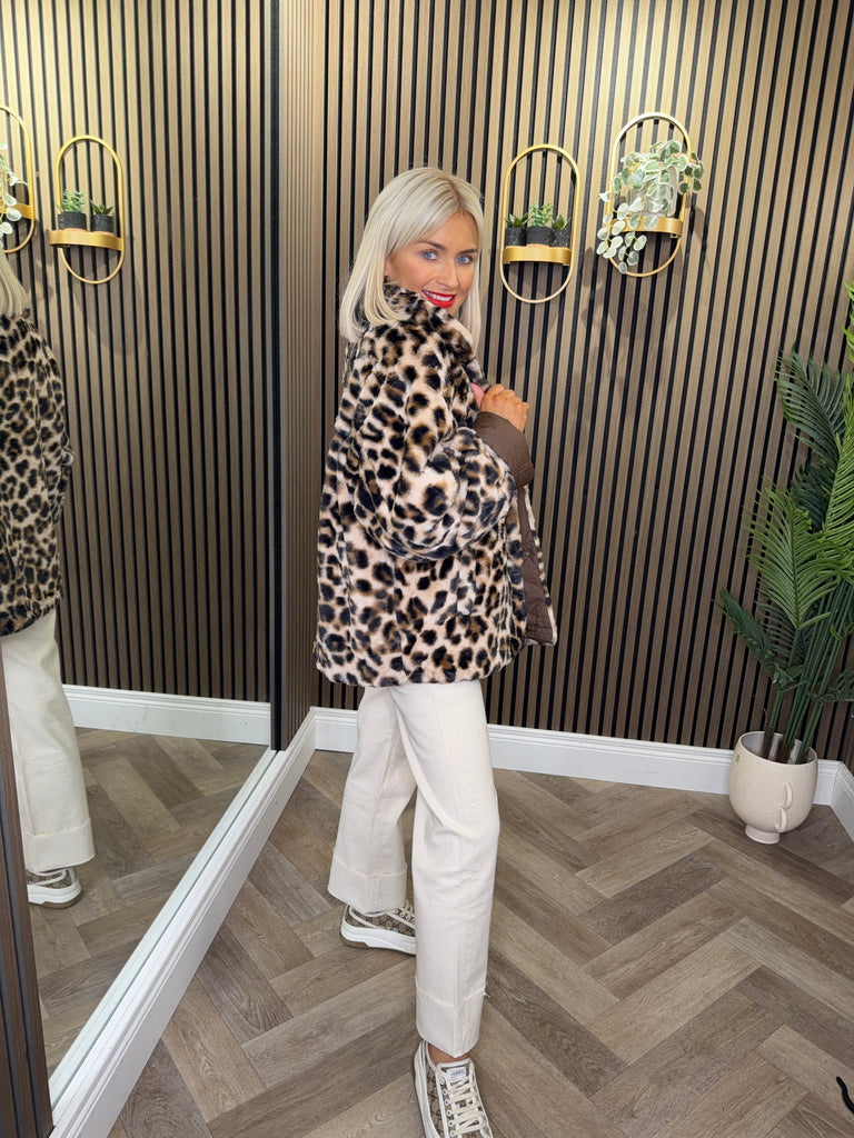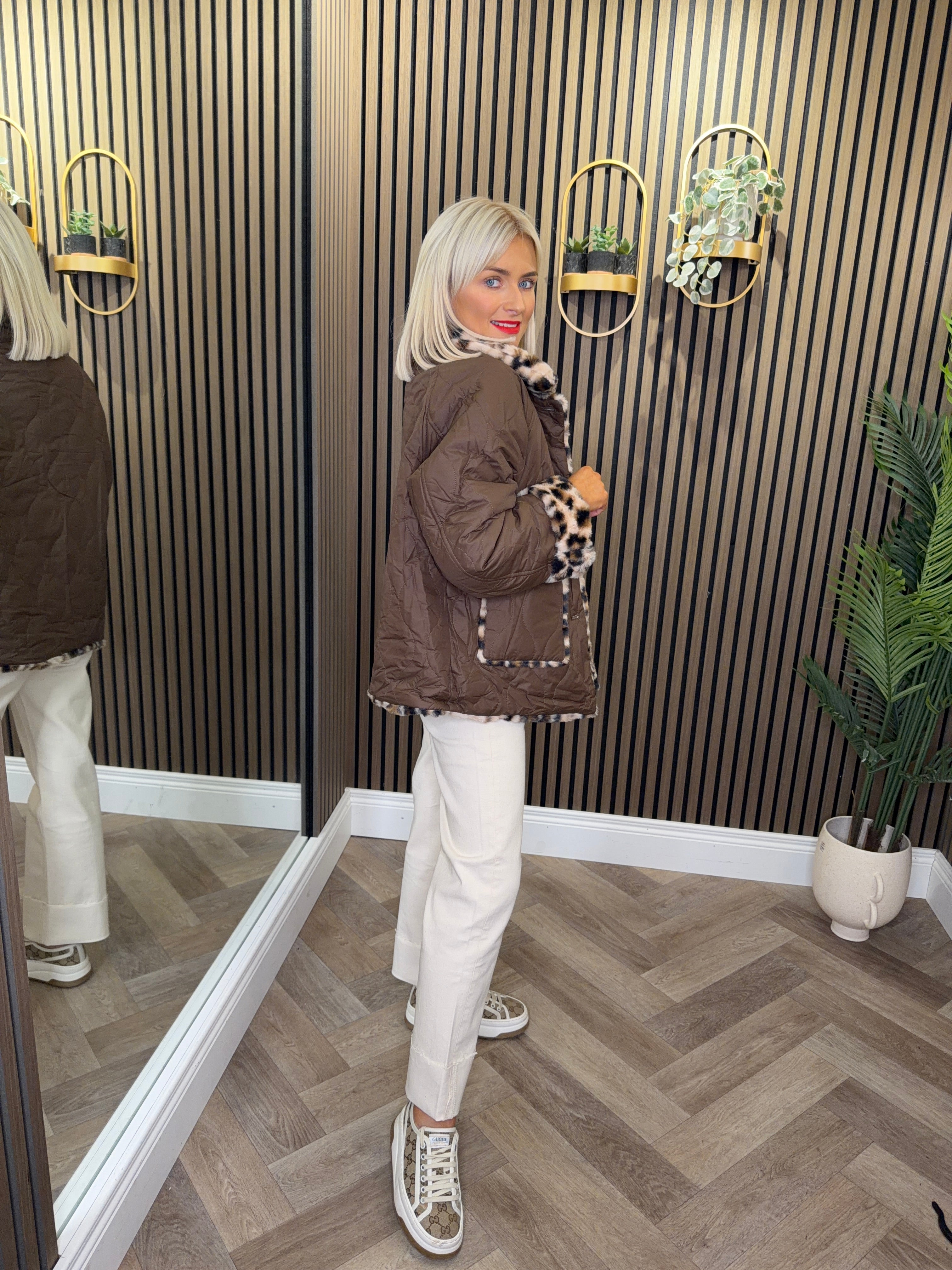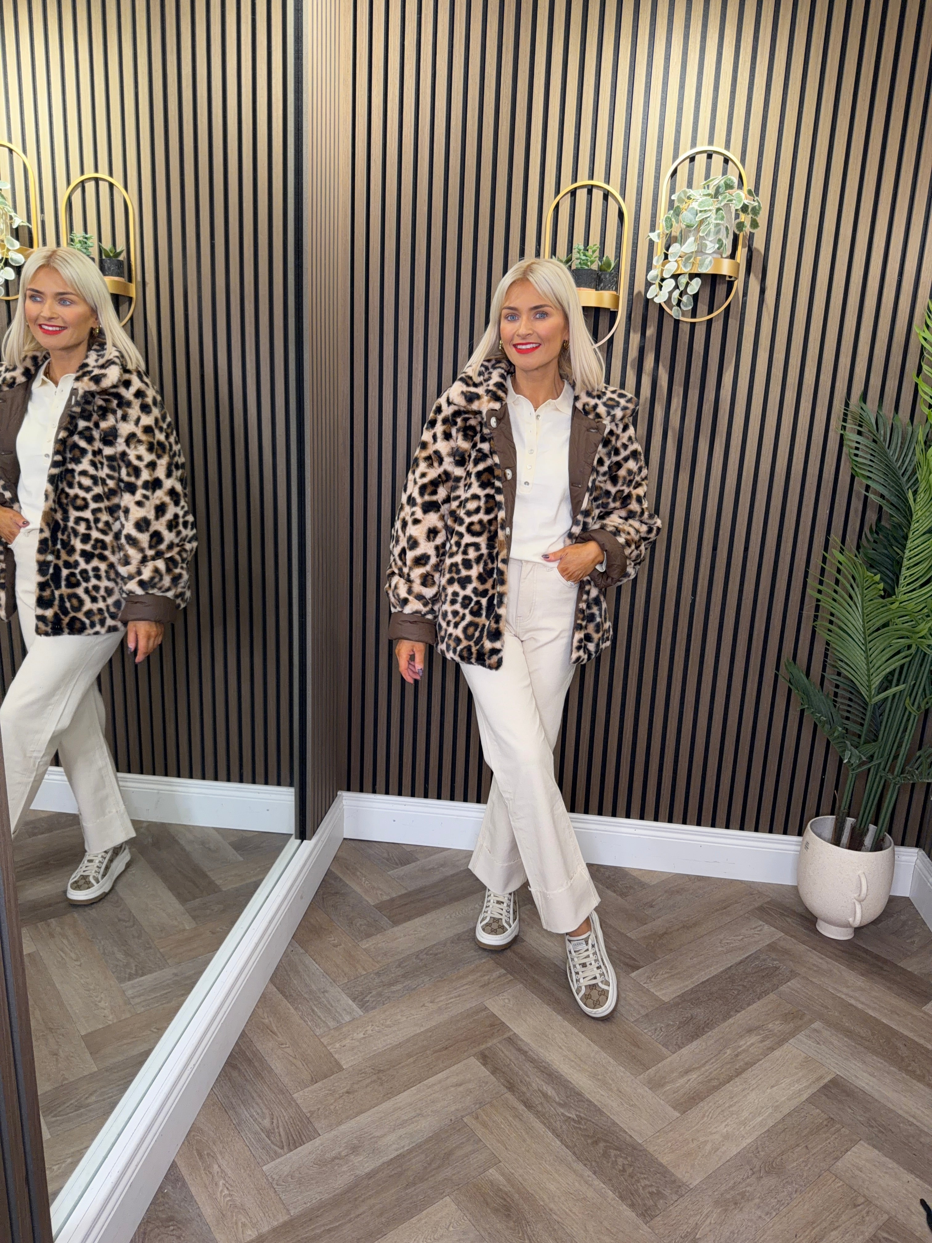 Long sleeve, relaxed fit, quilted style. Button up. Lightly quilted. Faux Fur leopard detailing. Reversible and available in more colours.